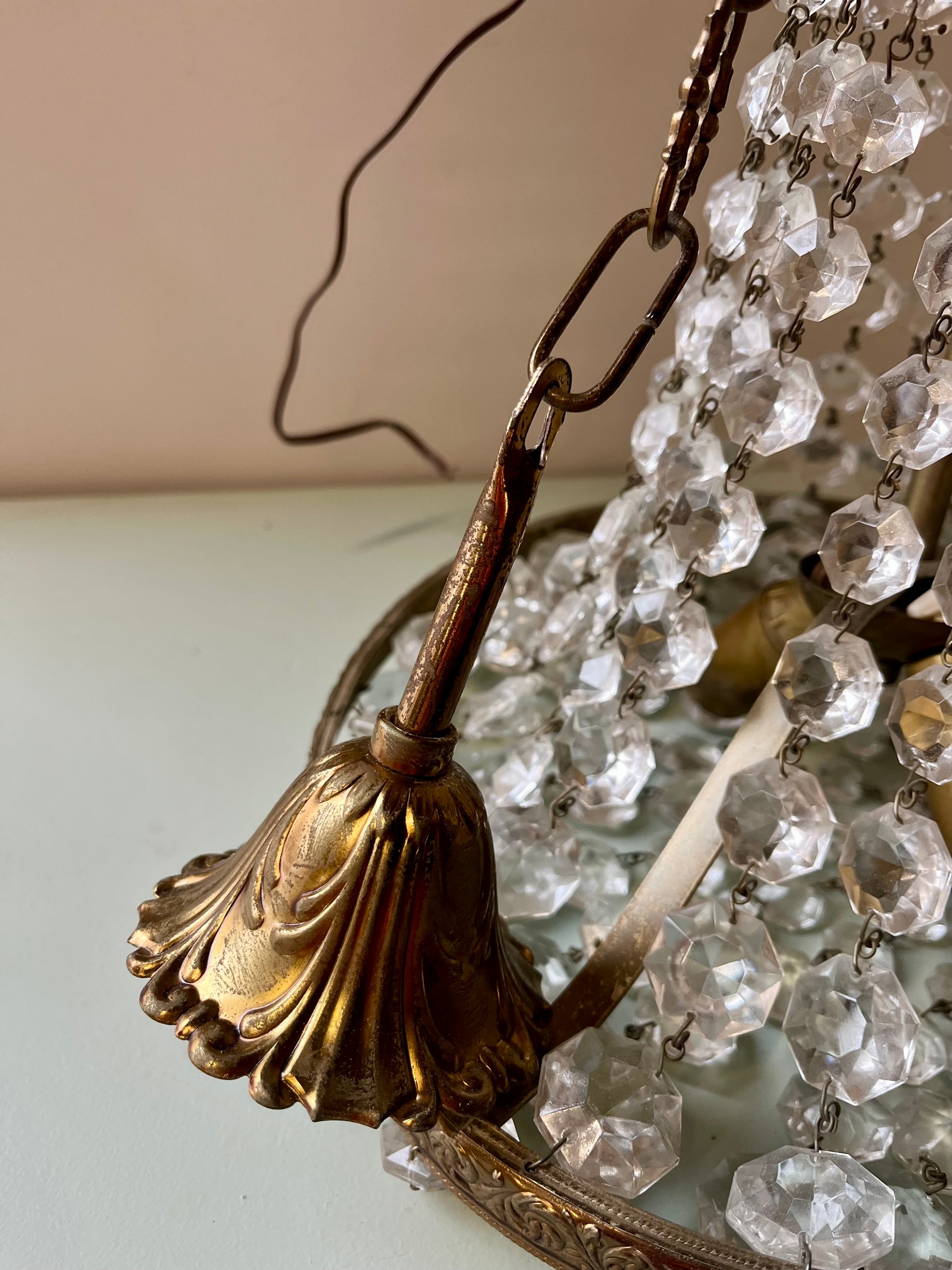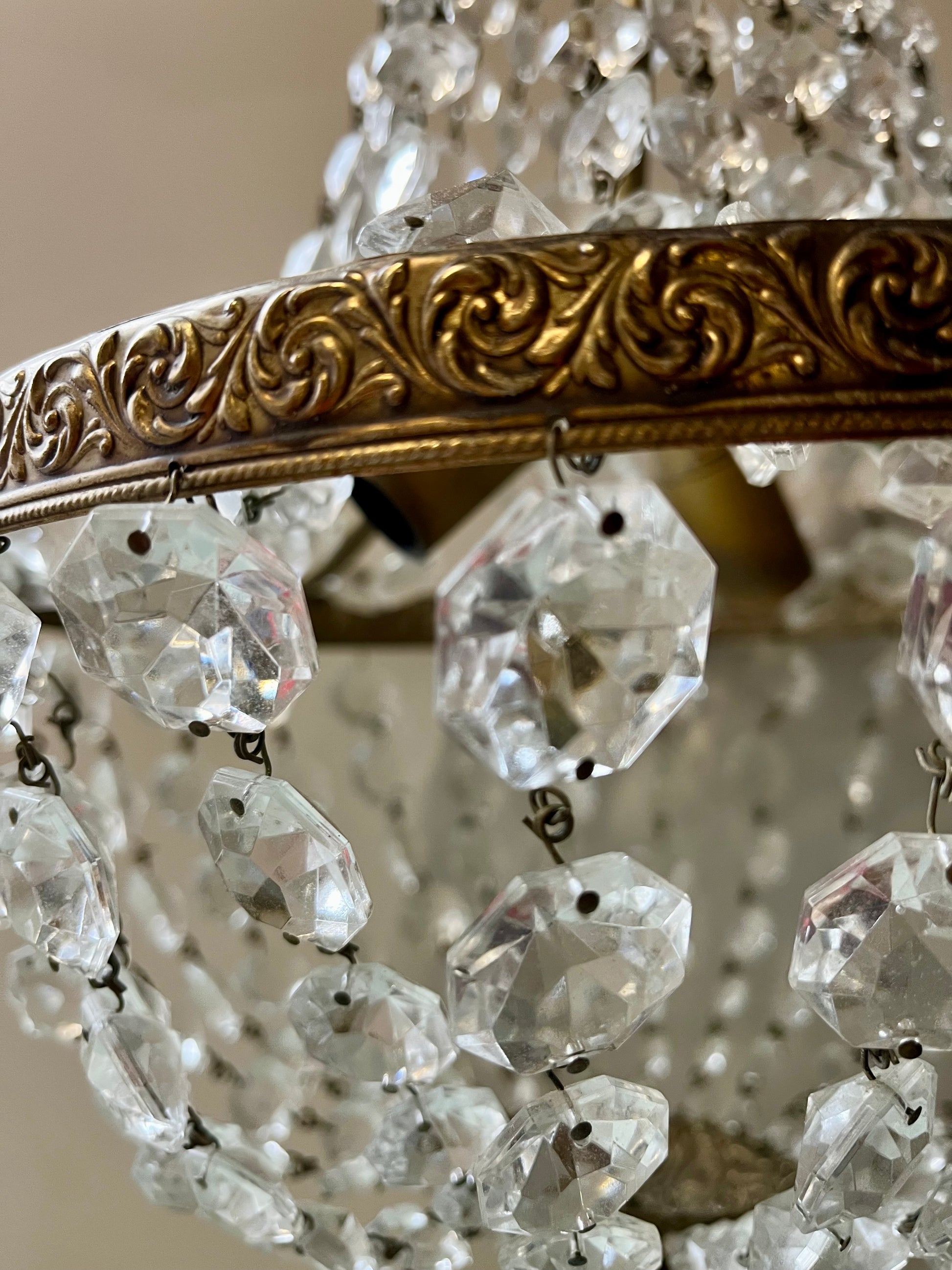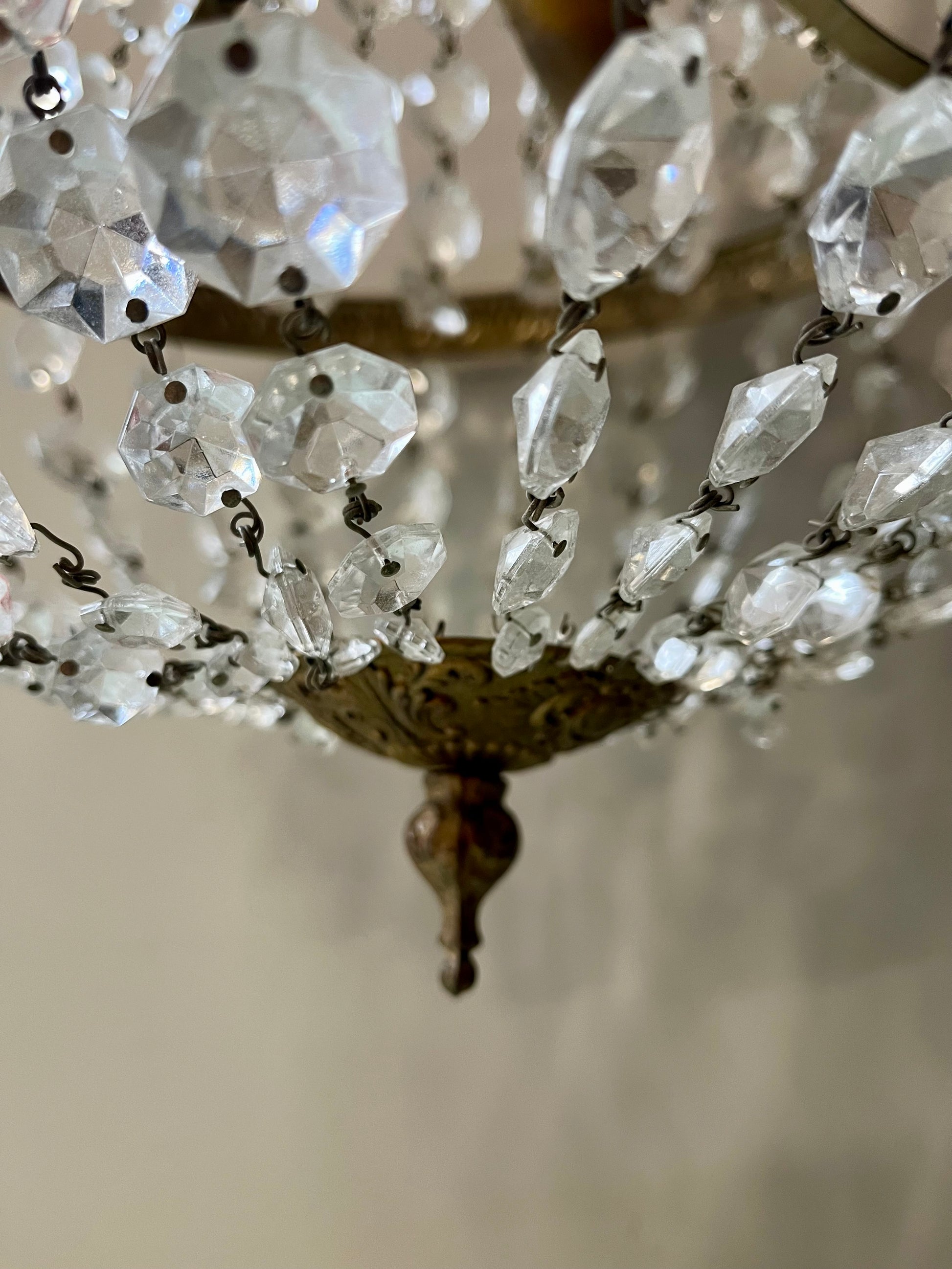 Lustre ancien à pampilles en verre monté sur une structure en métal doré décorée de motifs feuillagés. Guirlandes de pampilles facettées qui diffusent la lumière et créent de jolis reflets sur les murs et le plafond.