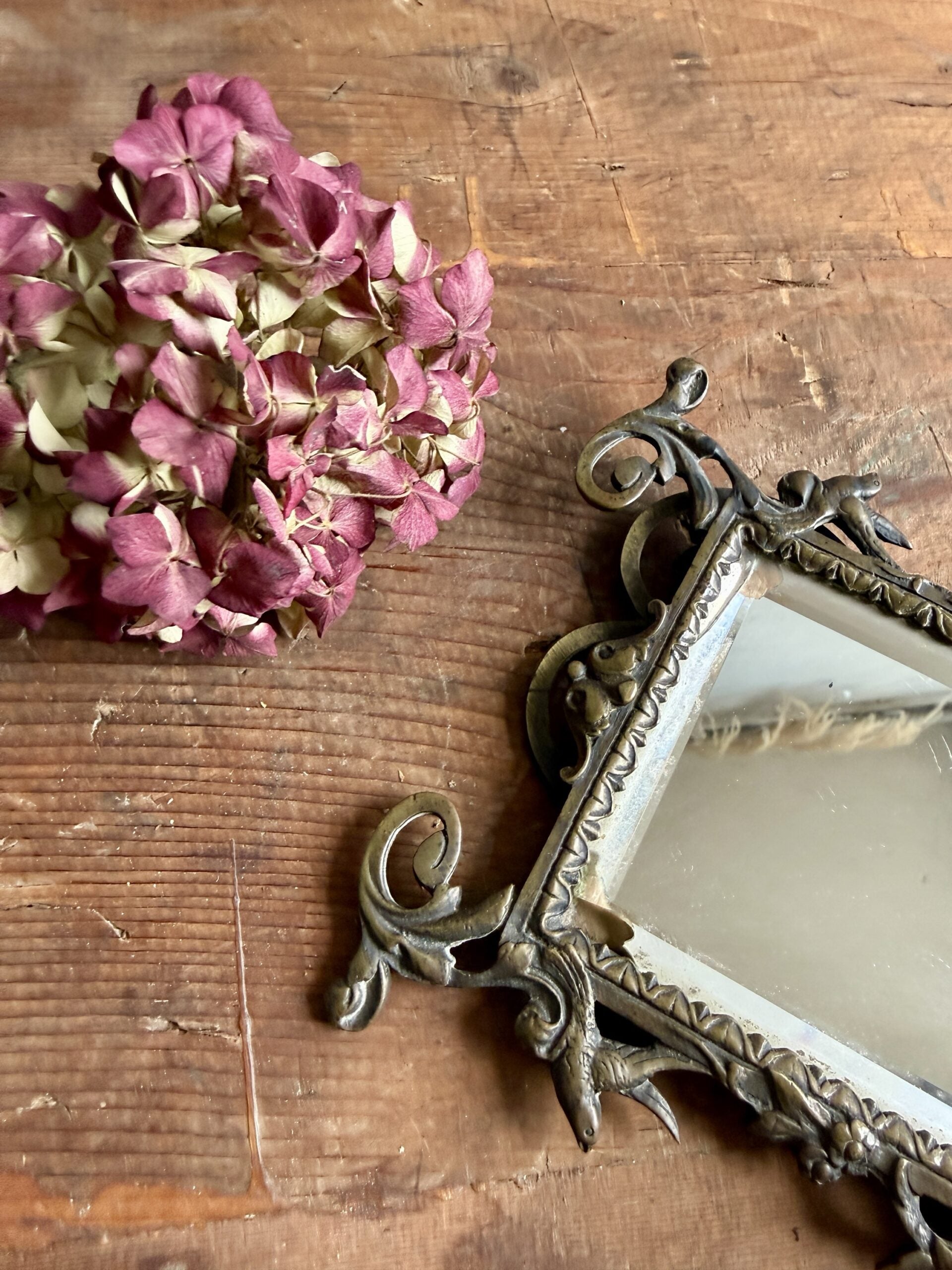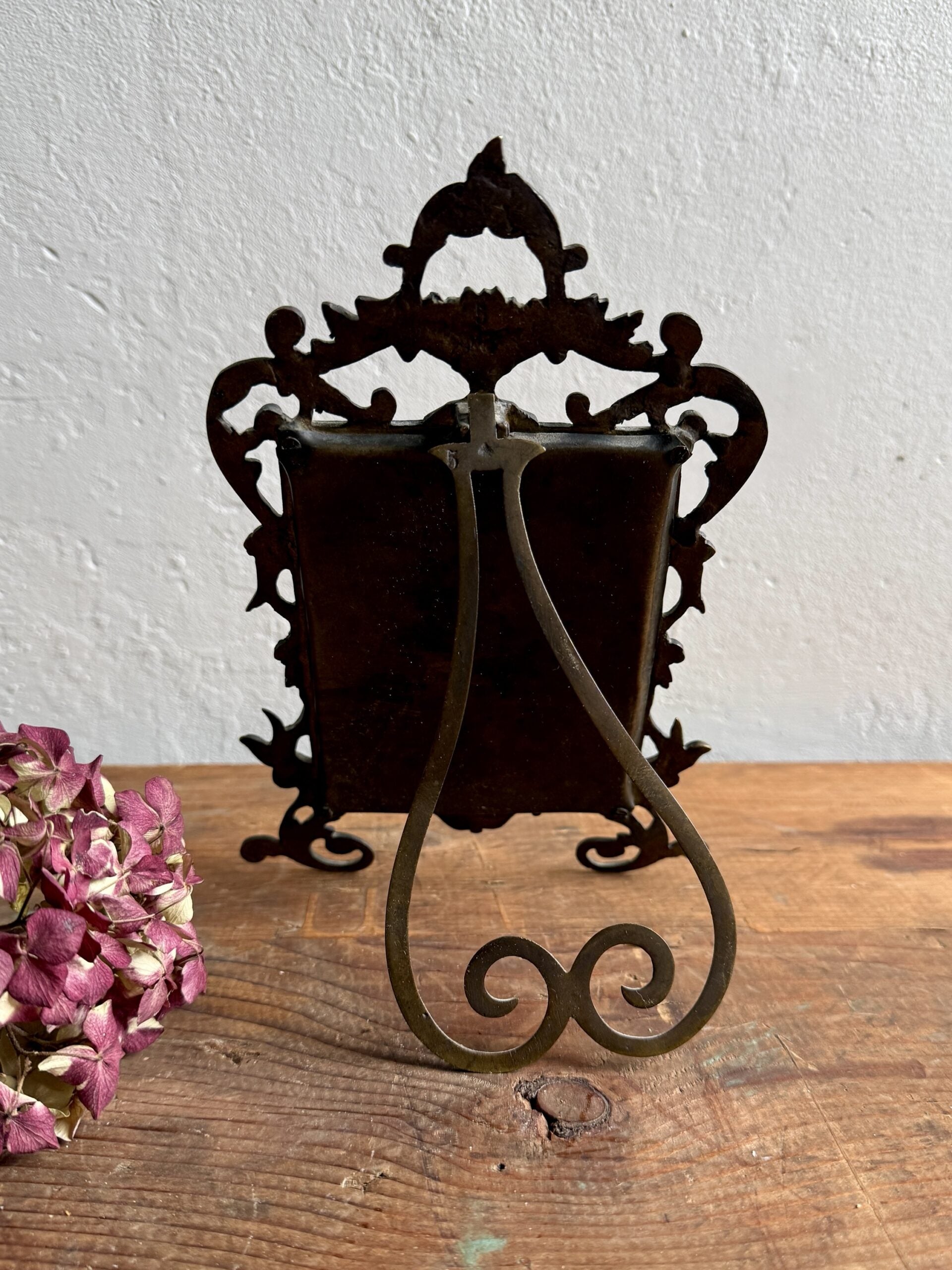 Miroir de table ancien en métal moulé, richement décoré de volutes et de motifs végétaux, avec un décor très inspiré du style Napoléon III. Les lignes sont travaillées, décoratives, et typiques des objets de toilette de la fin du XIXᵉ siècle.Pensé pour être posé sur une coiffeuse, une commode ou une étagère, ce miroir fonctionne aussi très bien en simple objet décoratif. Les traces du temps et les micro-rayures sur le miroir témoignent de son âge et de son vécu, sans nuire à son usage. Une pièce pleine de personnalité, idéale pour apporter une touche ancienne à une mise en scène.
