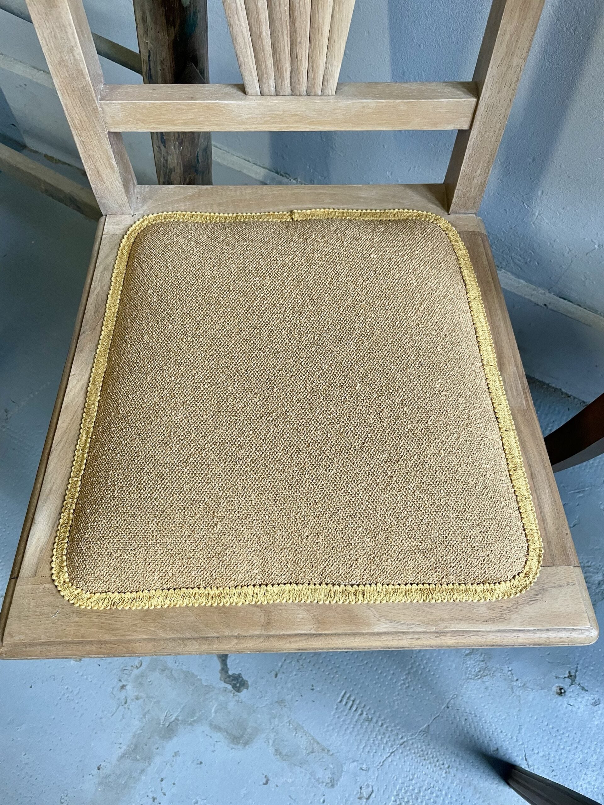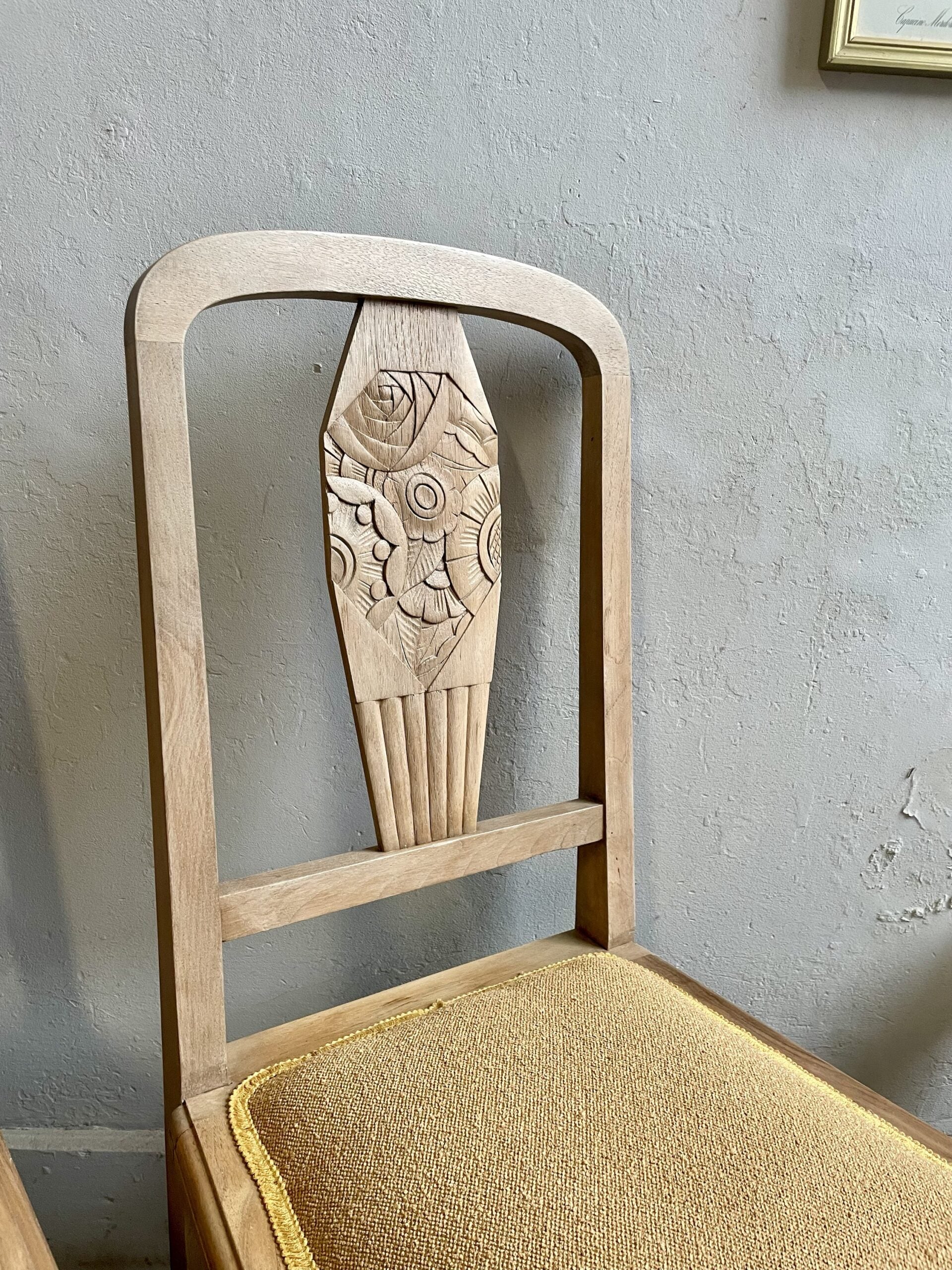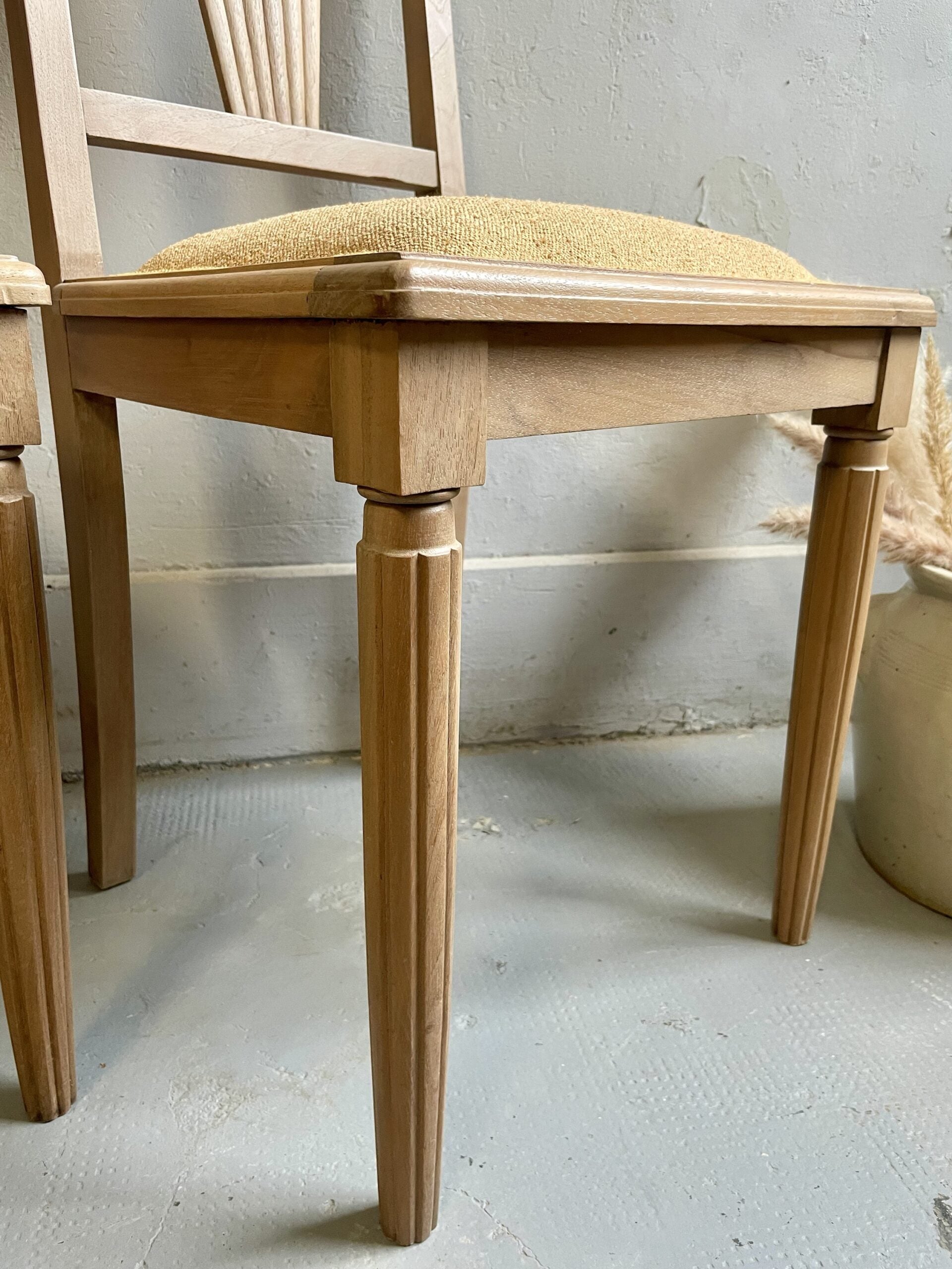 Paire de chaises Art Déco en bois de hêtre massif, entièrement restaurées pour révéler la beauté naturelle du bois et la finesse des sculptures florales. Les assises retapissées en tissu bouclette jaune moutarde offrent confort et élégance, soulignées par un galon coordonné qui met en valeur les lignes harmonieuses des dossiers.