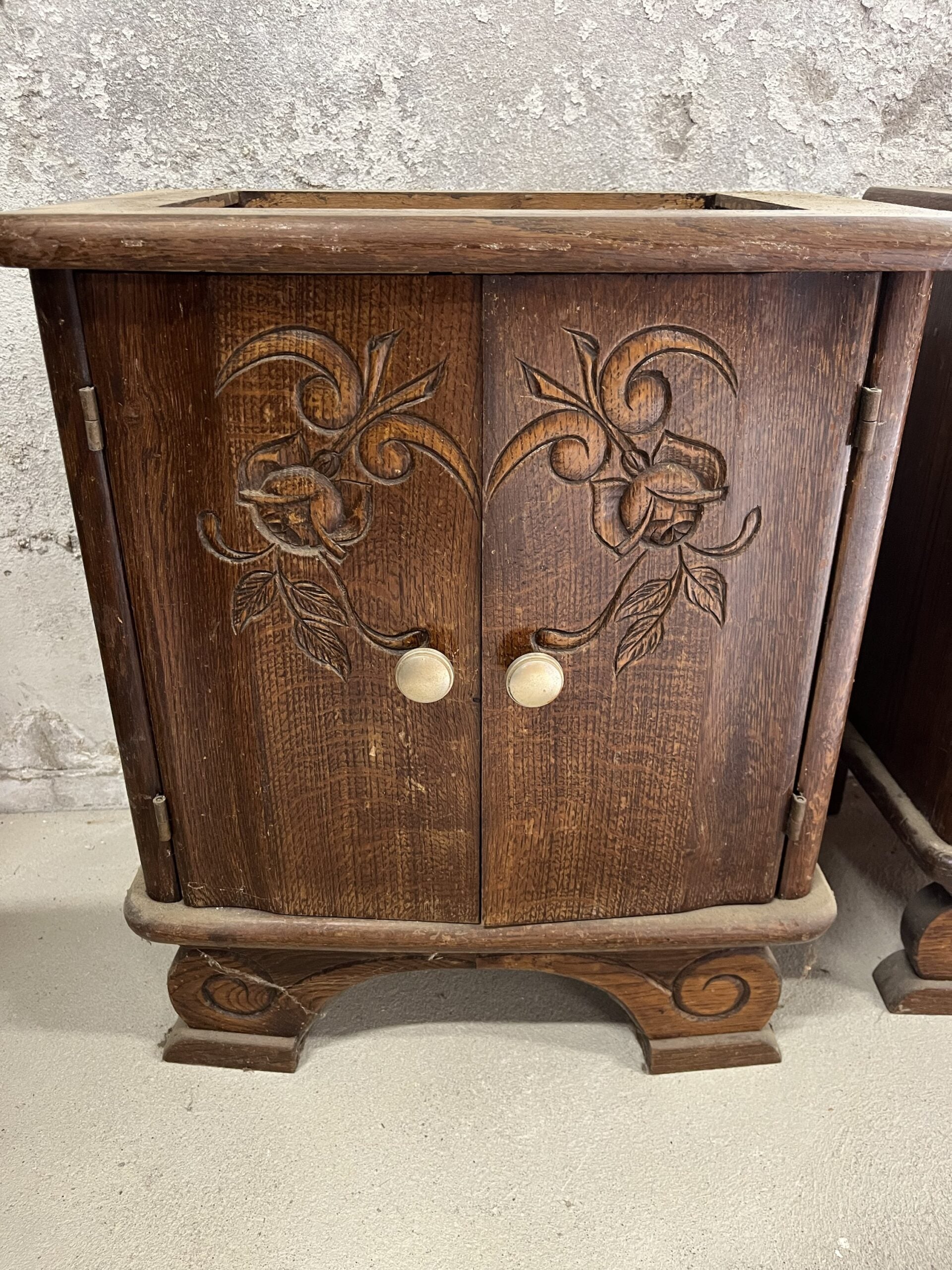 Charmante paire de chevets anciens en bois sculpté, avec de jolis motifs floraux gravés sur les portes et un piétement travaillé.\n\nCes meubles attendent leur seconde vie et peuvent être poncés, vernis ou peints selon vos envies.\n\nSi vous êtes intéressé, n’hésitez pas à nous contacter pour discuter des différentes options de finition.\n