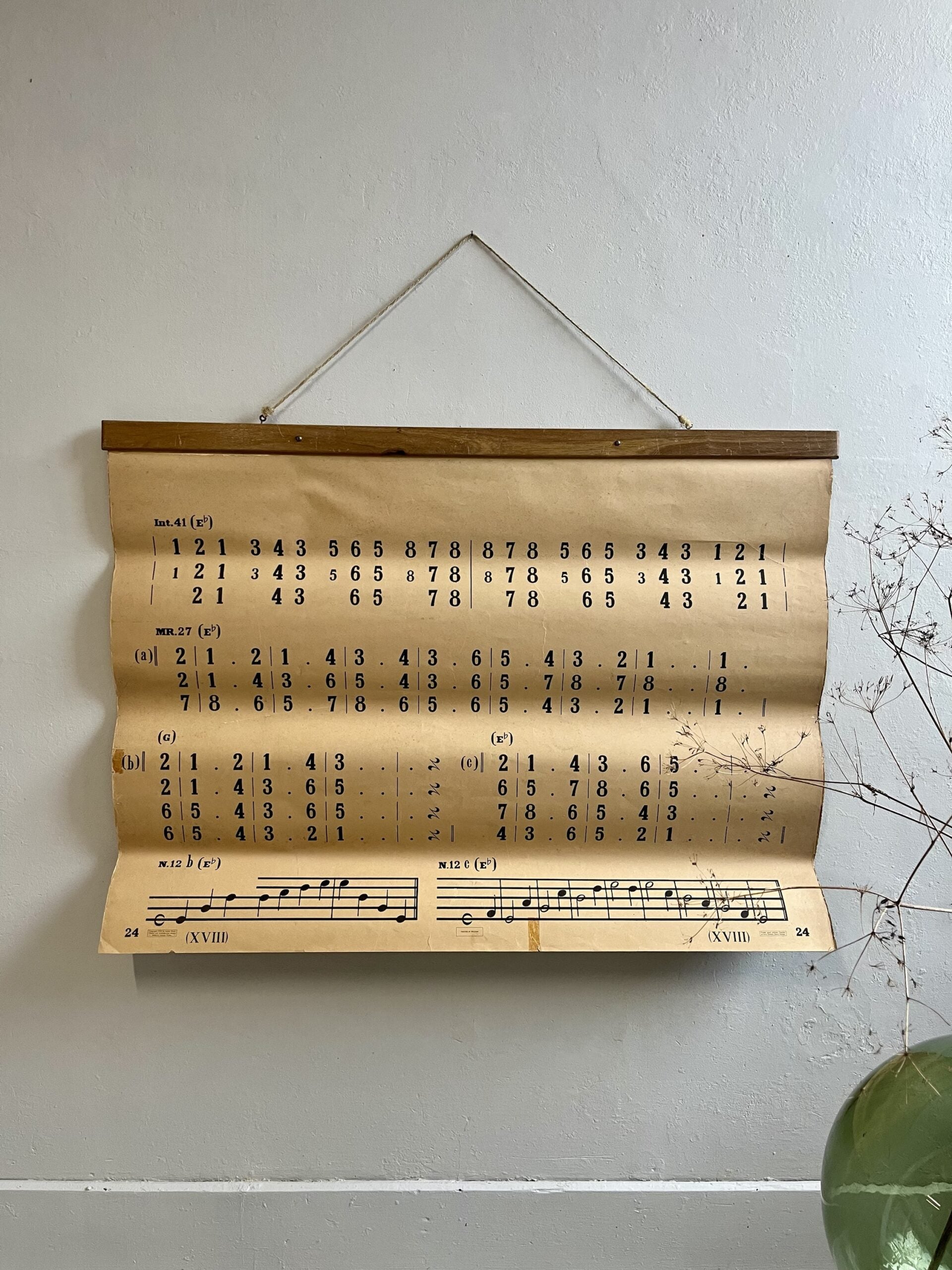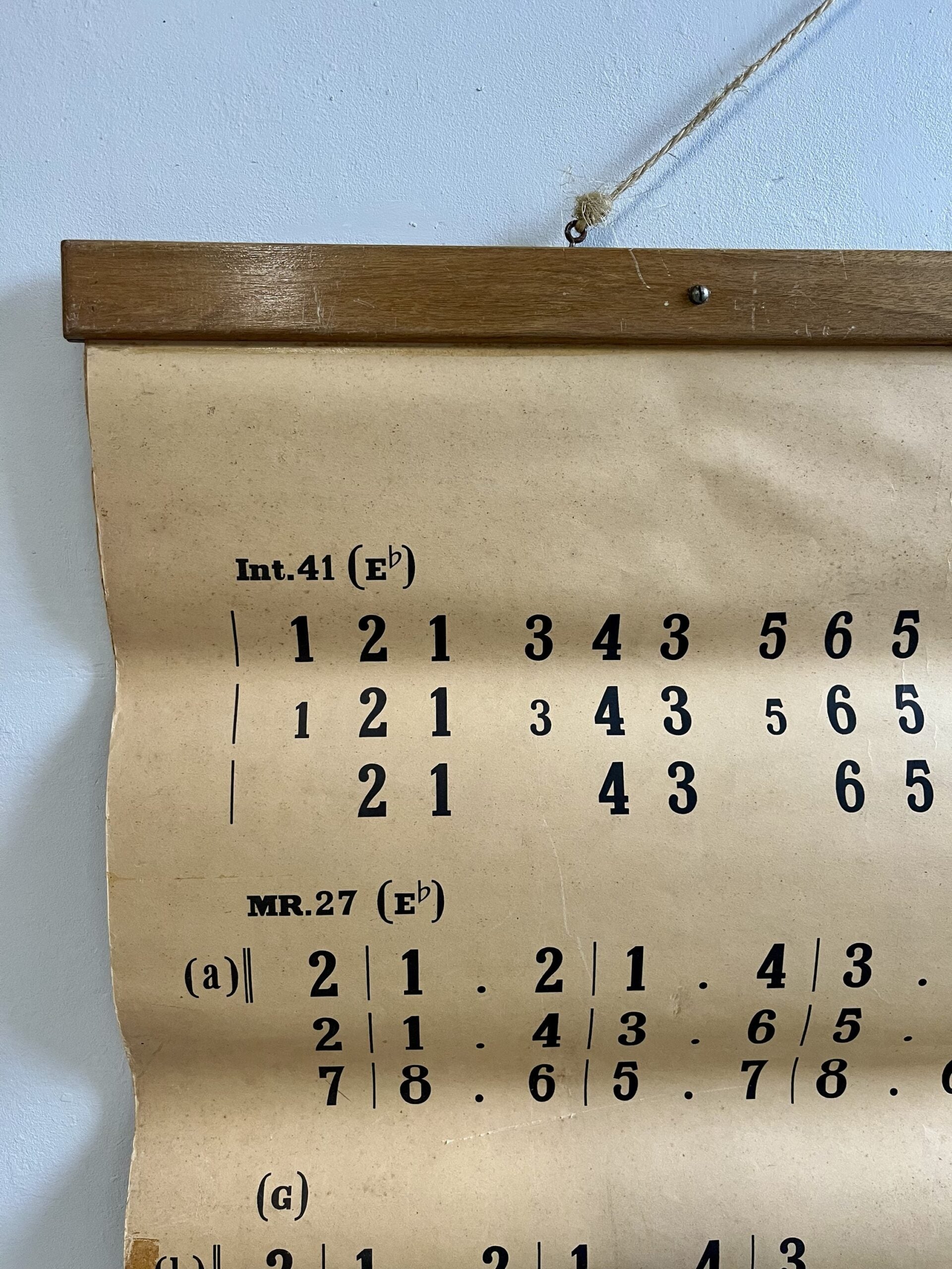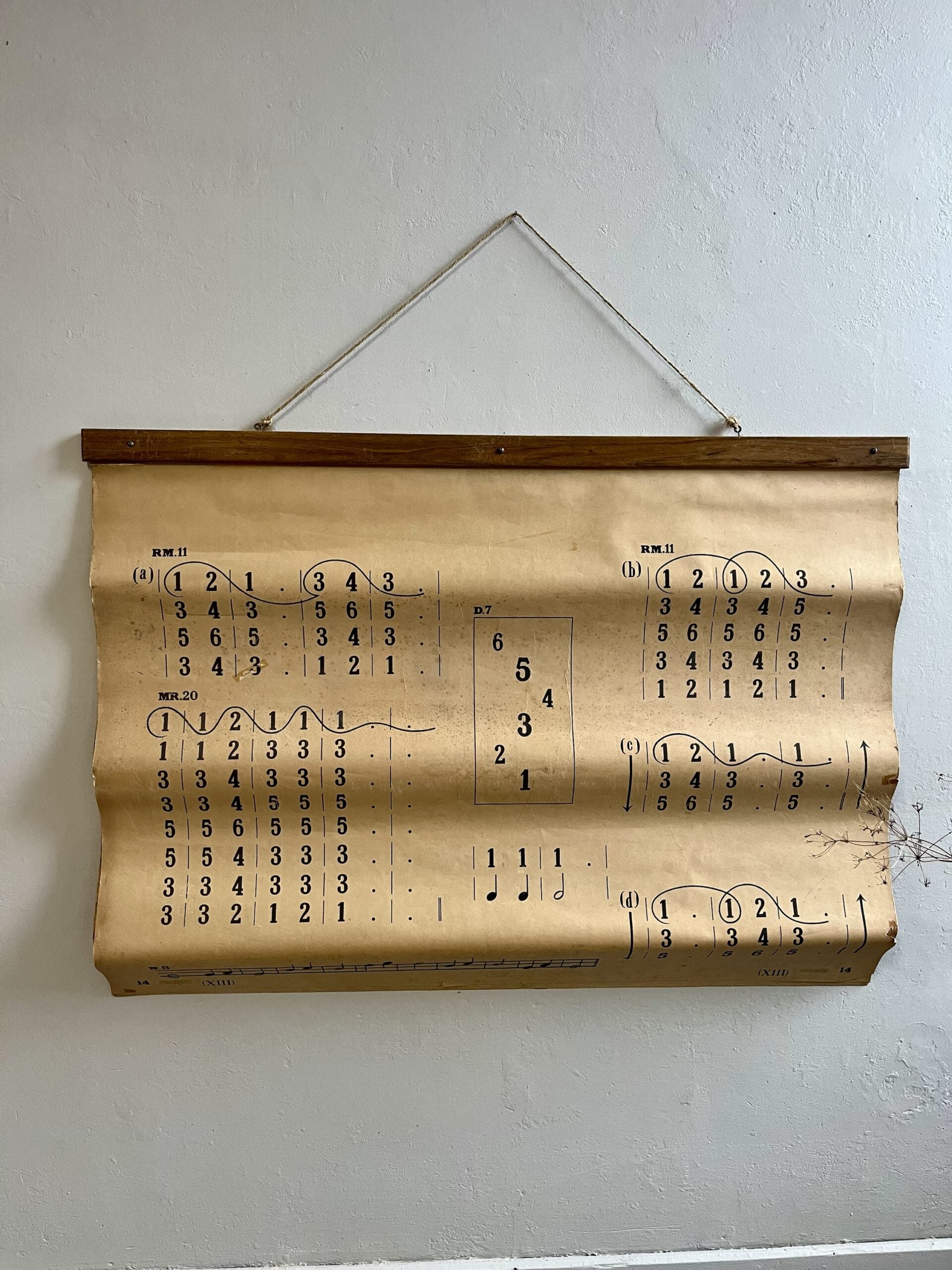 Authentique affiche pédagogique de musique, utilisée autrefois dans les écoles pour l’apprentissage du solfège. Imprimée sur papier épais jauni avec de jolies baguettes en bois et une cordelette d’accrochage, elle illustre la notation musicale chiffrée, un système autrefois répandu pour enseigner le chant et la théorie.