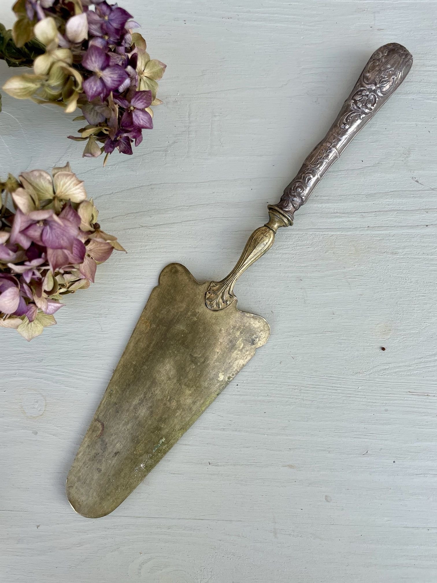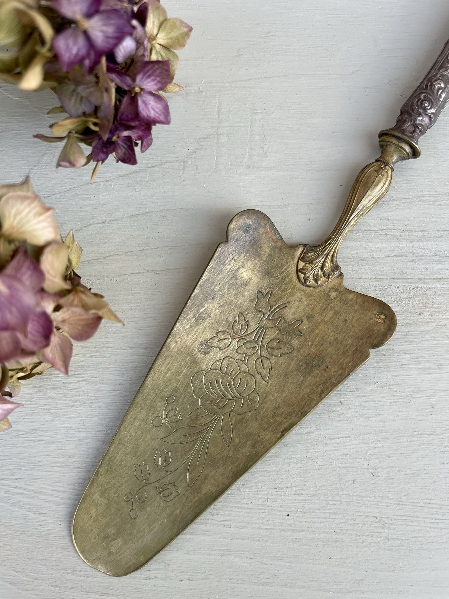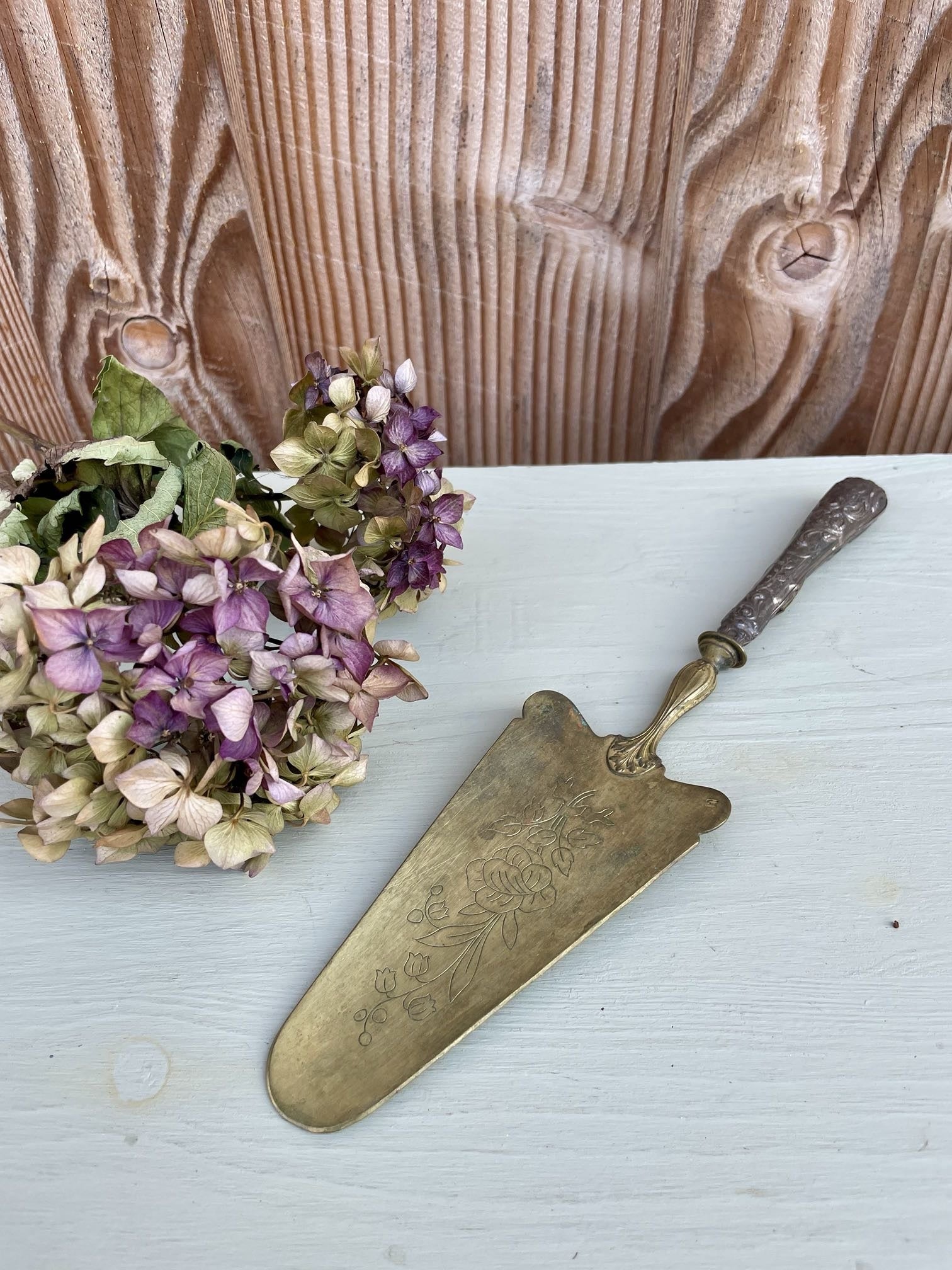 Charmante pelle à tarte ancienne, en métal argenté, au manche décoré de motifs en relief et au plateau gravé d’un élégant bouquet de fleurs. Sa patine naturelle lui donne un charme authentique et en fait un bel objet à laisser sur la table après usage.