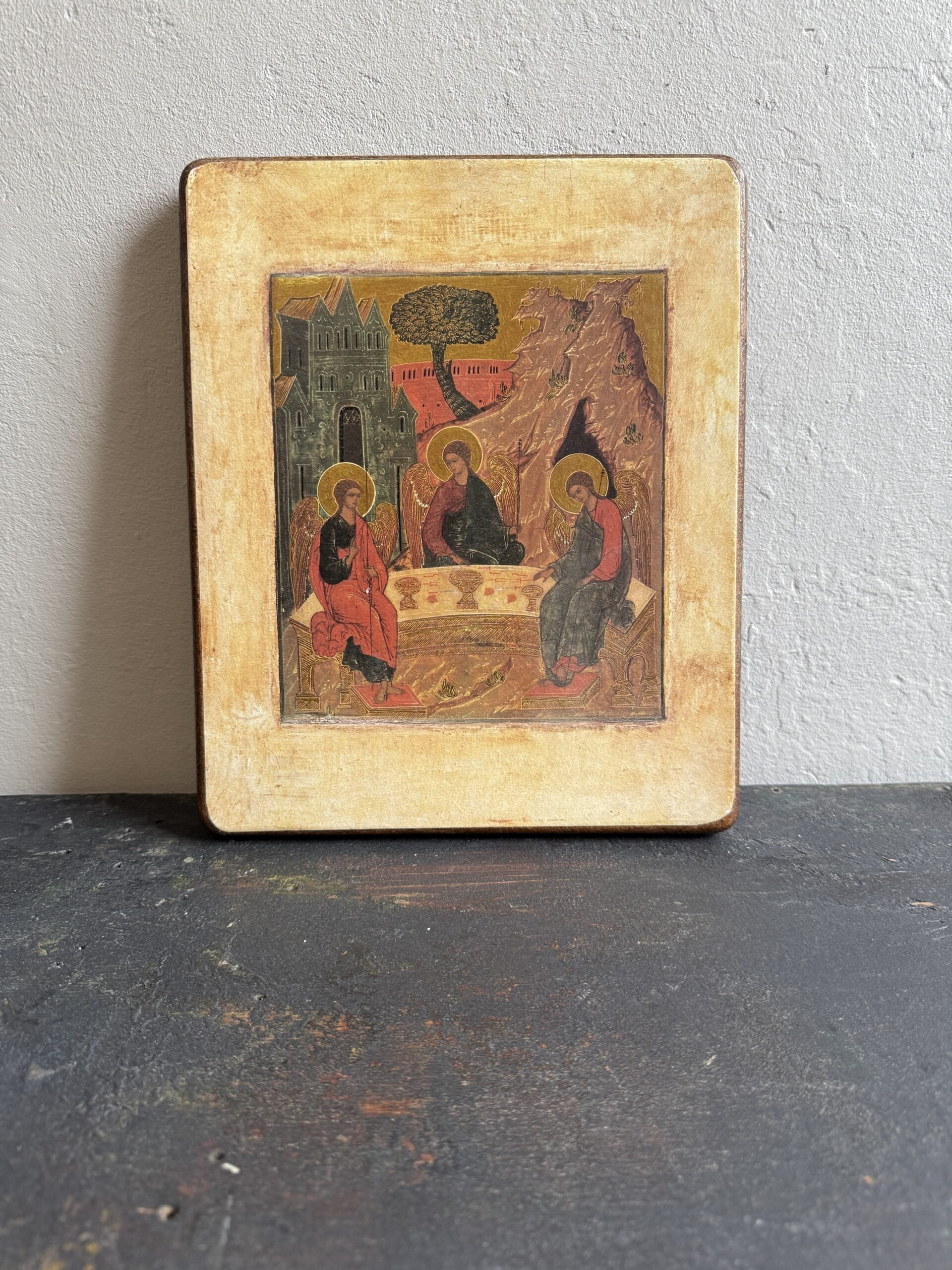 Petit tableau en bois représentant trois saints, réalisé dans un style traditionnel.