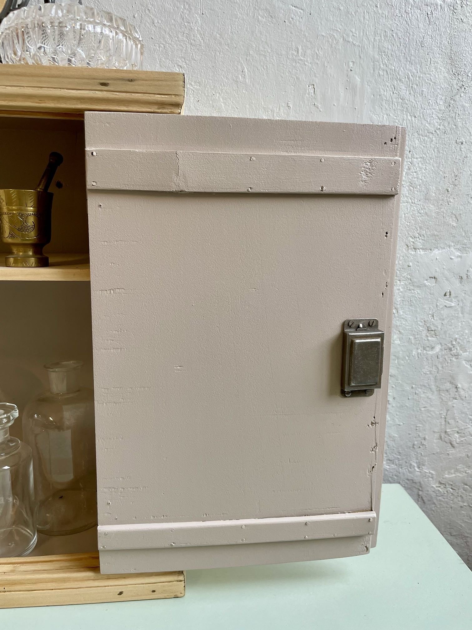 Petite armoire vintage en bois clair, pouvant être fixée au mur ou simplement posée sur un meuble. Son intérieur peint en taupe rosé crée un contraste discret avec le bois naturel et met en valeur les objets exposés.