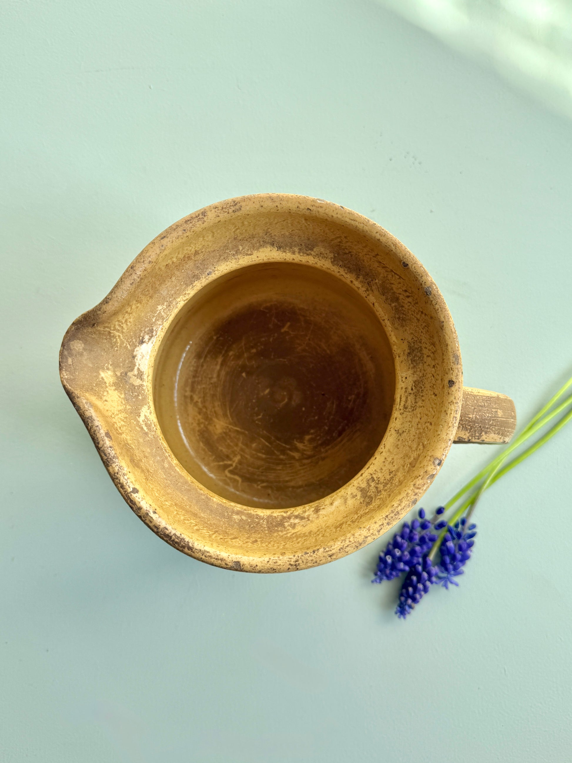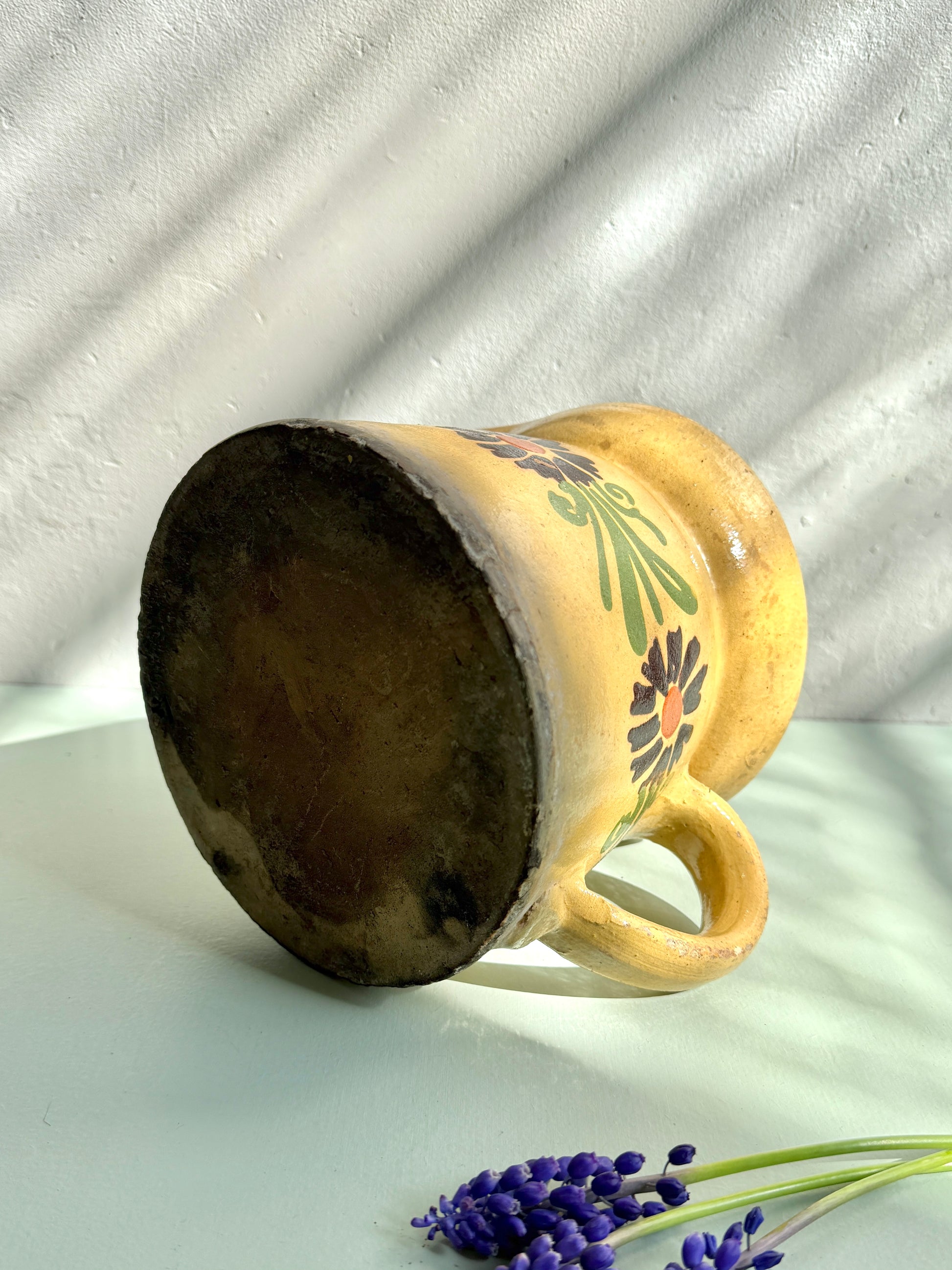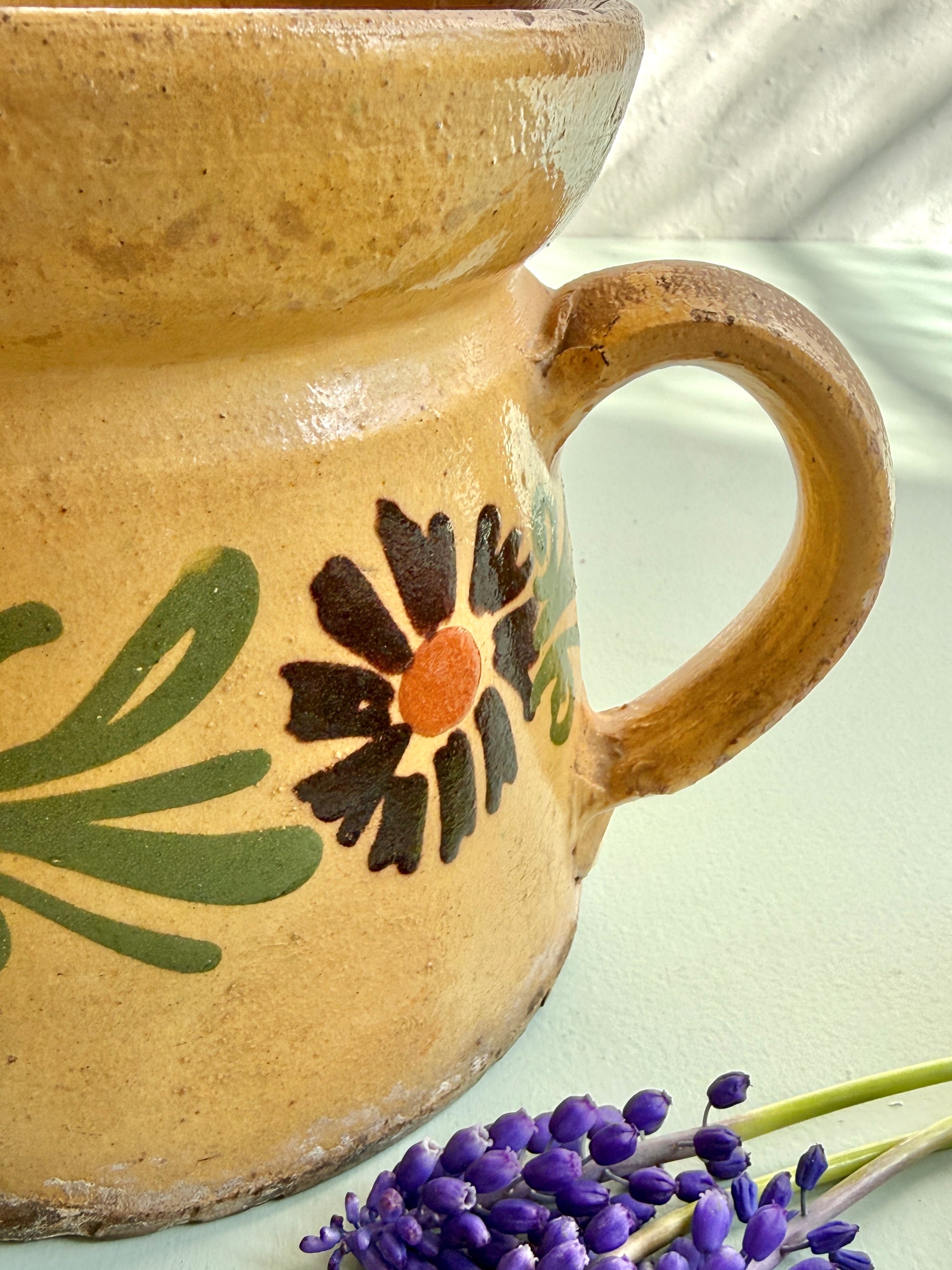 Pichet ancien en grès avec décor floral peint. Une pièce typique de la vaisselle ancienne, avec ses couleurs et son émail marqué par le temps.