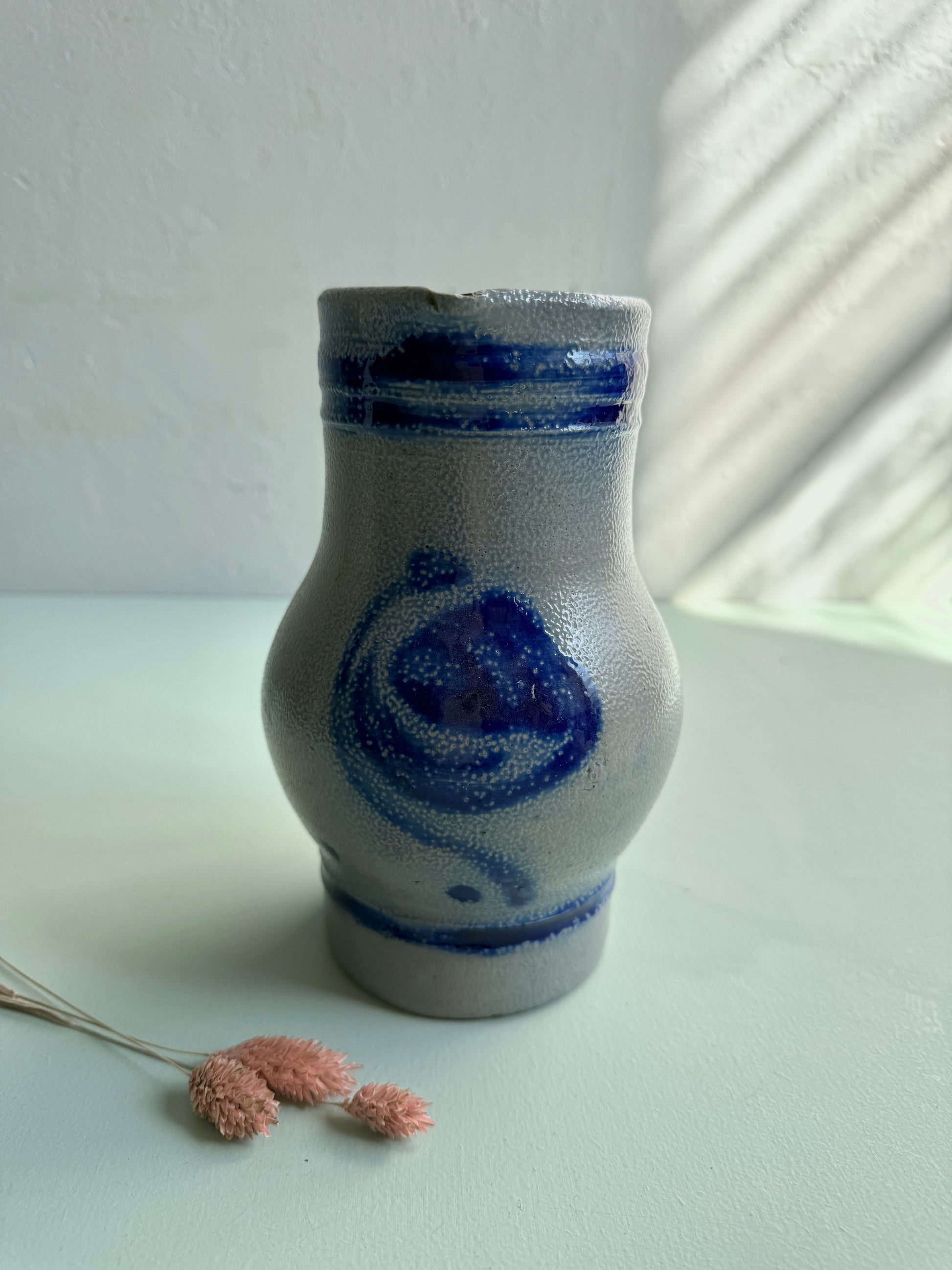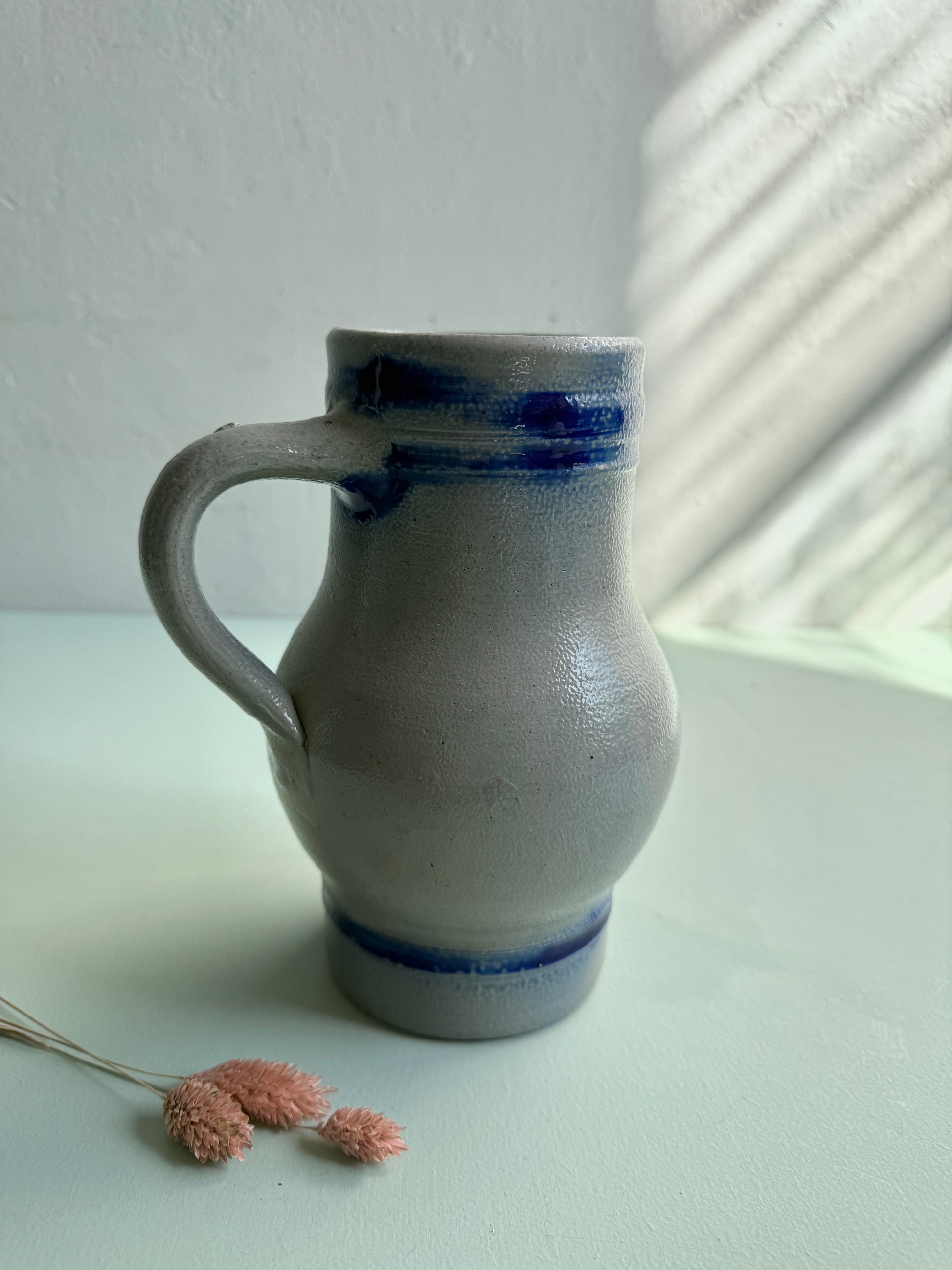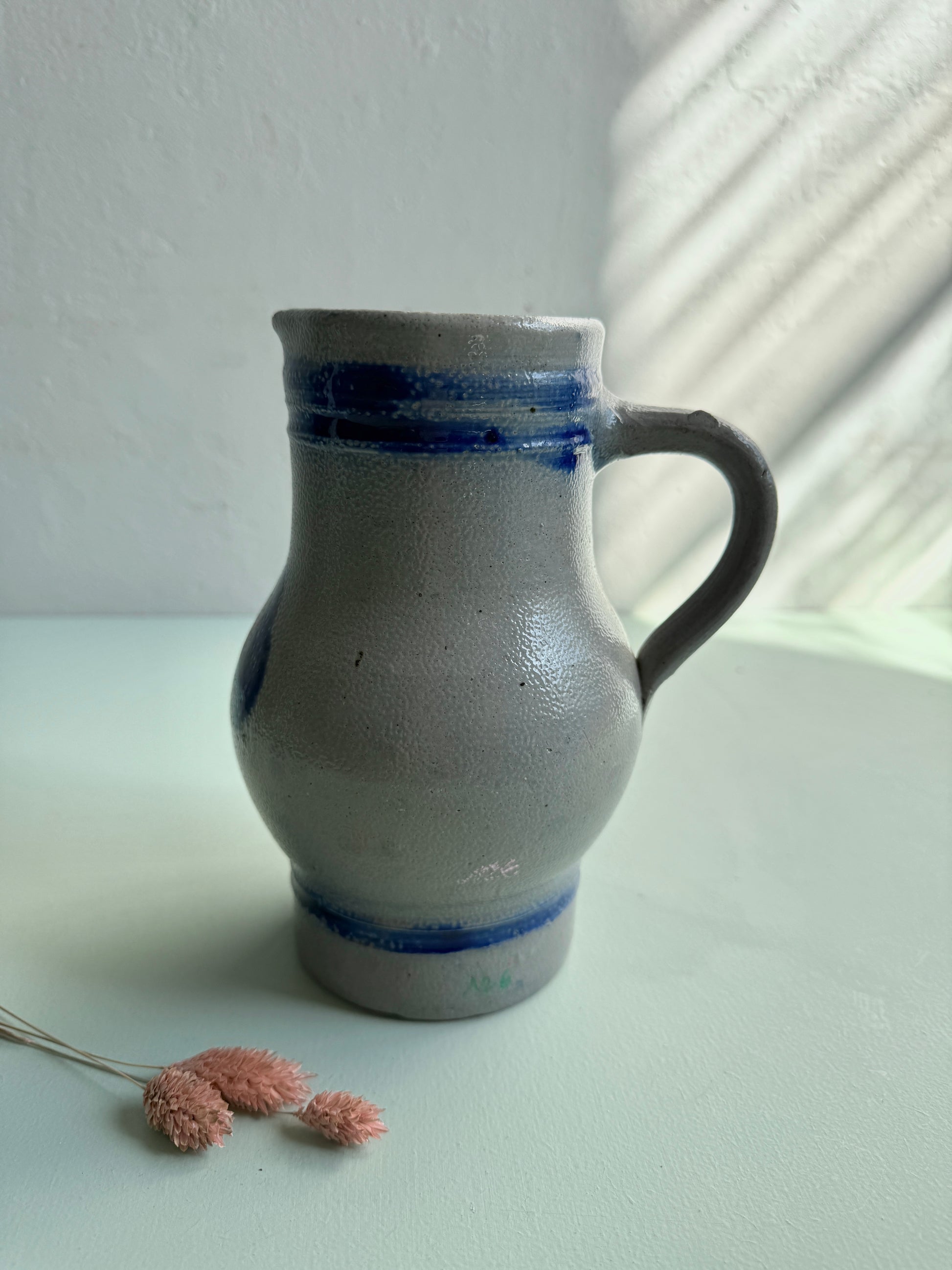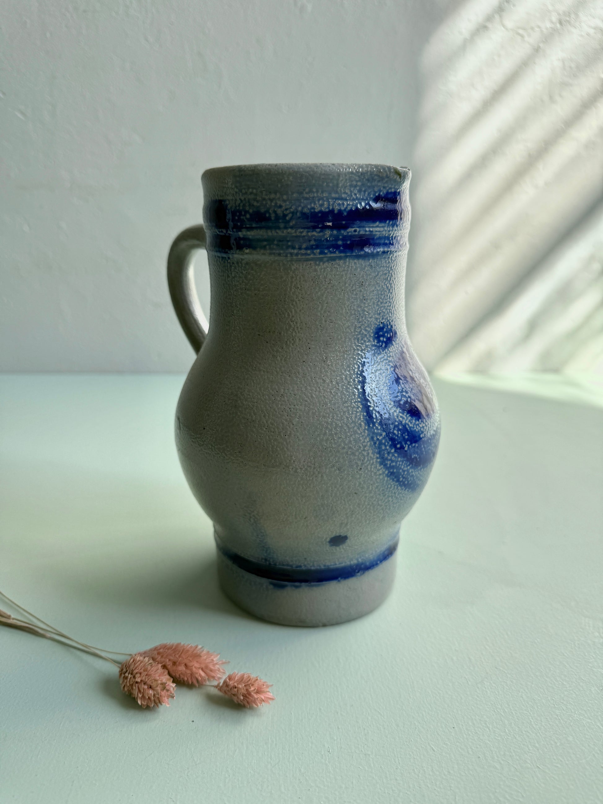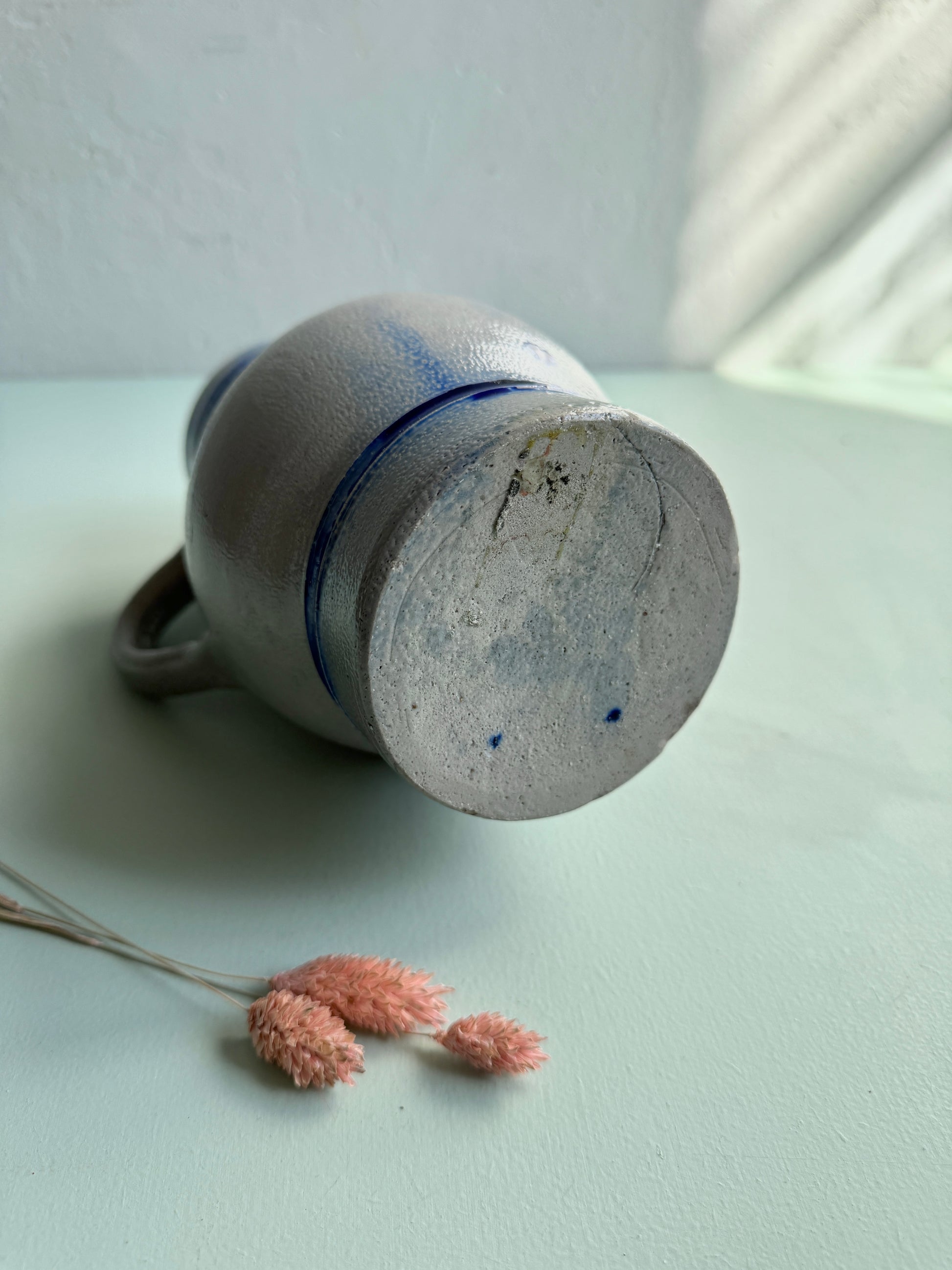 Pichet ancien en grès avec son émail gris ponctué de bleu, un grand classique de la vaisselle ancienne qu’on retrouve dans les poteries alsaciennes comme celles de Betschdorf. Ce type de grès, cuit à haute température, était utilisé pour sa solidité et son usage quotidien.
