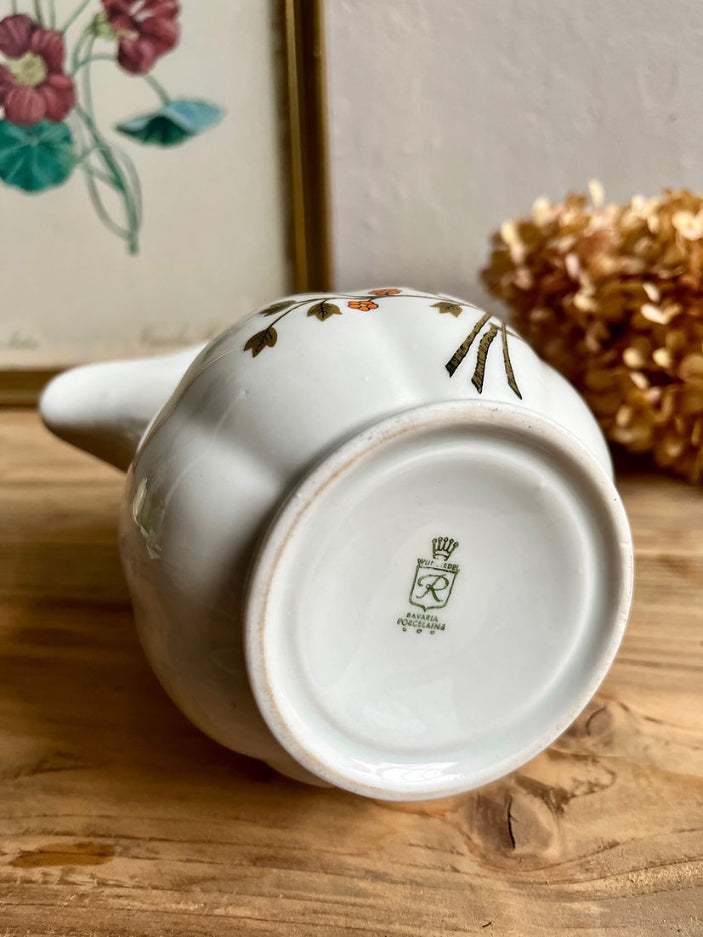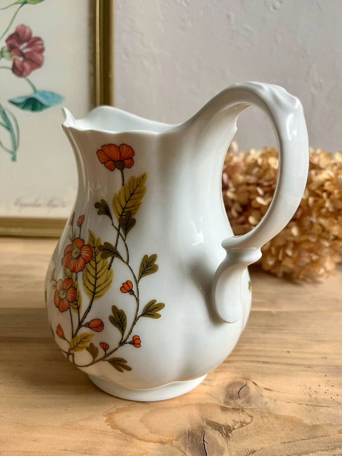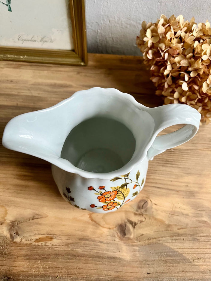 Petit pichet vintage à fleurs oranges. Peut aussi être détourné en vase. Hauteur 15cm Diamètre 7,5cm