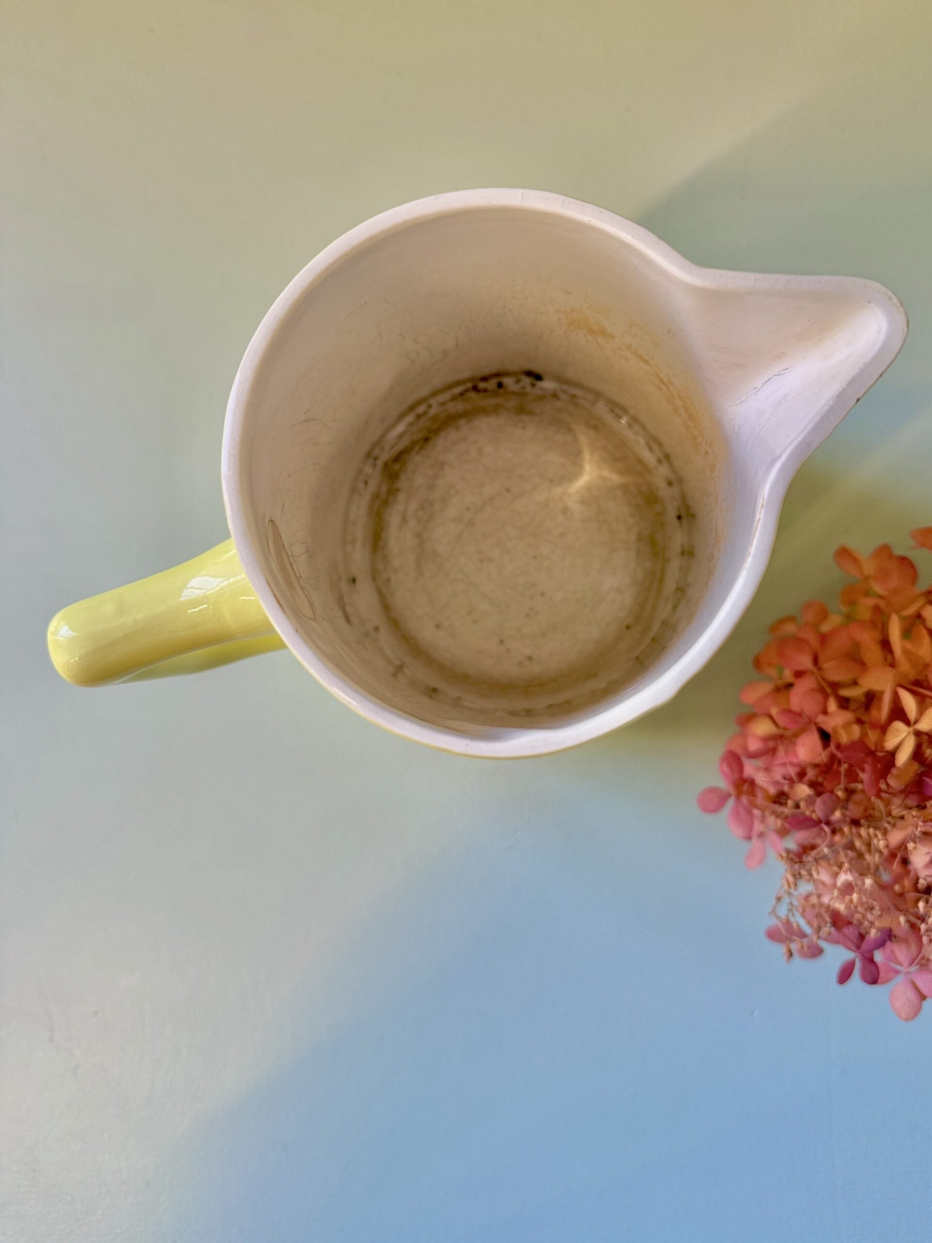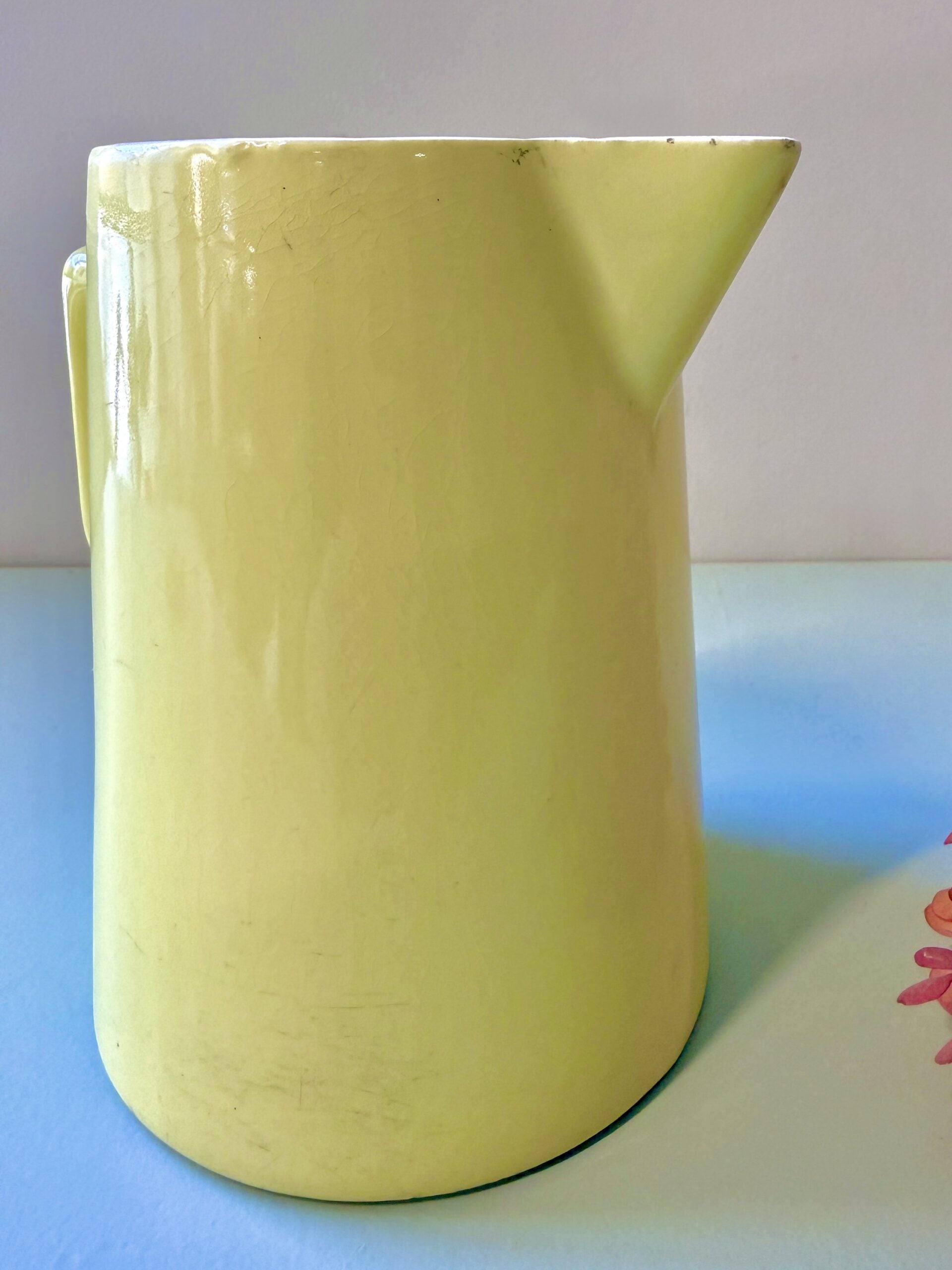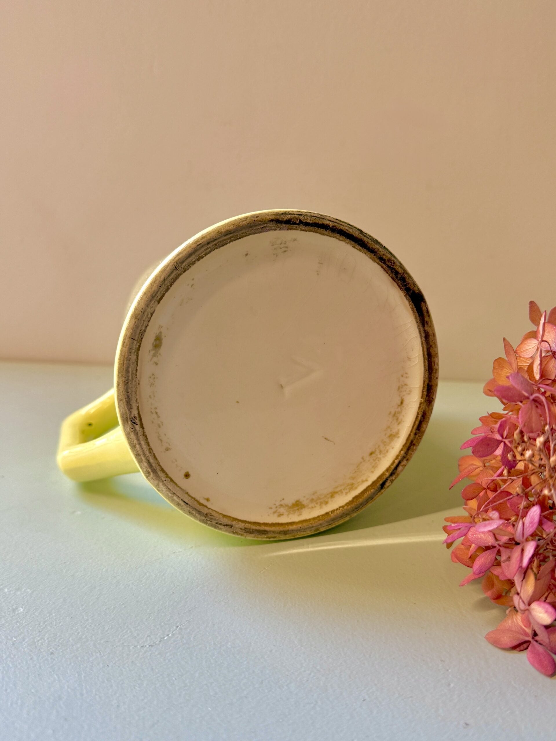 Pichet ancien en céramique jaune, au volume simple et à la ligne sobre, typique des objets utilitaires d’autrefois. Sa forme cylindrique, son bec verseur bien marqué et son anse anguleuse rappellent les pichets de cuisine ancienne utilisés au quotidien.L’émail est usé à l’intérieur, avec des traces du temps visibles liées à son usage. À utiliser en pichet décoratif, en vase pour fleurs séchées ou simplement posé sur une étagère, un plan de travail ou un buffet ancien pour apporter une touche de décoration vintage et de brocante à l’ensemble. Pièce de seconde main.