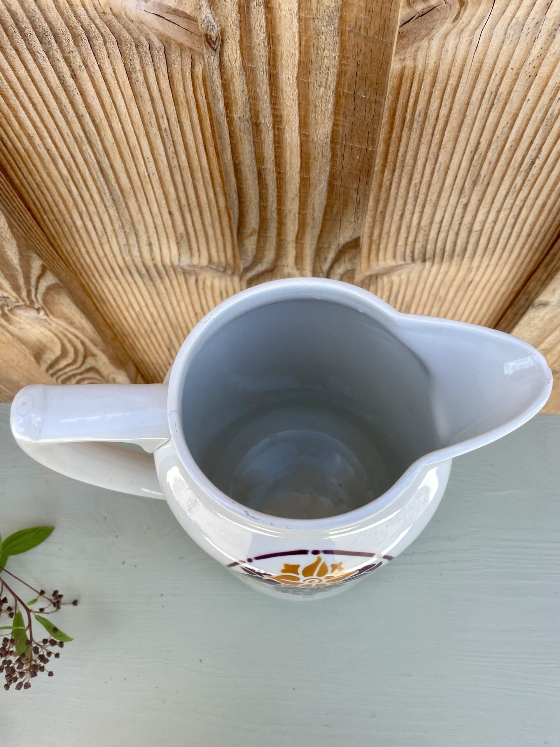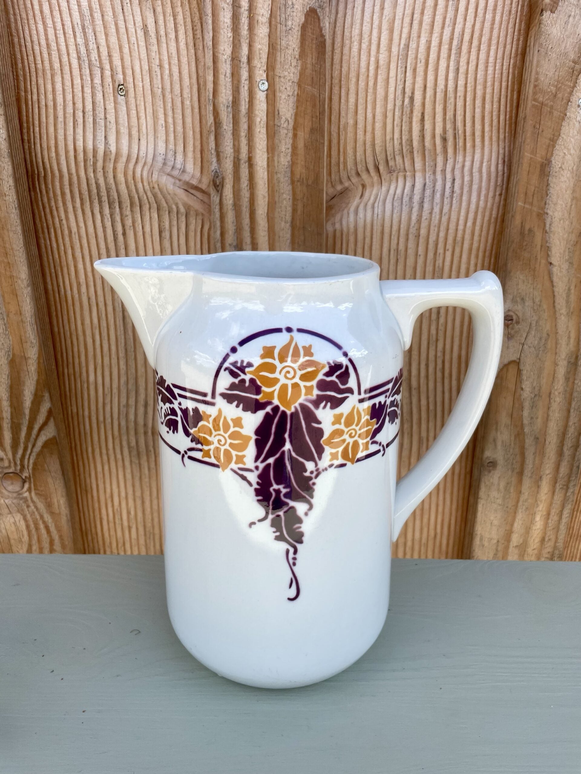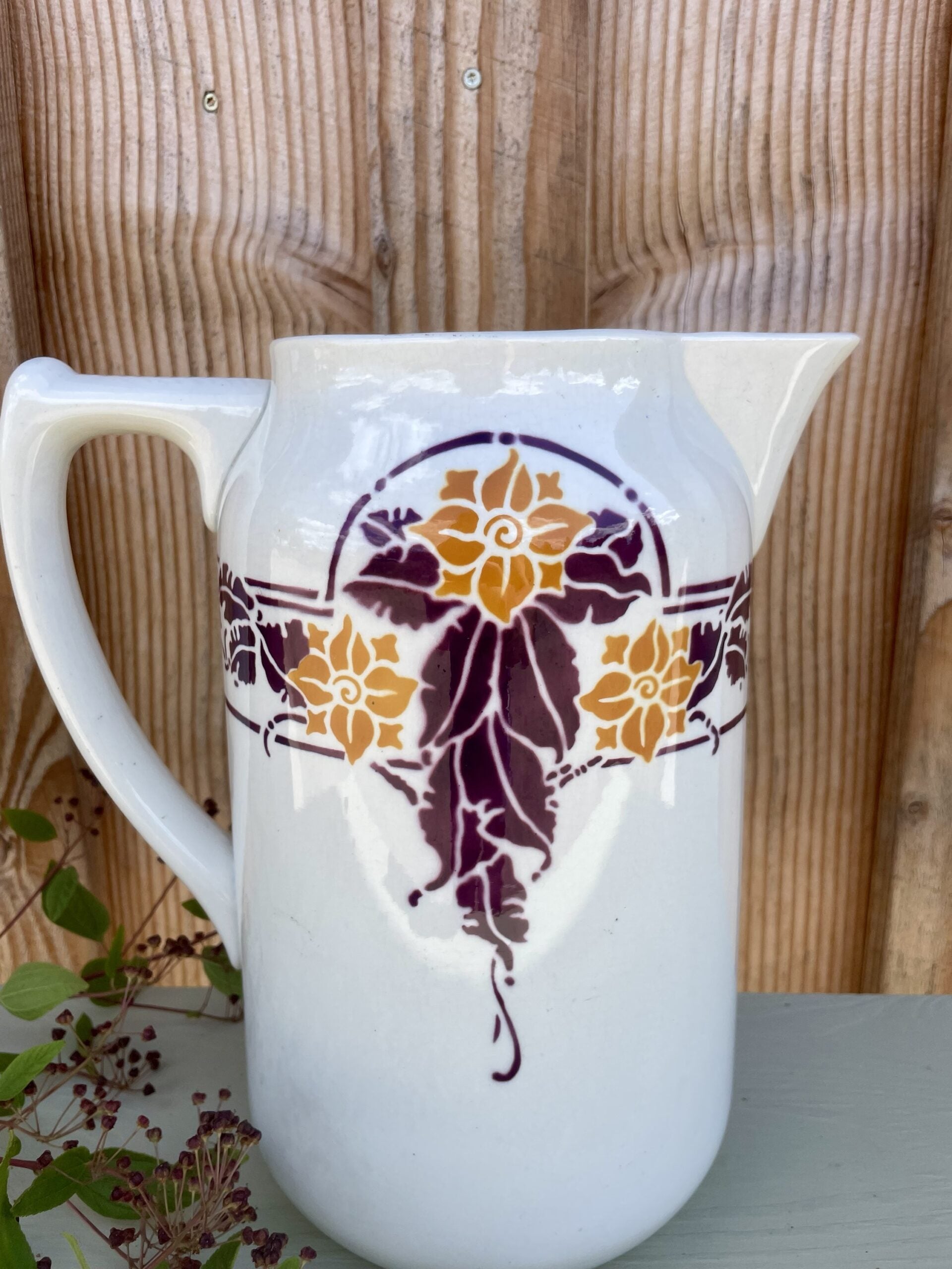 Un authentique pichet de la faïencerie Sarreguemines, modèle "Lianes". Son motif végétal est d'inspiration Art Nouveau, typique des créations de l'époque.