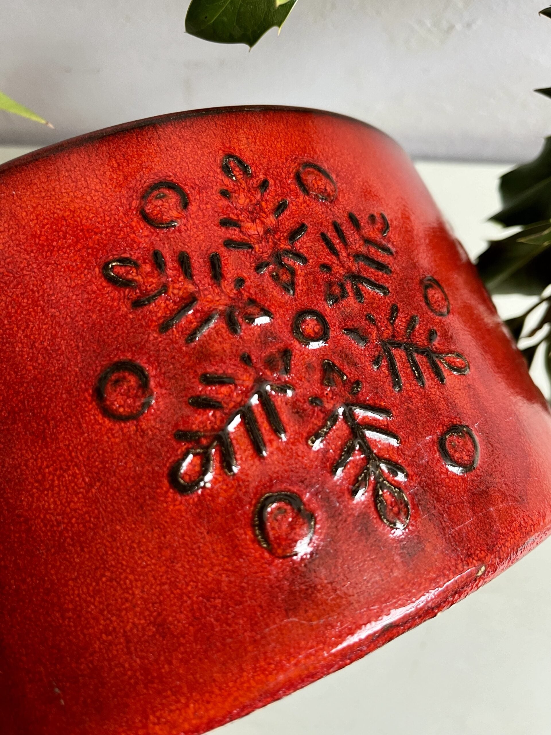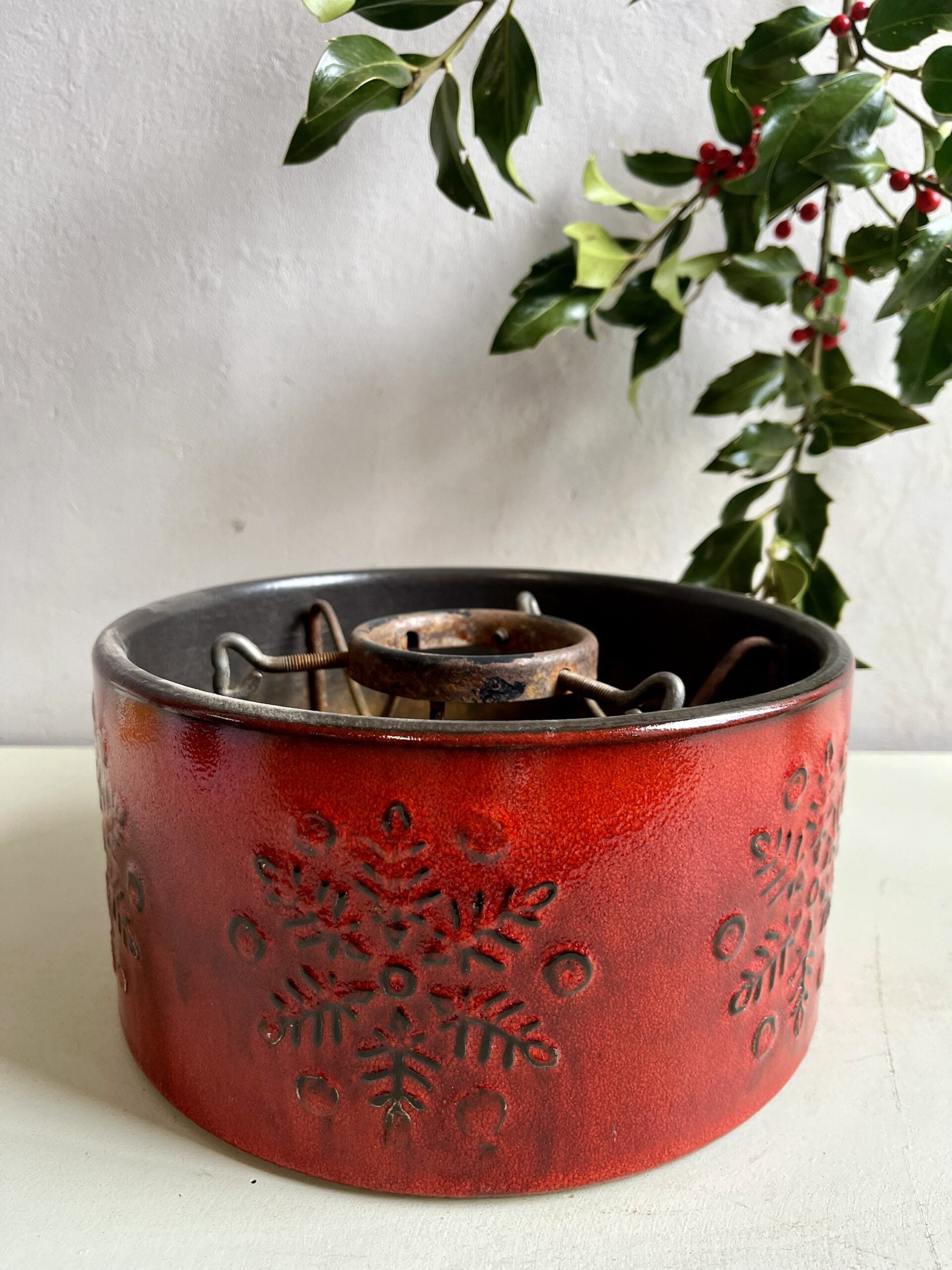 Ancien pied de sapin en céramique émaillé. Ce cache pot vintage est décoré de flocons de neige.