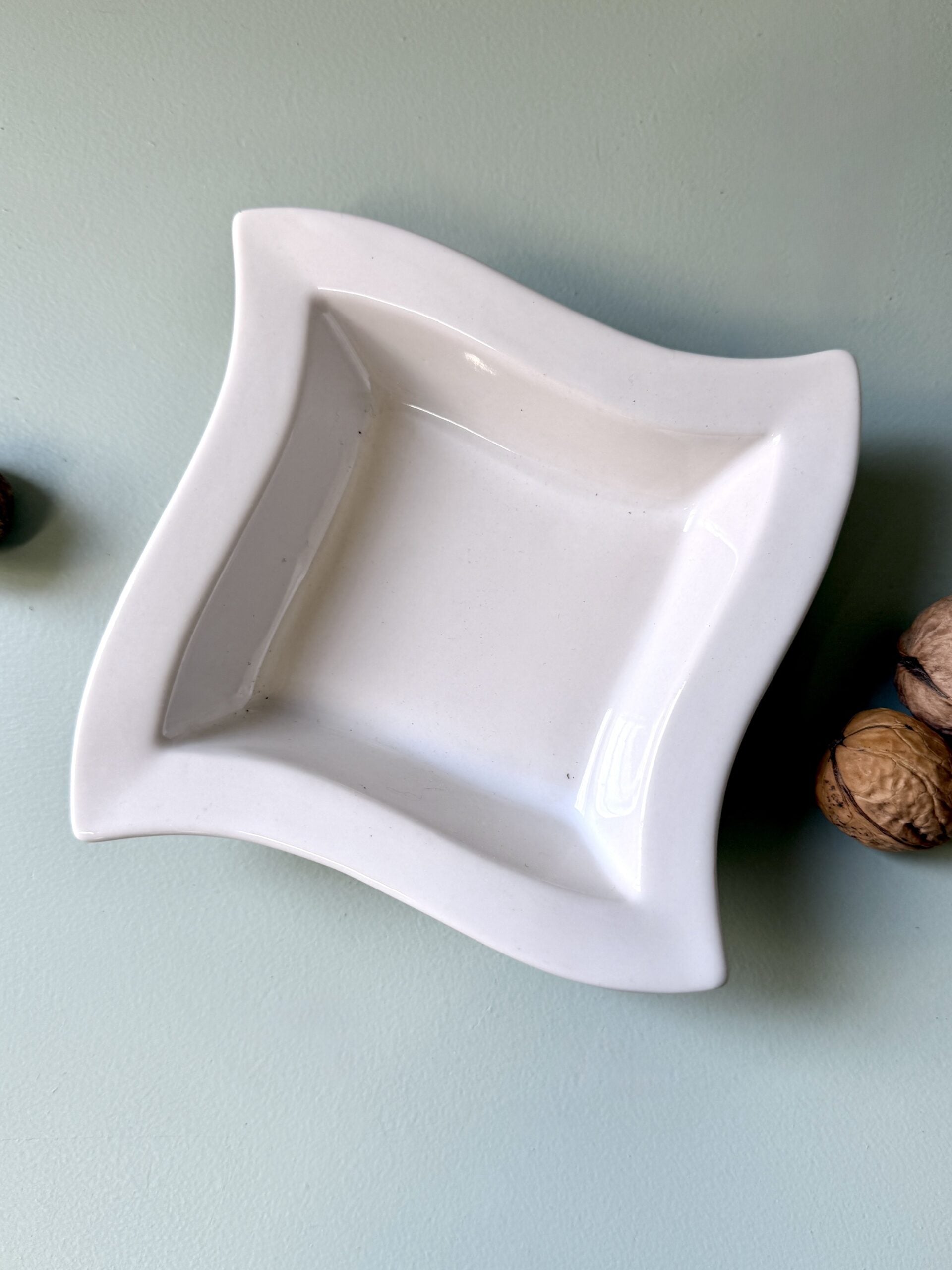 Coupelle en porcelaine blanche au dessin légèrement ondulé, typique du style ancien de la maison Hutschenreuther. Sa forme carrée aux lignes douces lui donne une vraie présence sur une table, tout en restant facile à associer avec d’autres pièces de vaisselle vintage.Parfaite pour quelques fruits secs, des noix, des petits biscuits ou simplement posée en décoration. Une pièce simple, avec ce petit air rétro qu’on aime retrouver dans les objets du quotidien.