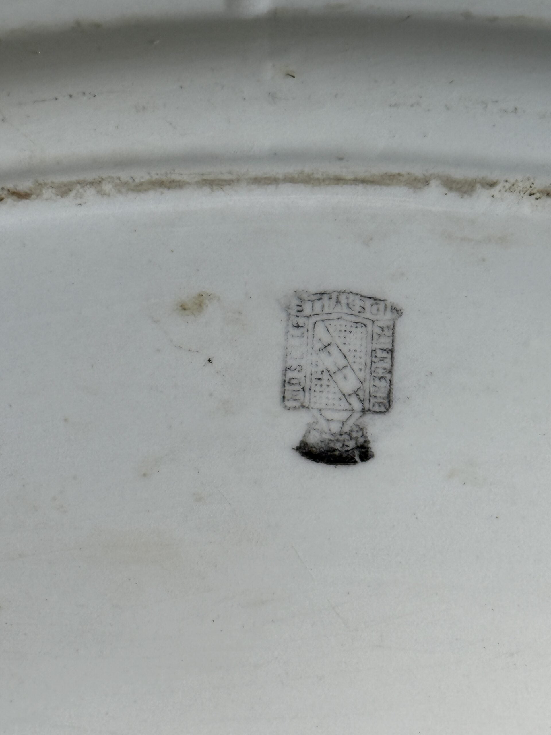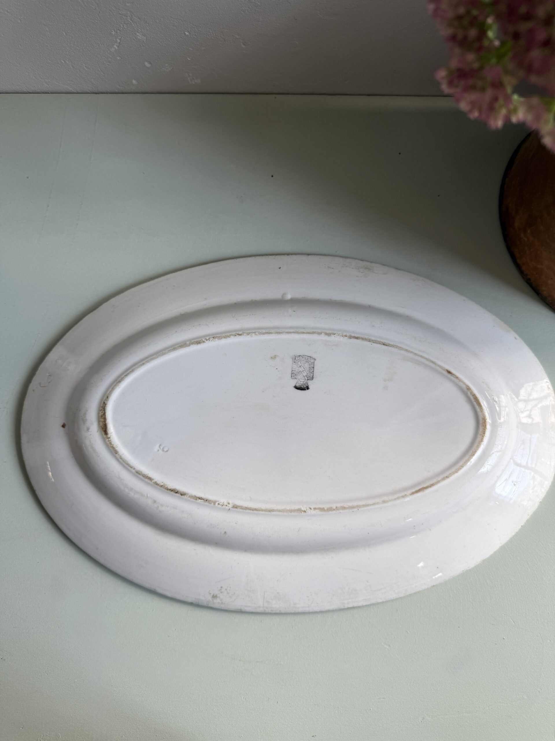 Plat ancien en faïence de la manufacture de Sarreguemines. Le pourtour est orné d’une frise florale composée de huit fleurs reliées par des branches.
