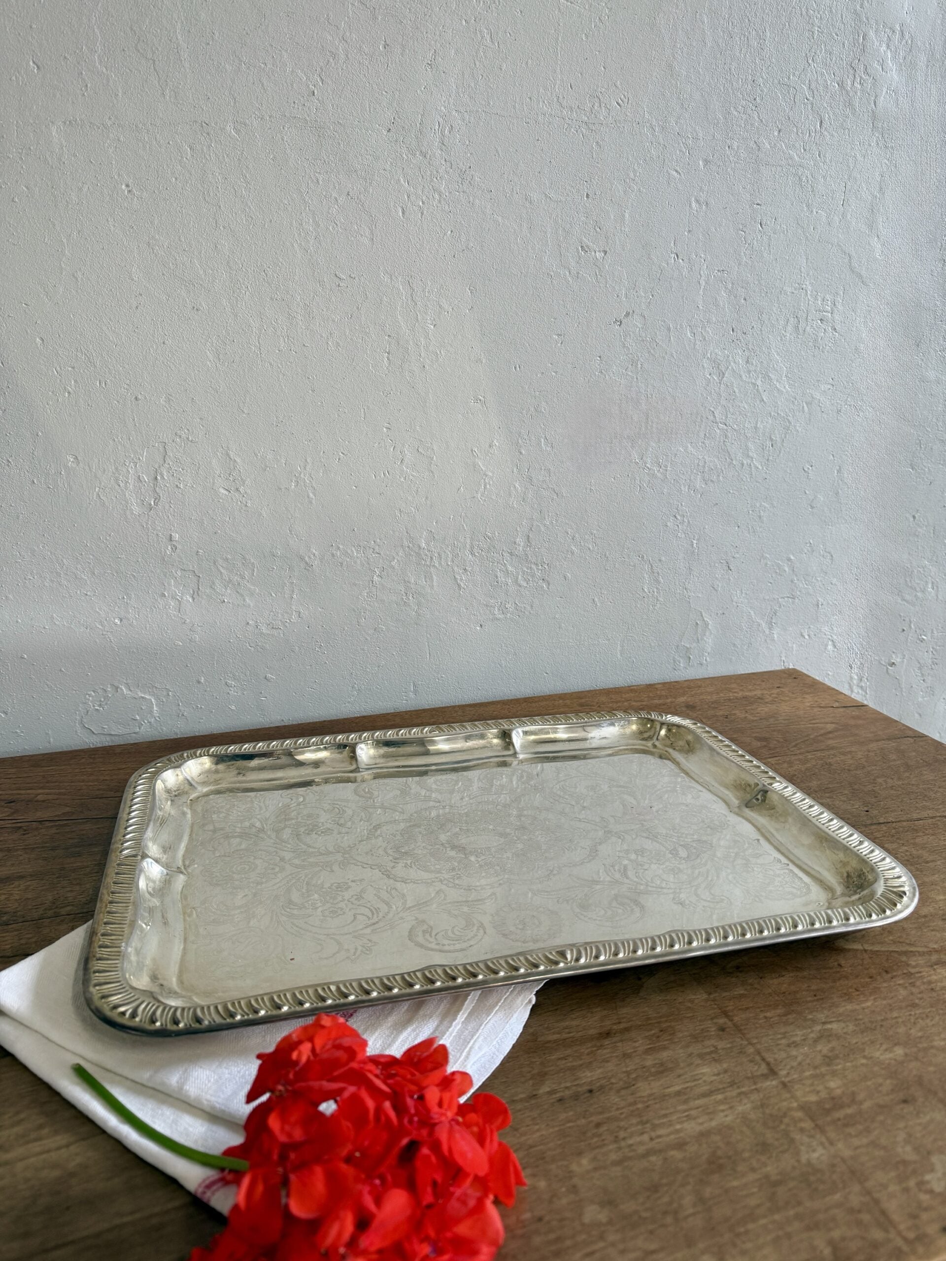 Plateau ancien en métal argenté ciselé, avec un décor fin qui lui donne du relief et une belle présence sur une table ou un buffet. Pièce de décoration ancienne facile à intégrer dans un intérieur esprit brocante.