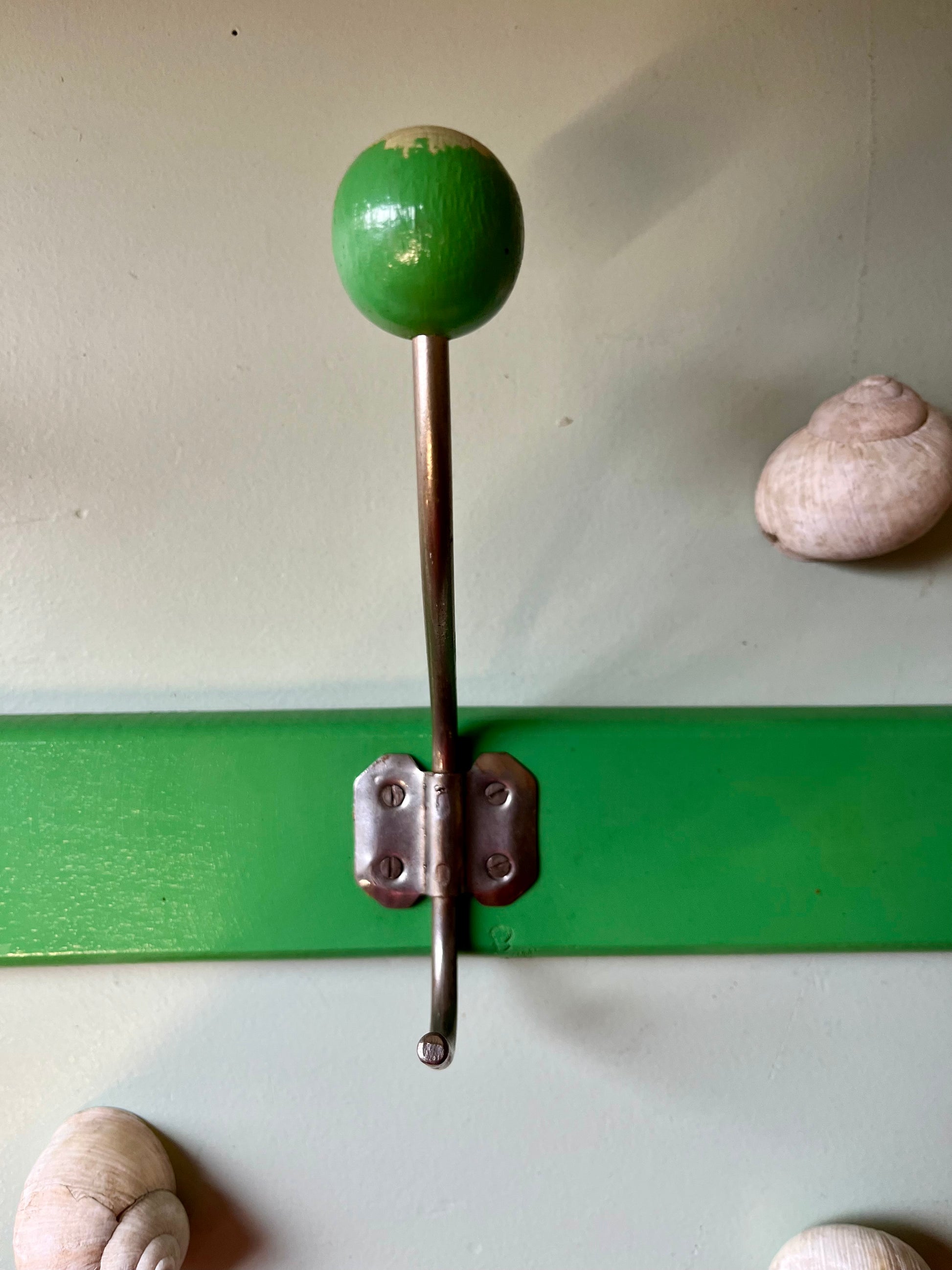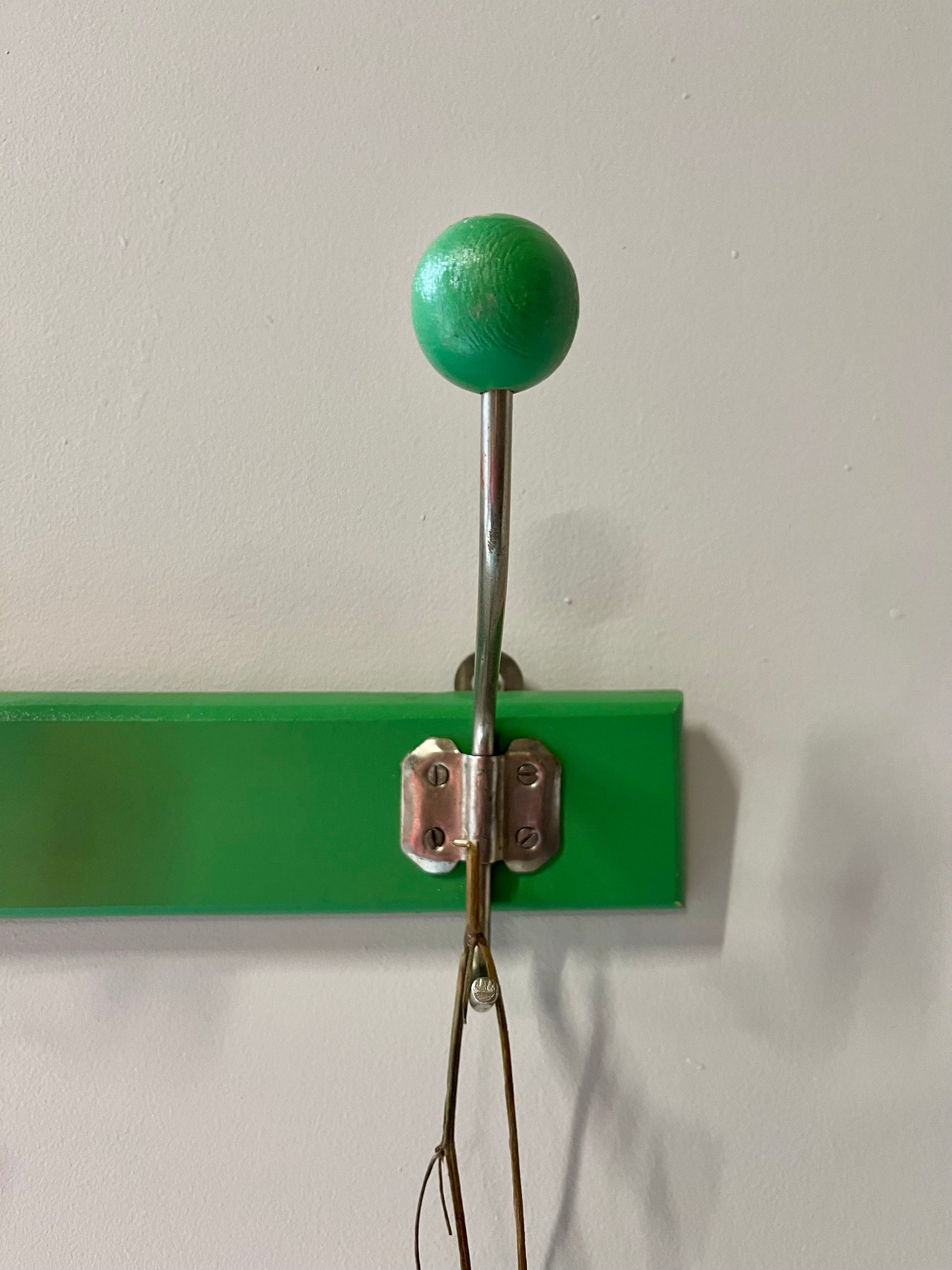 Porte-manteau mural ancien en bois peint vert, composé de trois patères en métal terminées par des boules en bois. Un modèle simple et plein de personnalité, typique des entrées d’école ou des maisons d’autrefois.