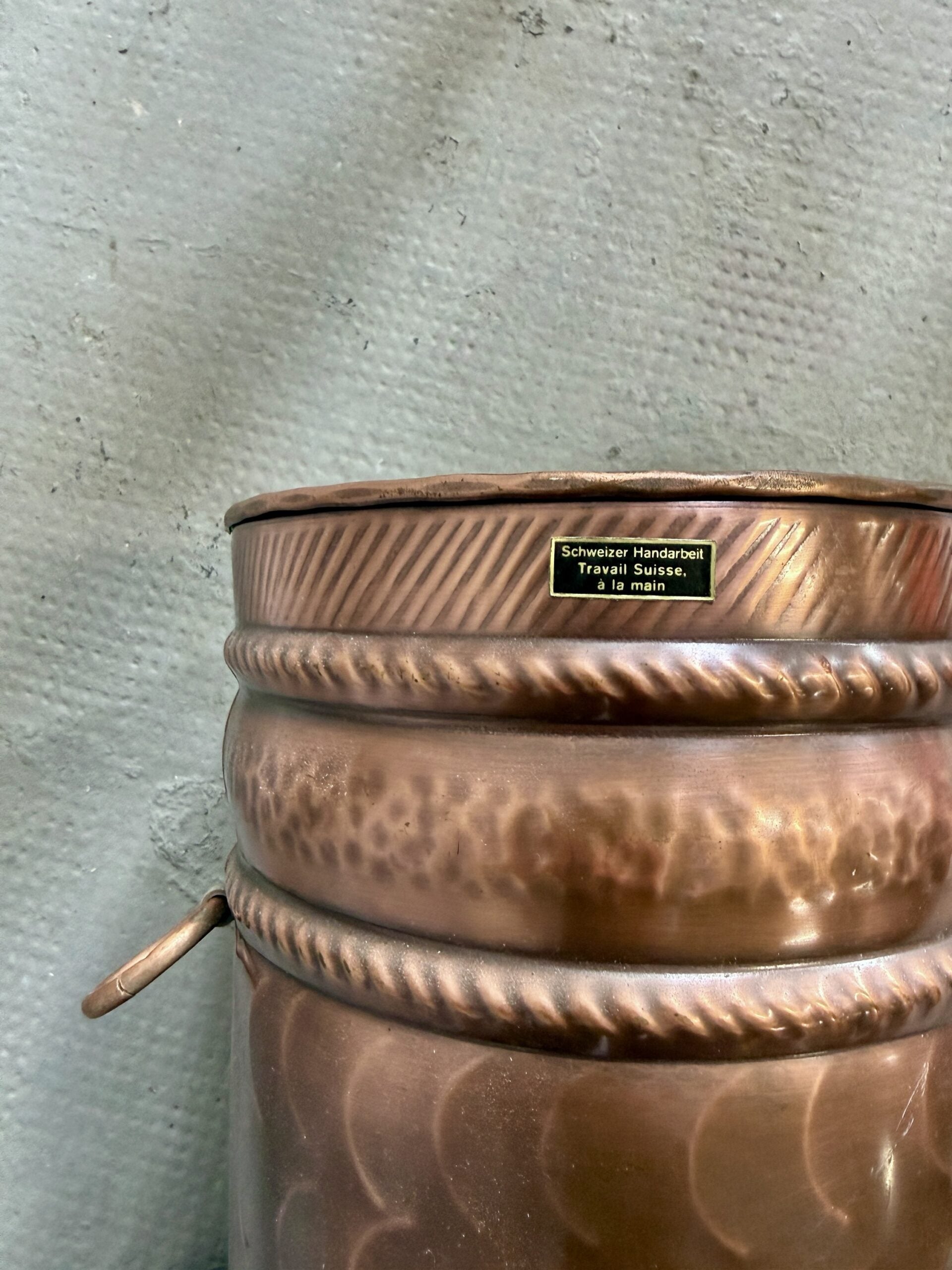 Porte-parapluies ancien en cuivre martelé, fabrication suisse artisanale, reconnaissable à son travail régulier et à ses motifs martelés en écaille. La mention « Schweizer Handarbeit » indique une production réalisée à la main, typique des objets utilitaires décoratifs suisses du XXᵉ siècle.