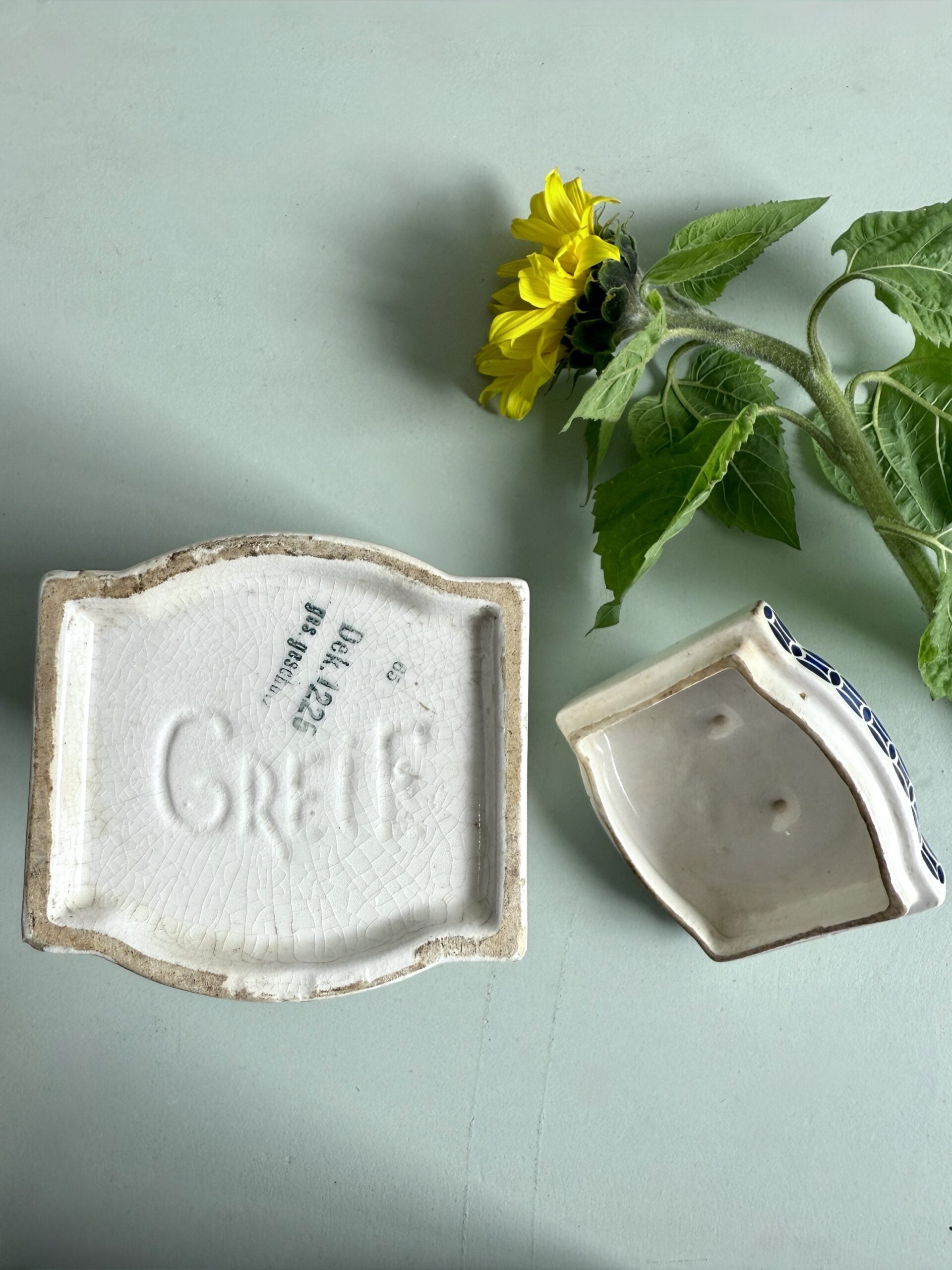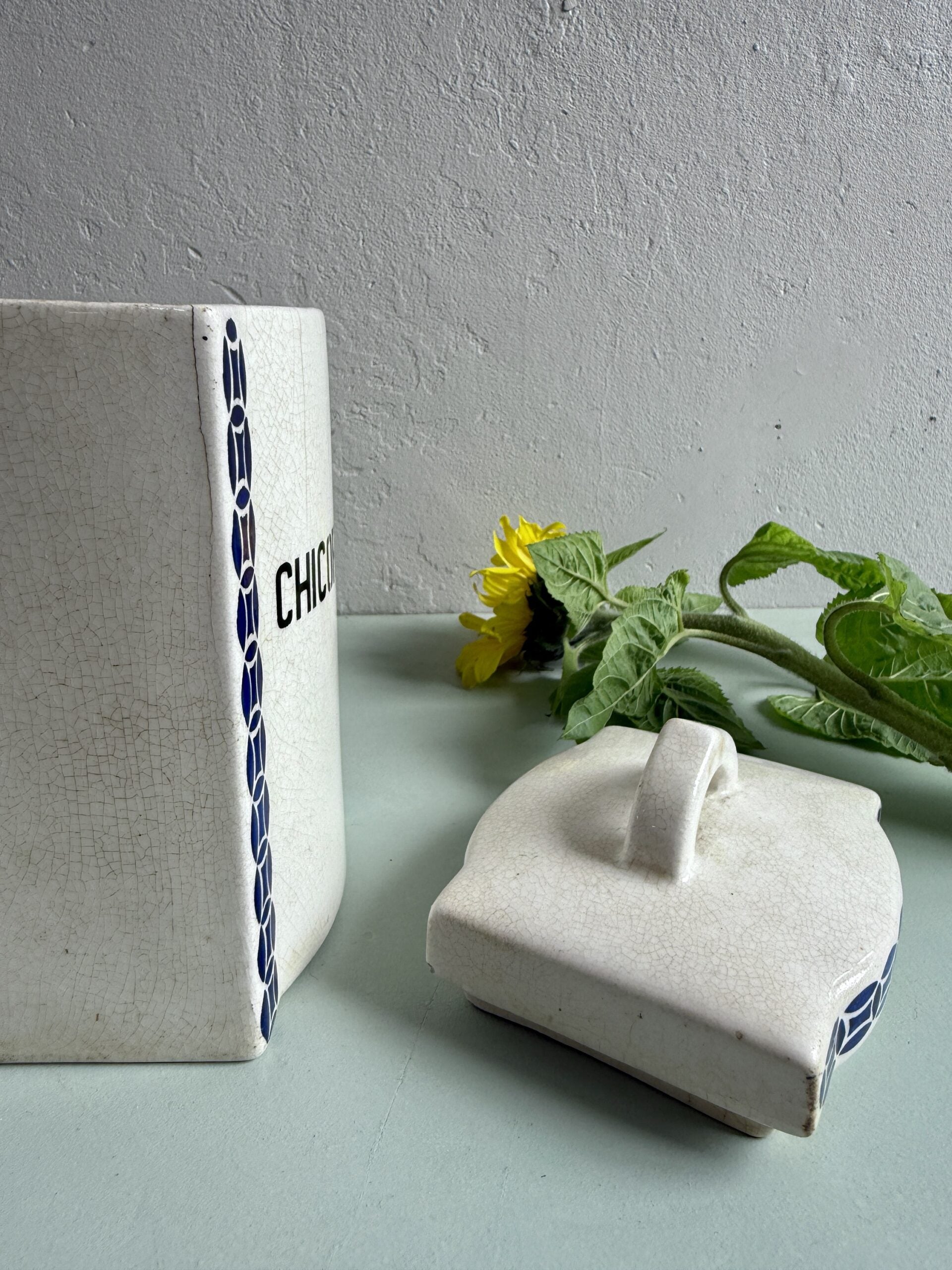 Pot à épices ancien en faïence blanche, dédié à la chicorée. Le pot est décoré d’une frise aux motifs géométriques bleus, typique des productions de la maison Greif, avec la mention Dek. 1225 inscrite sous le pot.