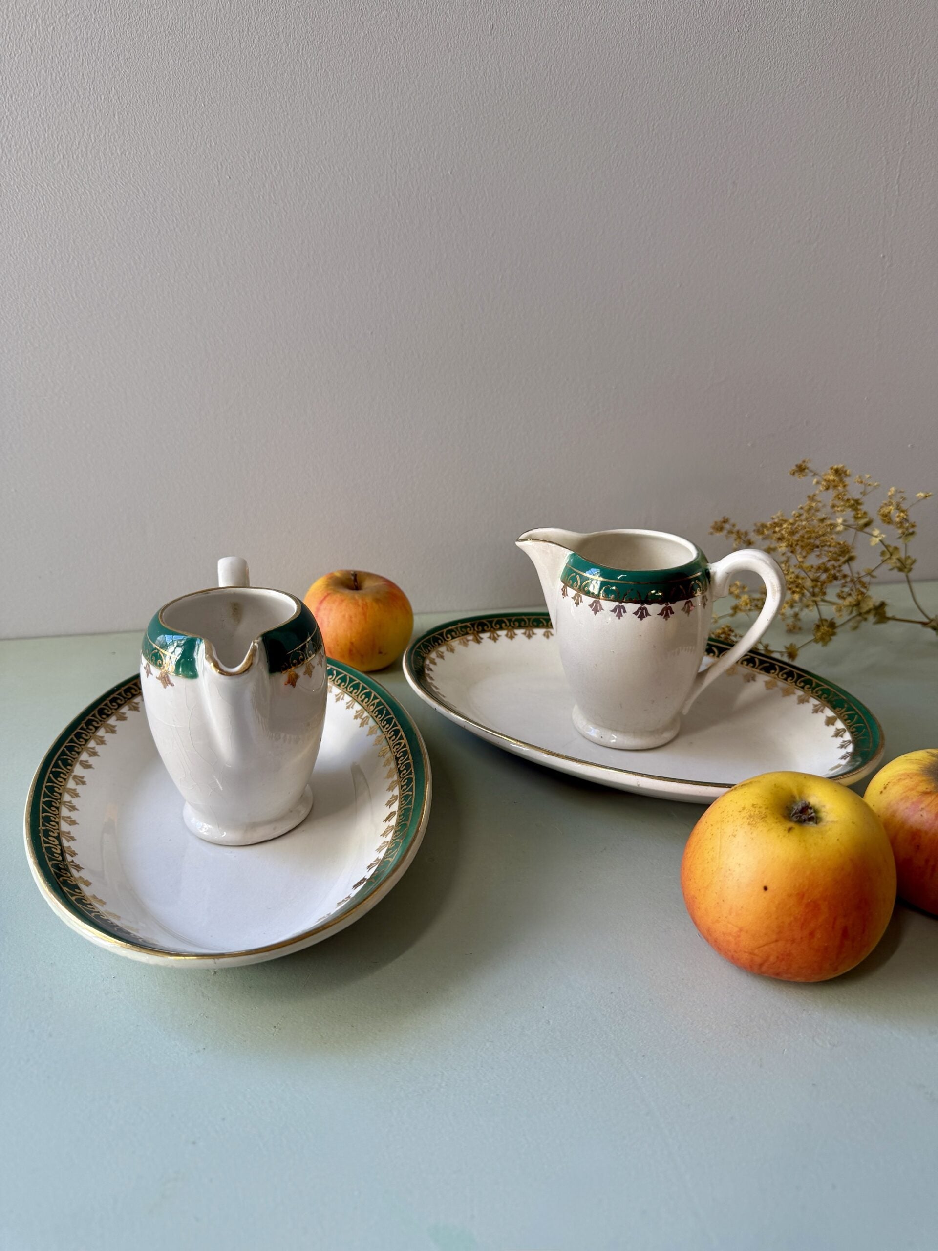Cet ensemble Sarreguemines de seconde main reflète tout le soin et la finesse des créations d’autrefois. Les petites marques du temps racontent leur histoire et leur donnent une vraie personnalité.Détails