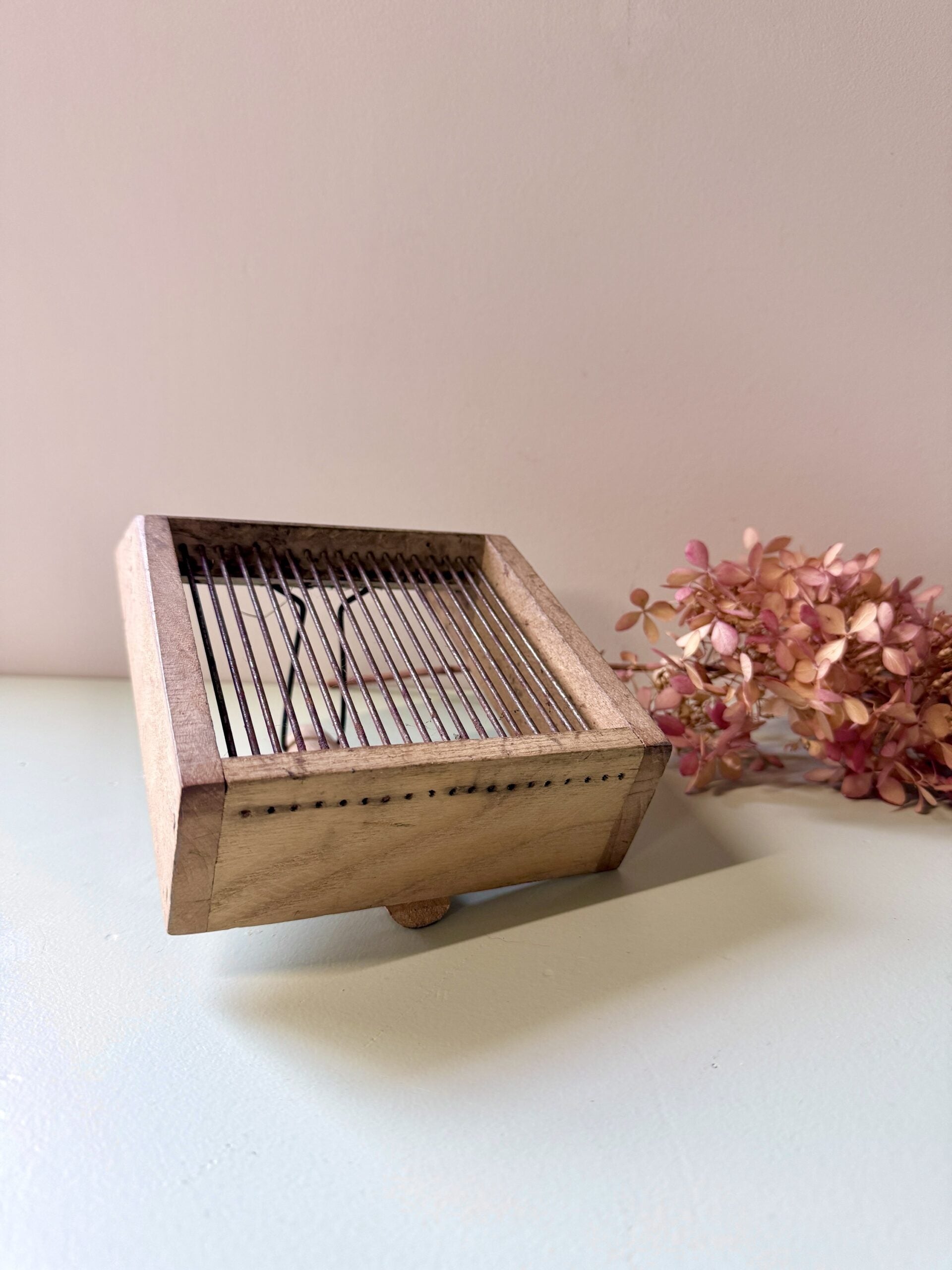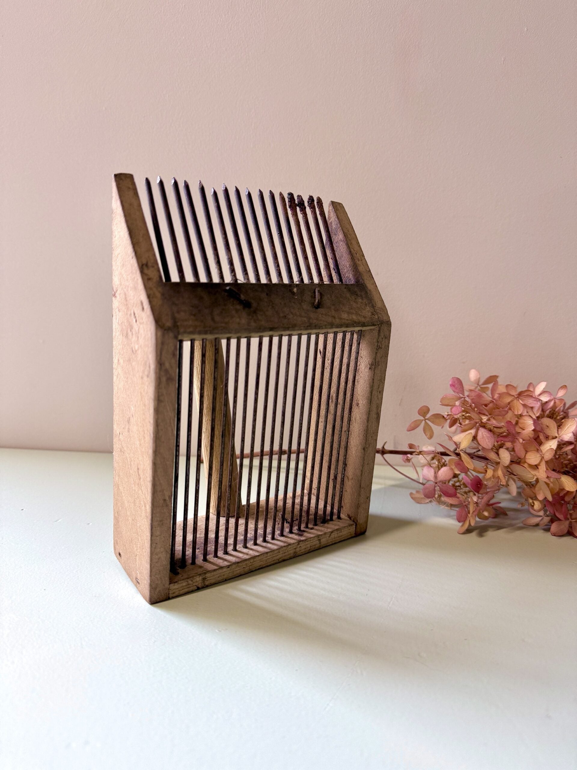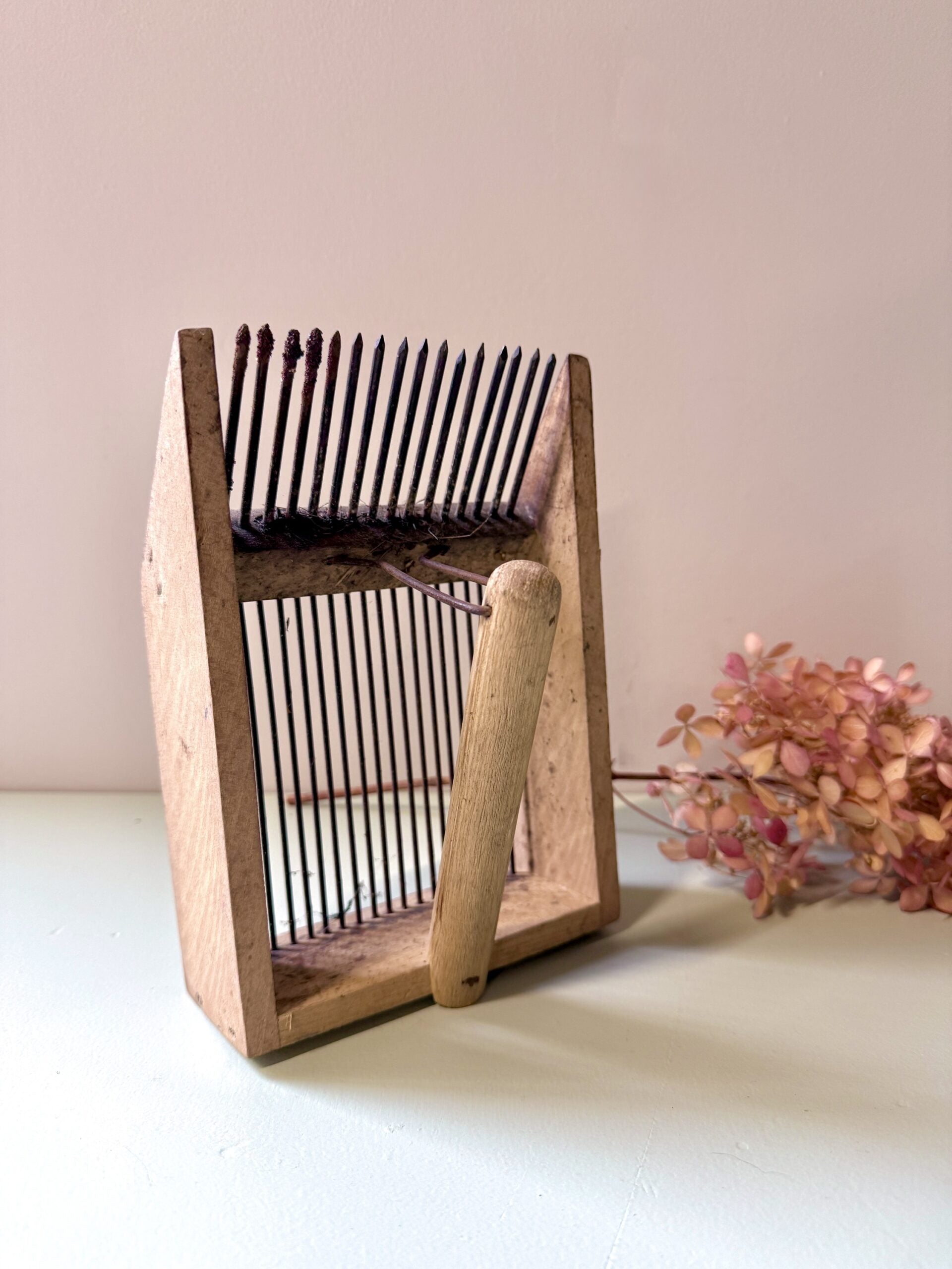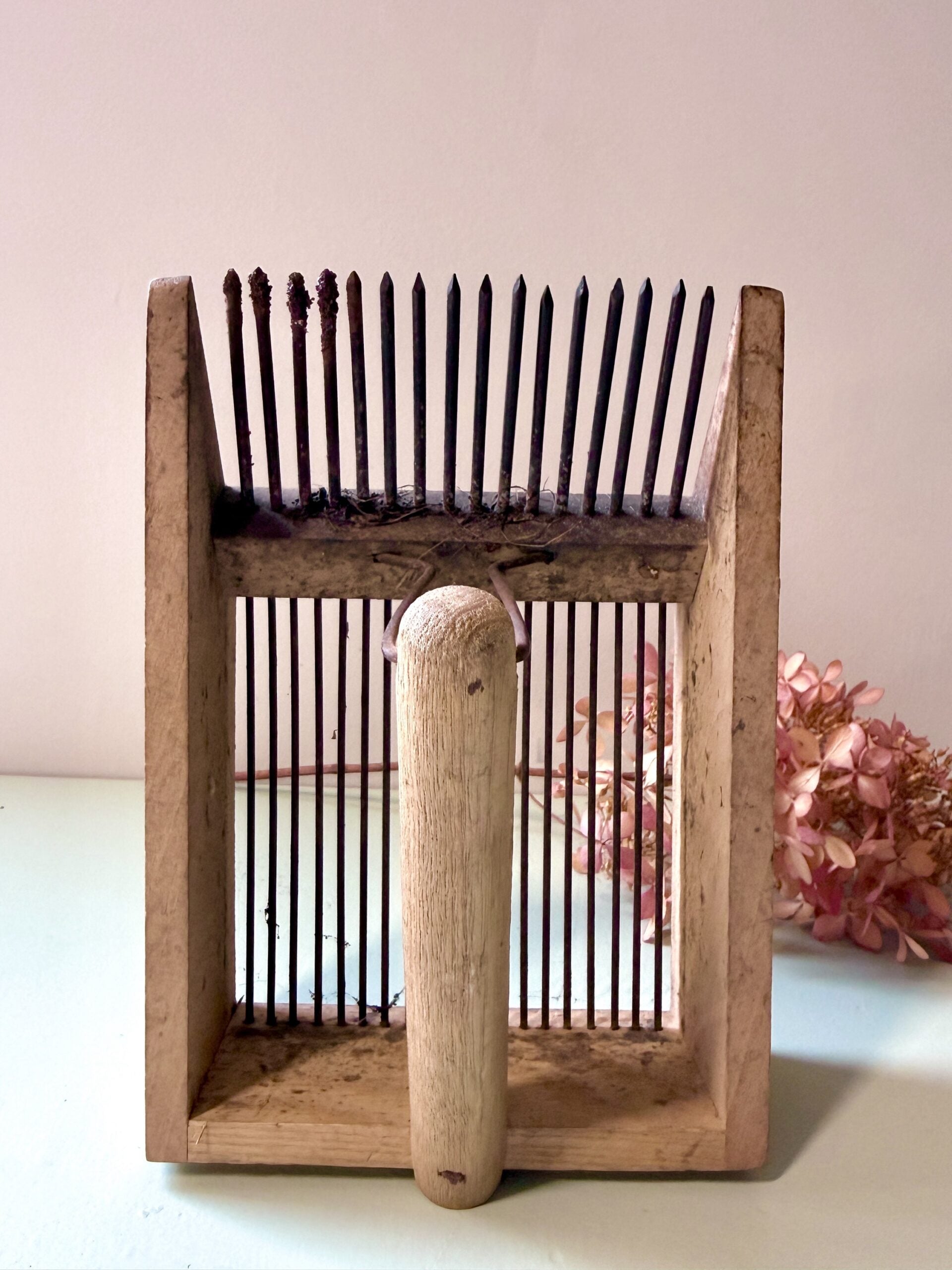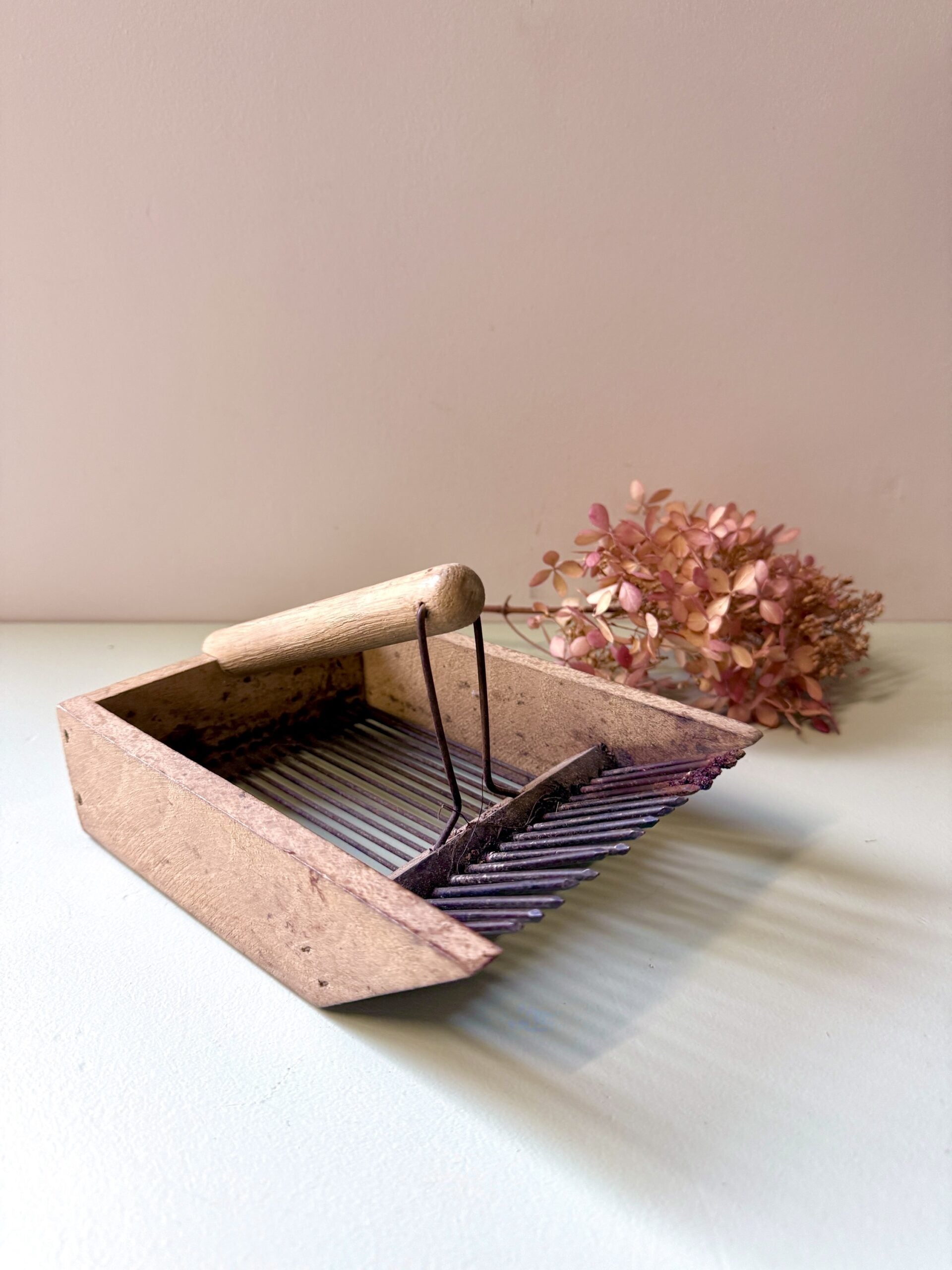 Peigne à myrtilles ancien, utilisé autrefois pour la cueillette des petits fruits en sous-bois. Un objet du quotidien rural, pensé pour être pratique, qui séduit aujourd’hui par son allure brute et sa patine naturelle.Le contraste entre le bois marqué par le temps et le fer oxydé lui donne un vrai style. Posé sur une étagère, dans une cuisine ou accroché au mur, il apporte ce petit supplément d’âme qu’on aime dans les objets qui ont vraiment servi.