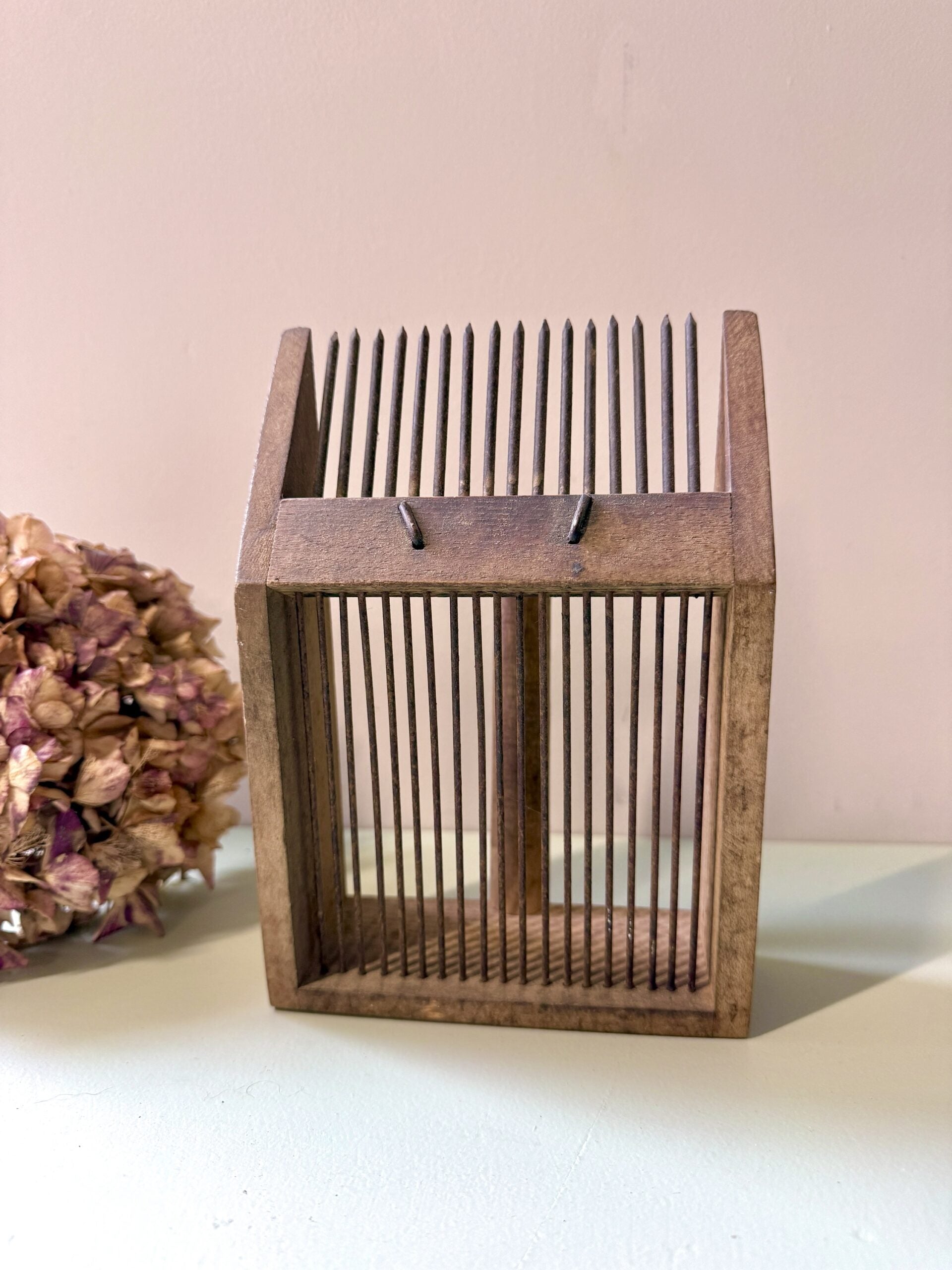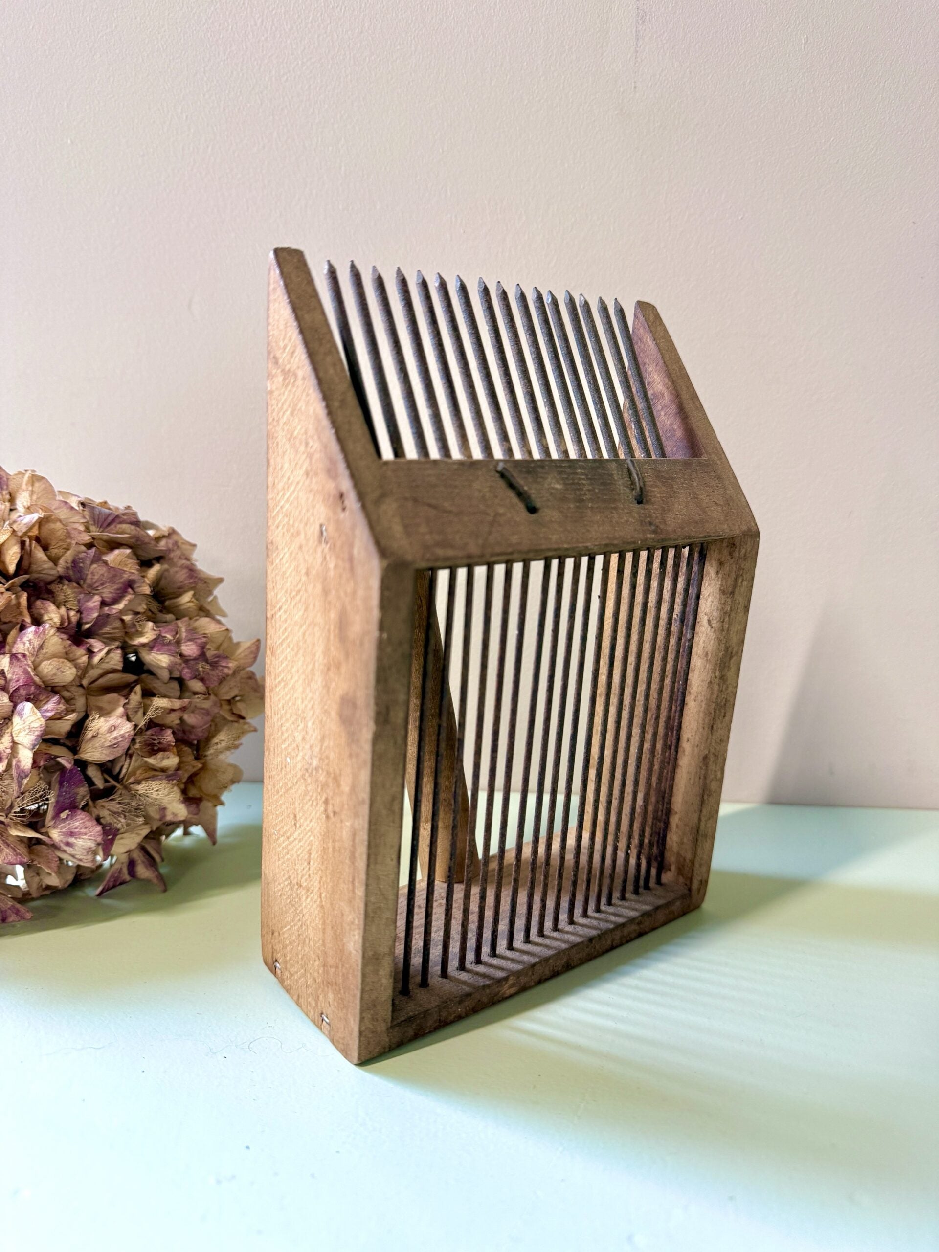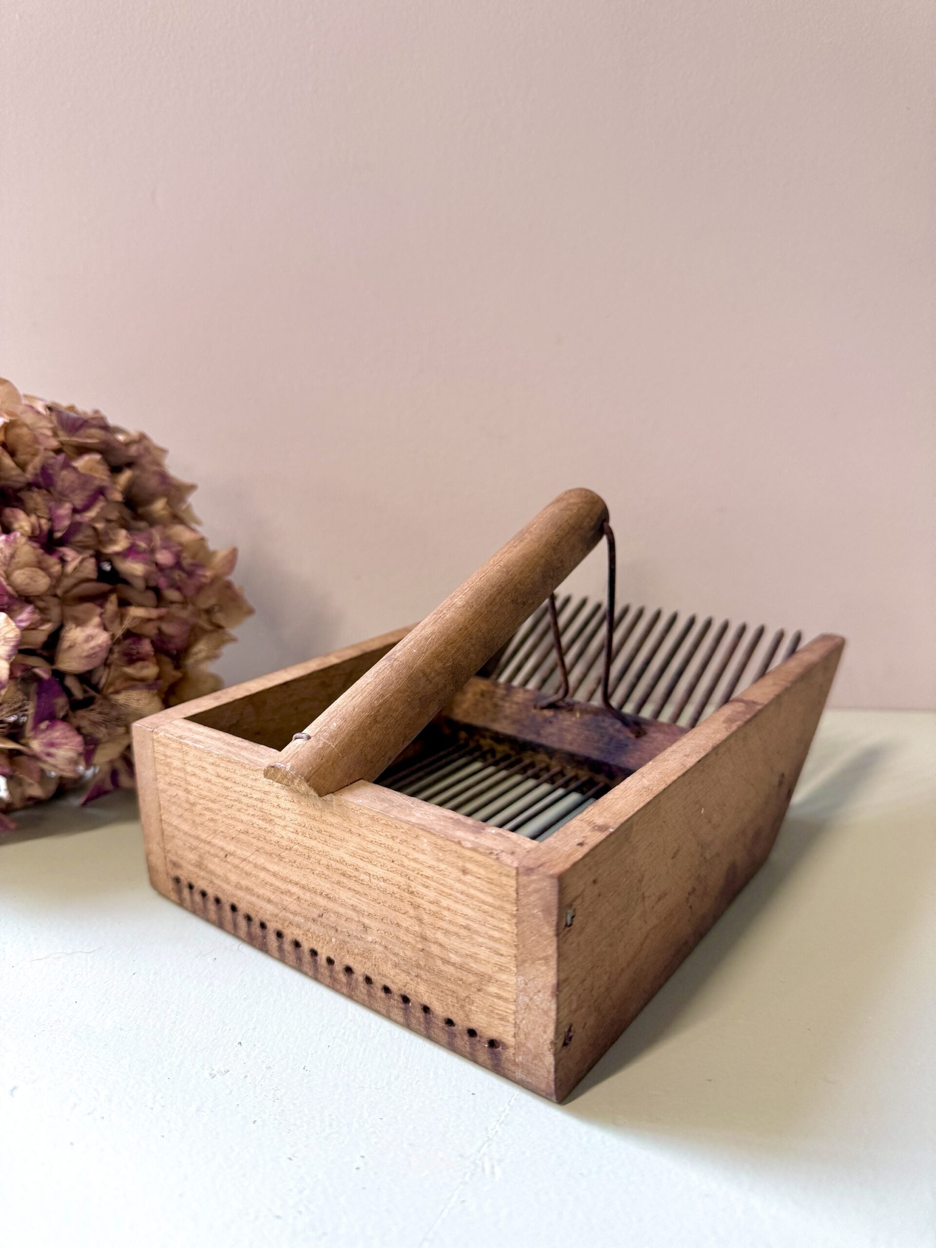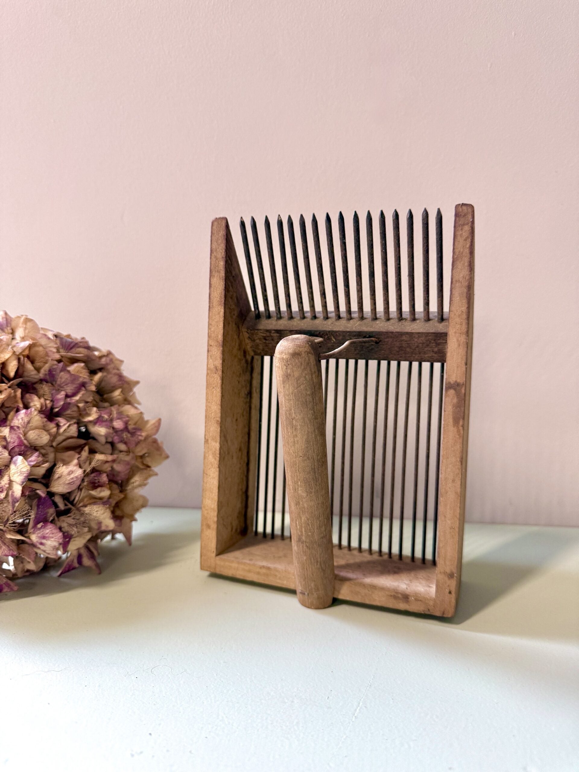 Peigne ancien destiné à la récolte des petits fruits, fabriqué en bois avec des dents en fer. Un outil simple, robuste, qui porte clairement les marques de son usage passé. Le bois est patiné, le fer oxydé par endroits, et l’ensemble dégage ce charme brut des objets faits pour durer.Aujourd’hui, il trouve facilement une seconde vie en décoration : posé sur une étagère, dans une cuisine ou accroché au mur, il apporte une touche rustique et authentique, sans en faire trop.