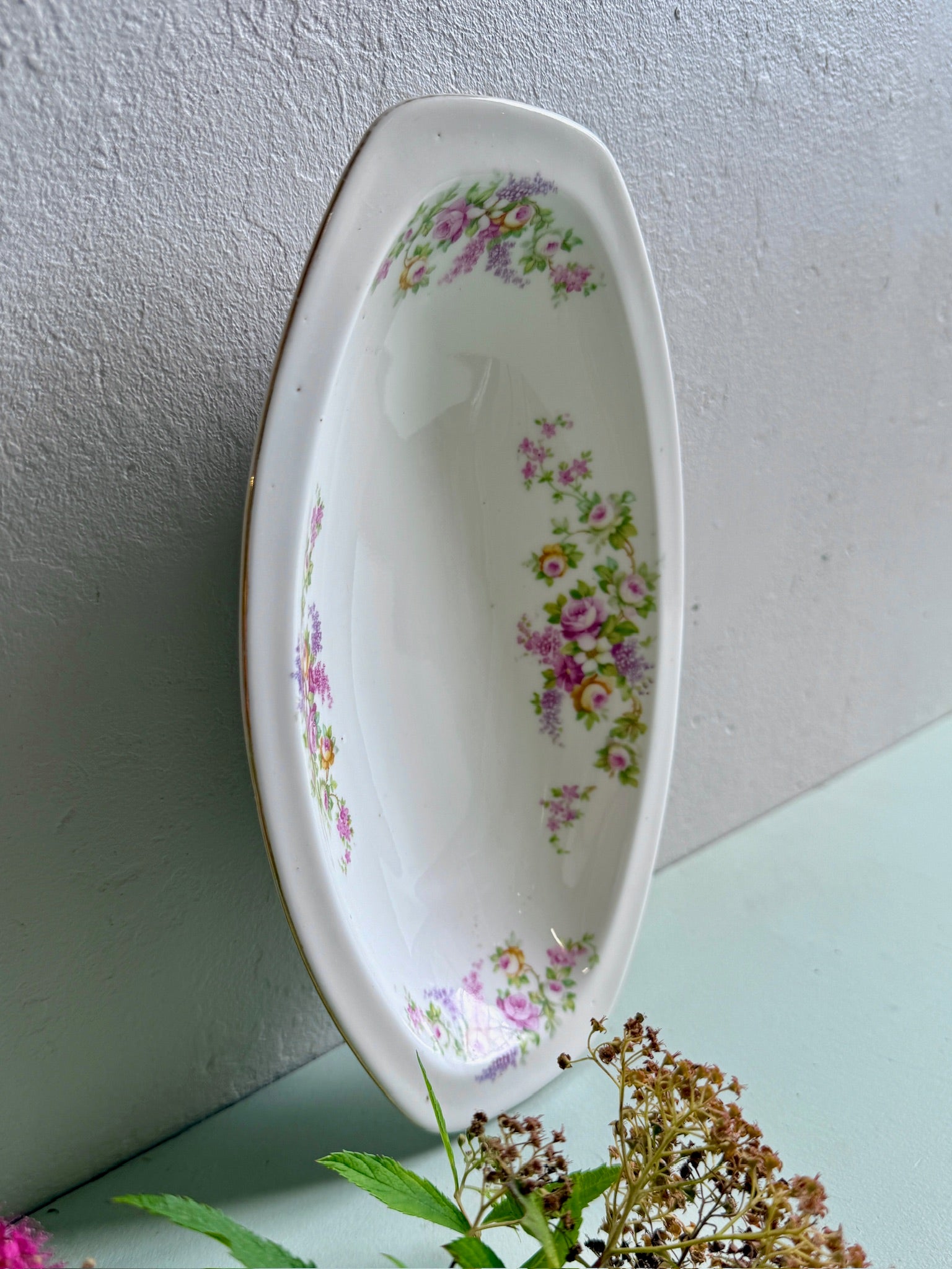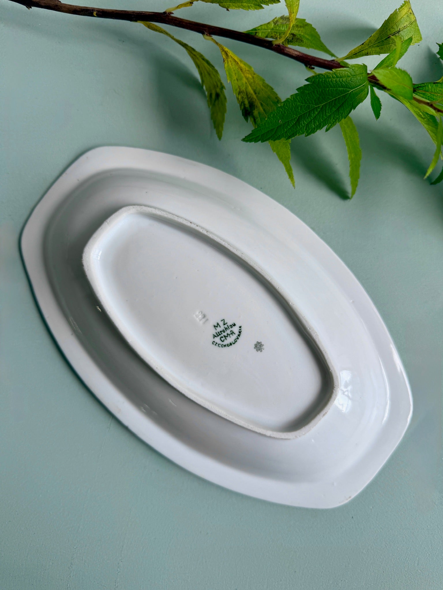 Ravier ancien en faïence blanche décoré d’une frise florale délicate dans les tons rose, violet et vert, soulignée d’un liseré doré. Ce type de production était courant dans les manufactures de Bohême au début du XXᵉ siècle, reconnues pour leurs décors fins et accessibles, destinés aux tables du quotidien soignées.