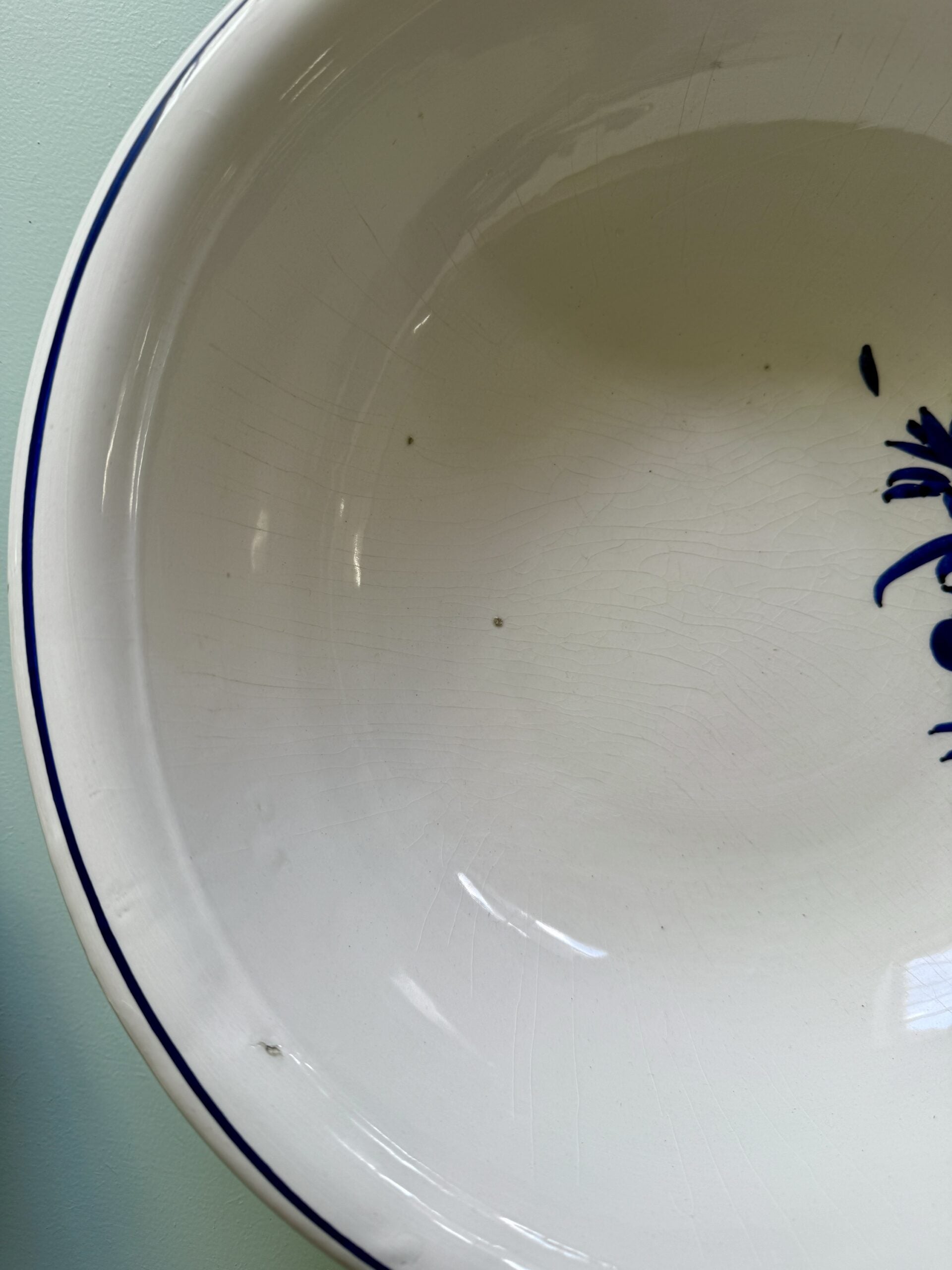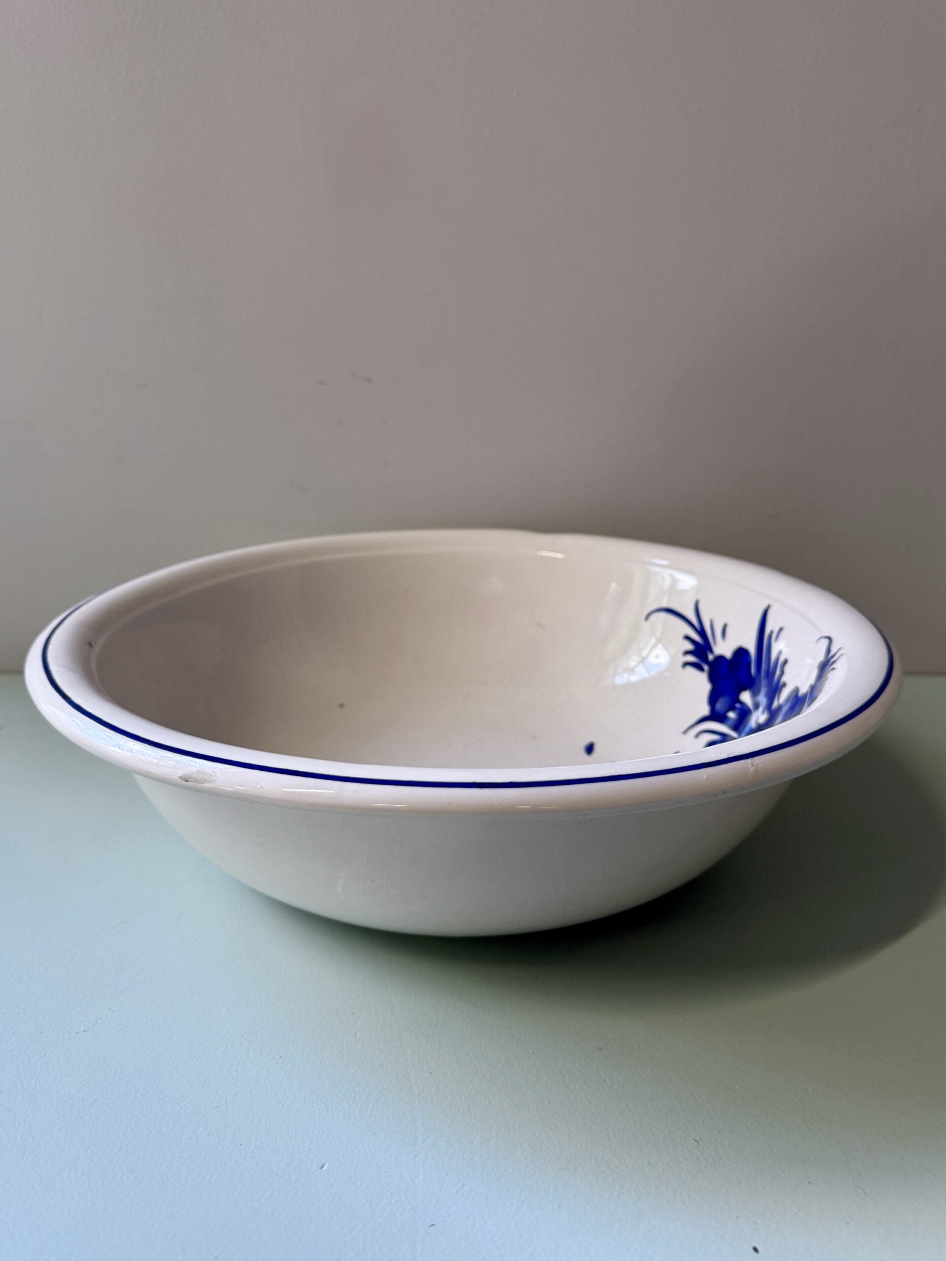 À noter : le saladier présente quatre impacts dans l’émail à l’intérieur, visibles mais sans incidence sur son utilisation. Ces marques sont liées à son ancienneté.