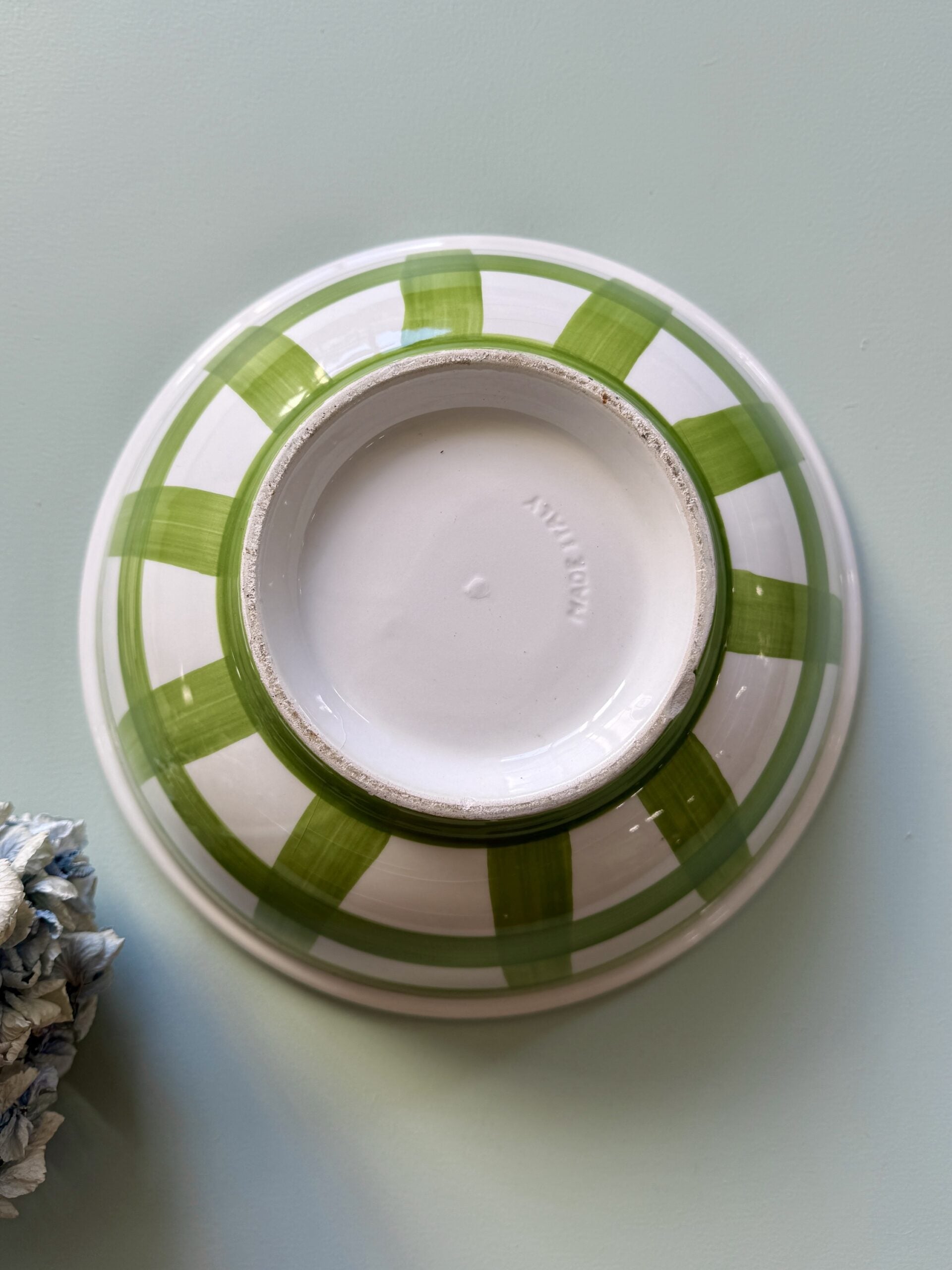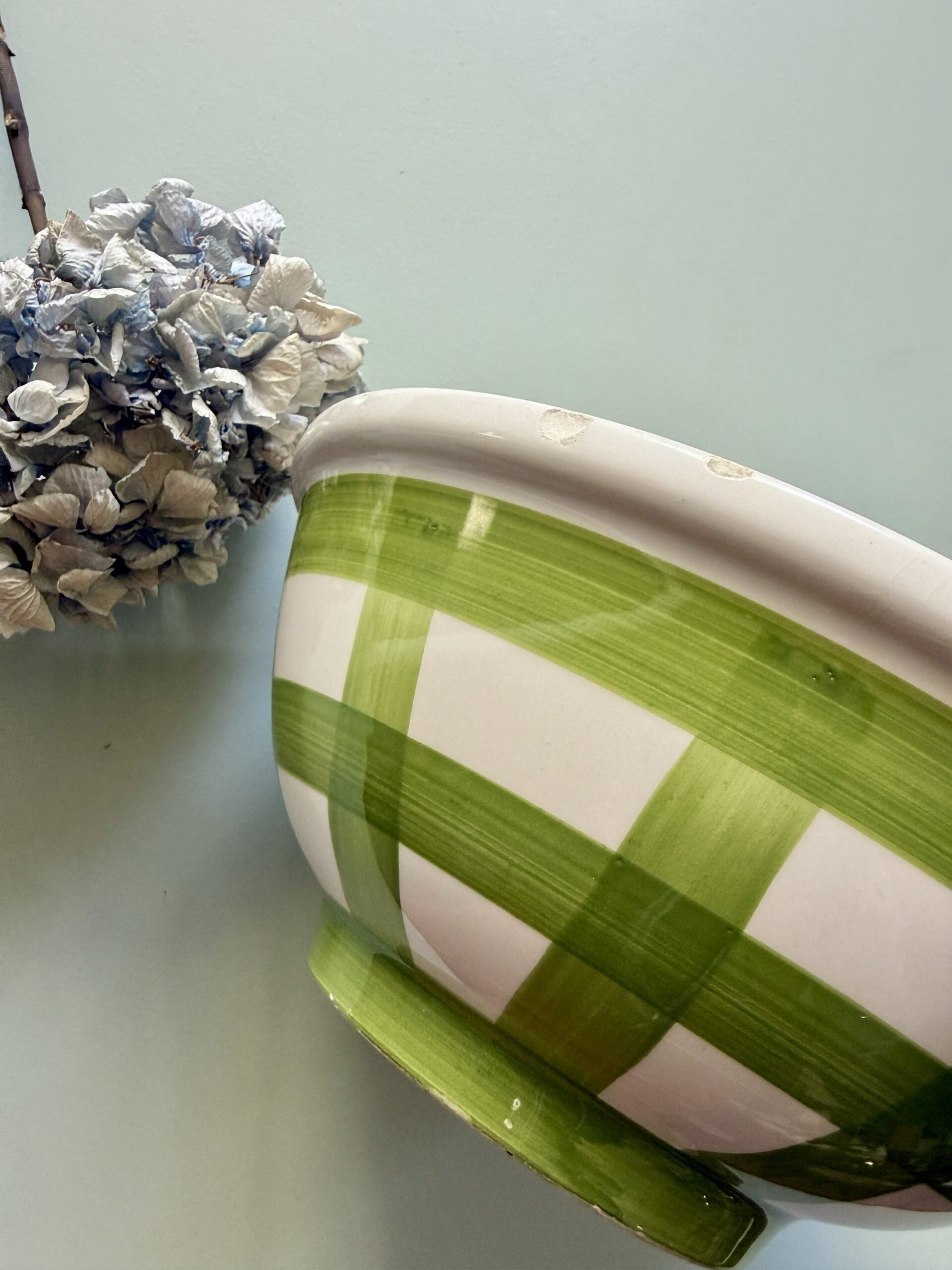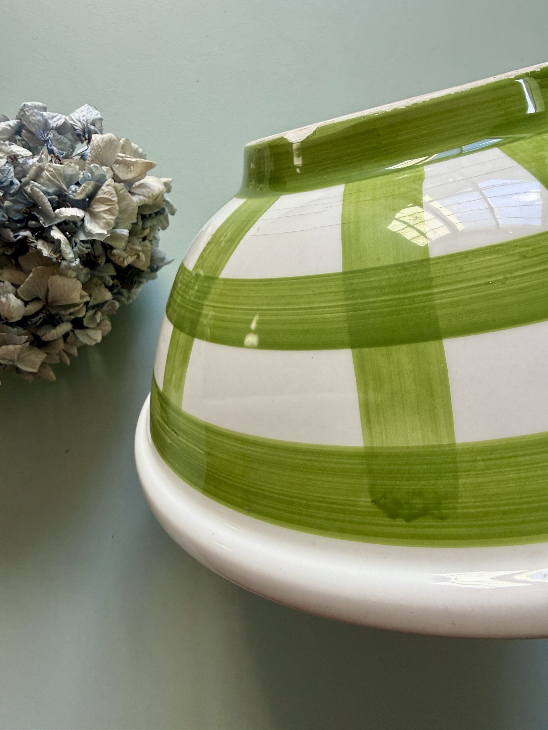 On aime ce saladier en faïence verte à carreaux pour son décor graphique peint à la main, à la fois simple et plein de caractère. Son vert vif contraste élégamment avec le fond blanc, apportant une touche fraîche et authentique à une table ou à une cuisine.Idéal en saladier, en coupe à fruits ou même en élément décoratif, il trouvera naturellement sa place dans un intérieur au style campagne, vintage ou maison de famille. Les traces du temps participent à son charme et rappellent son histoire.