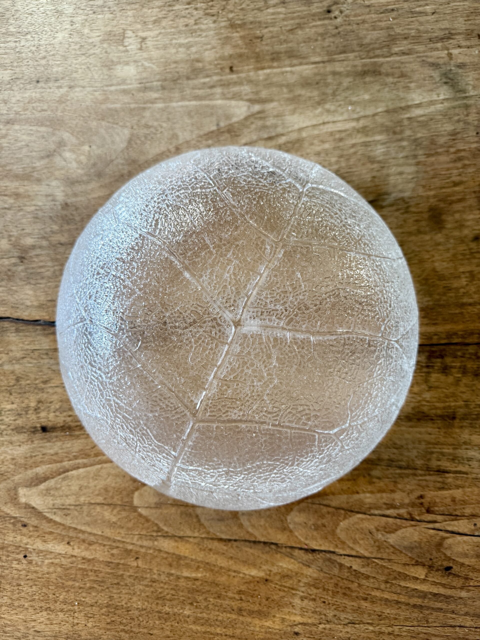 Saladier en verre texturé en forme de feuille, au design délicat et intemporel. Une pièce vintage idéale pour apporter une touche nature et élégante à une table ou à une cuisine.Un saladier vintage qui attire l’œil