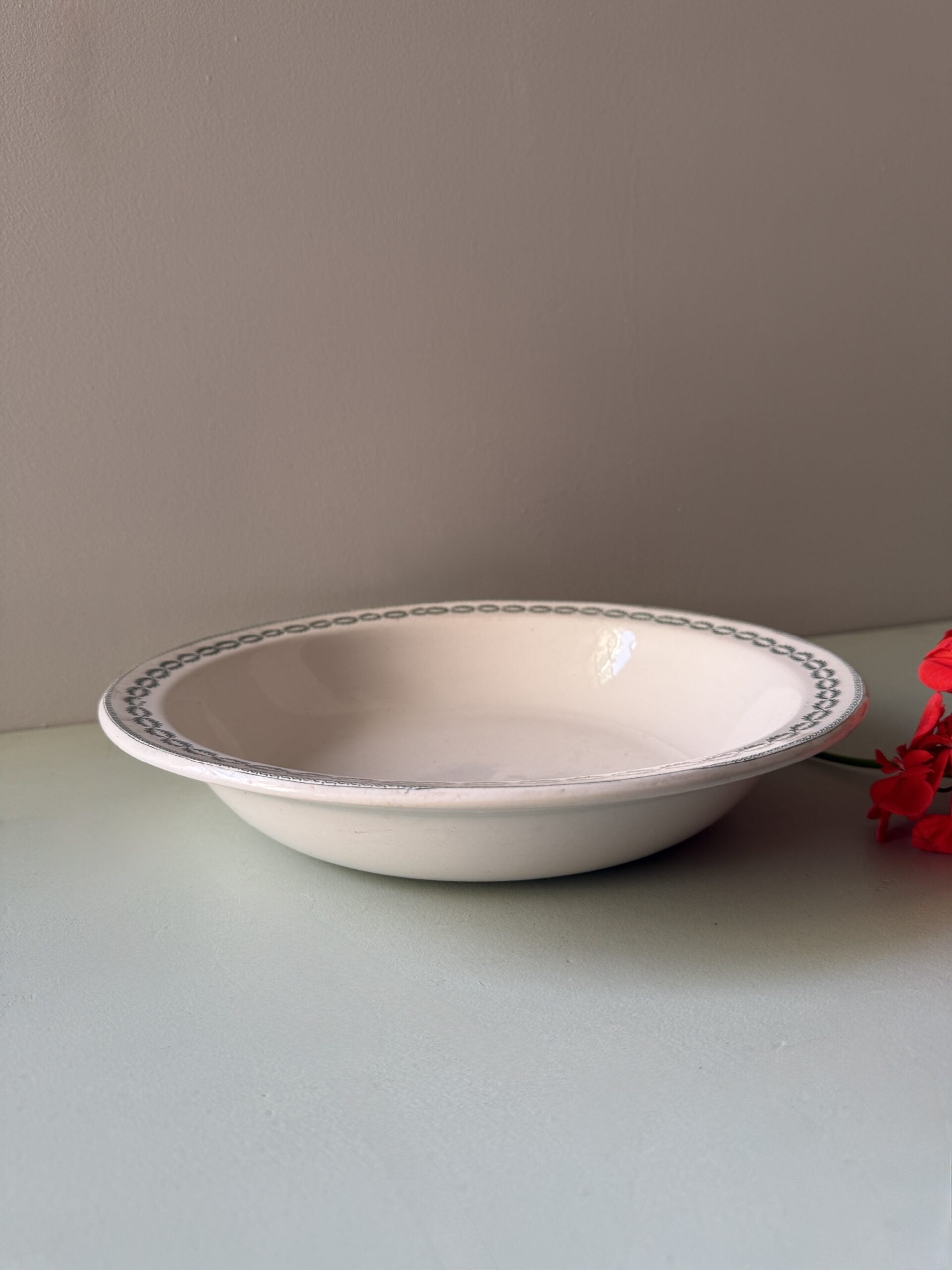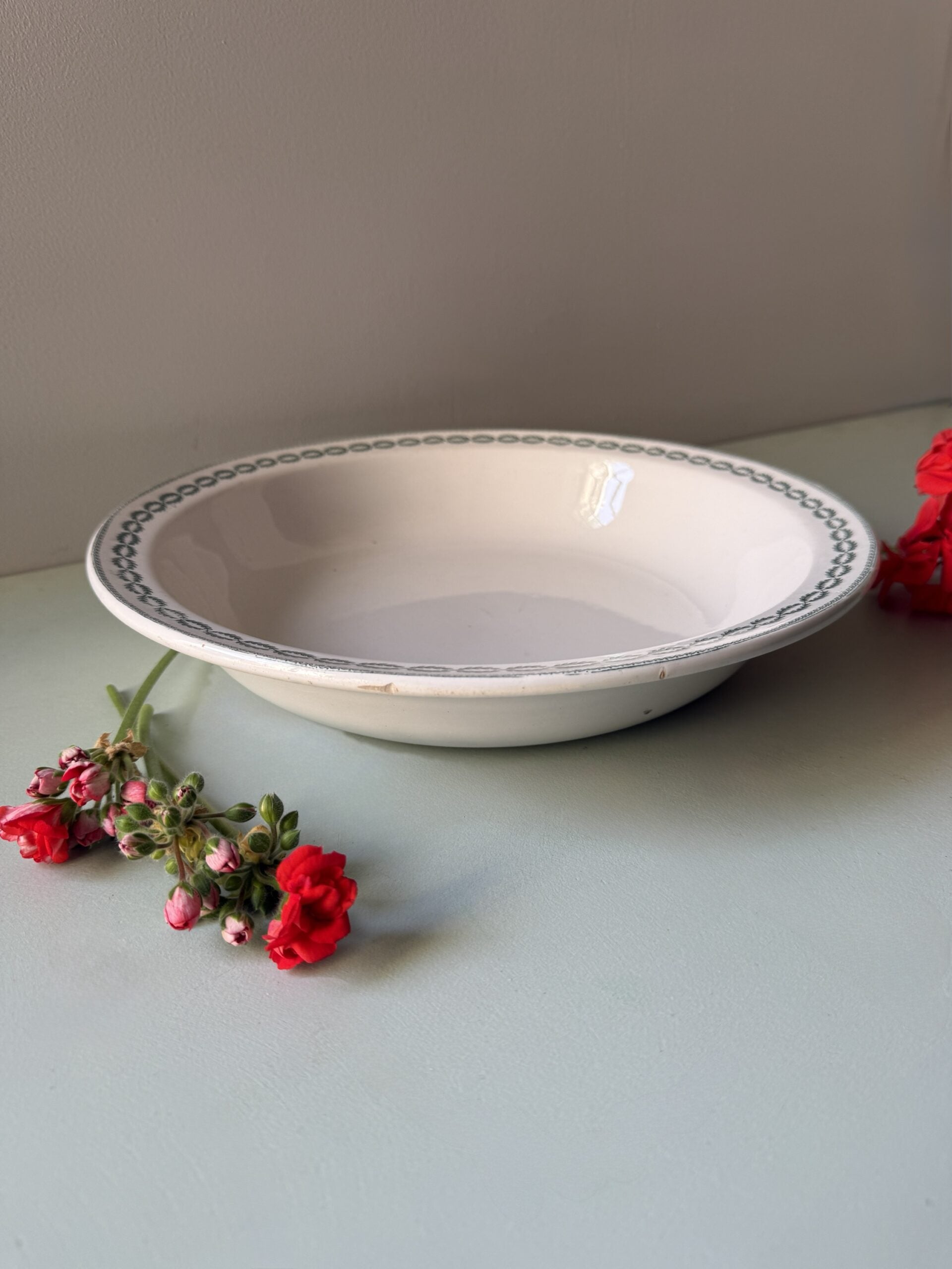 Saladier Sarreguemines Nobilis plein de charme, avec son liseré vert emblématique et cette patine discrète qui raconte son histoire.• Faïence ancienne au style authentique, idéale pour une table pleine de caractère.