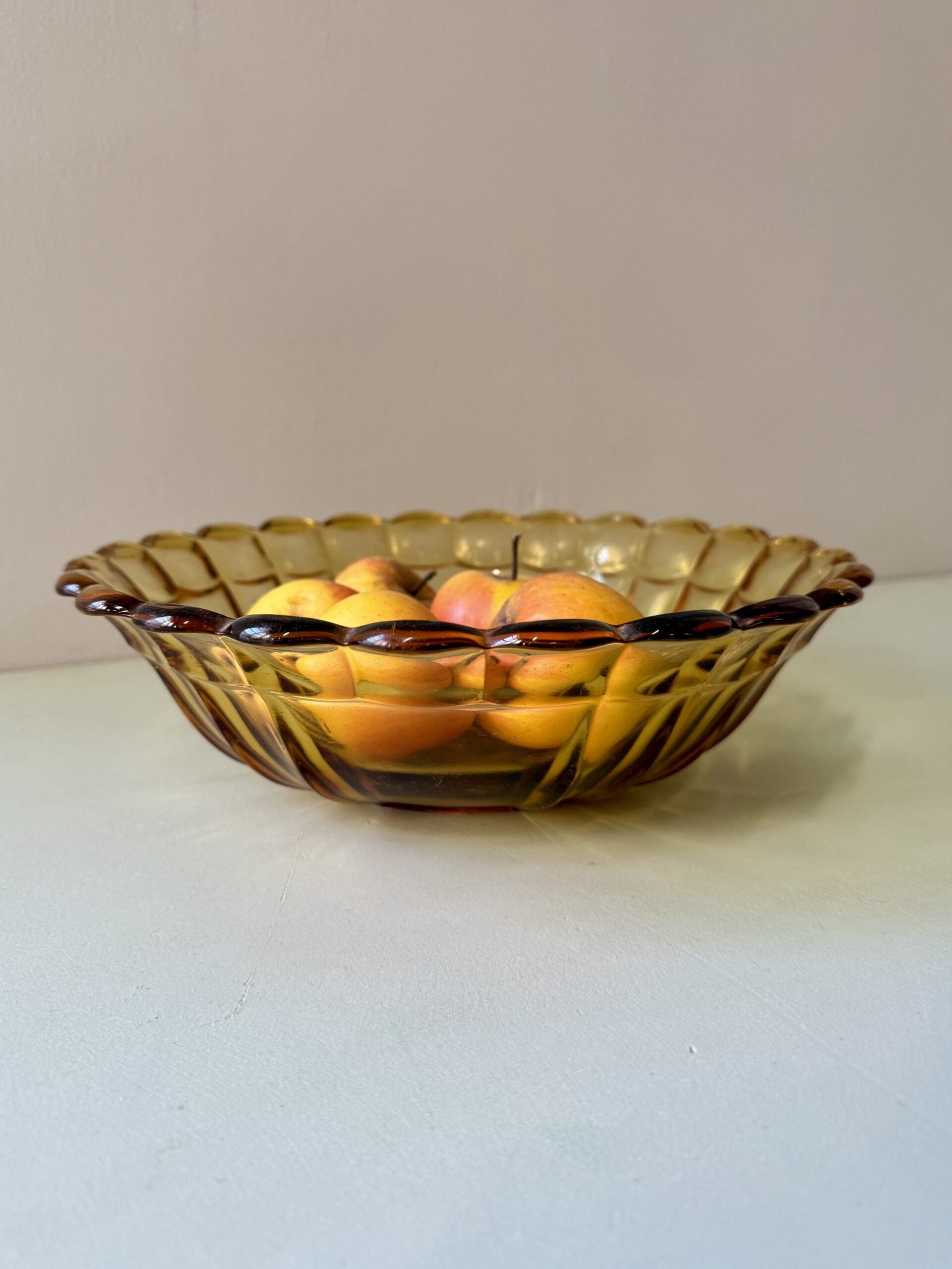 Saladier en verre ambré ciselé, typique des arts de la table des années 60–70. Le relief du verre ancien capte la lumière et donne une belle présence au centre d’une table.