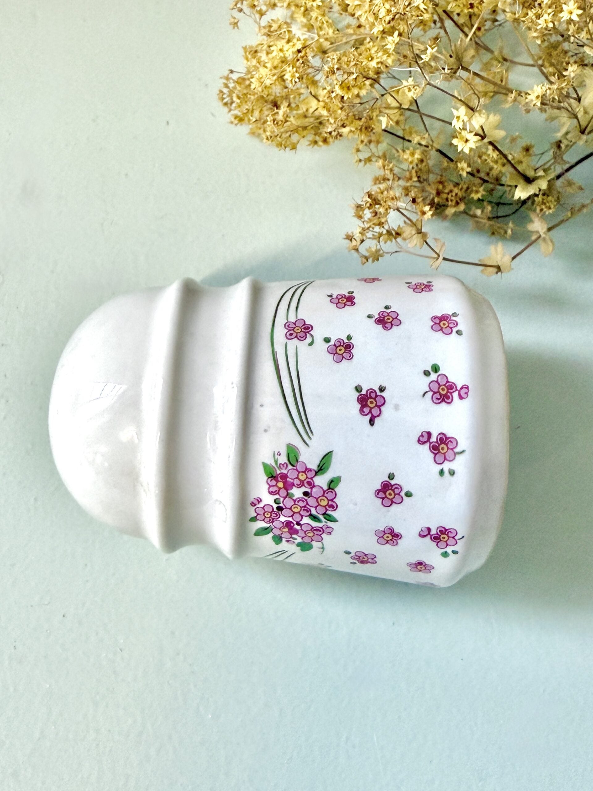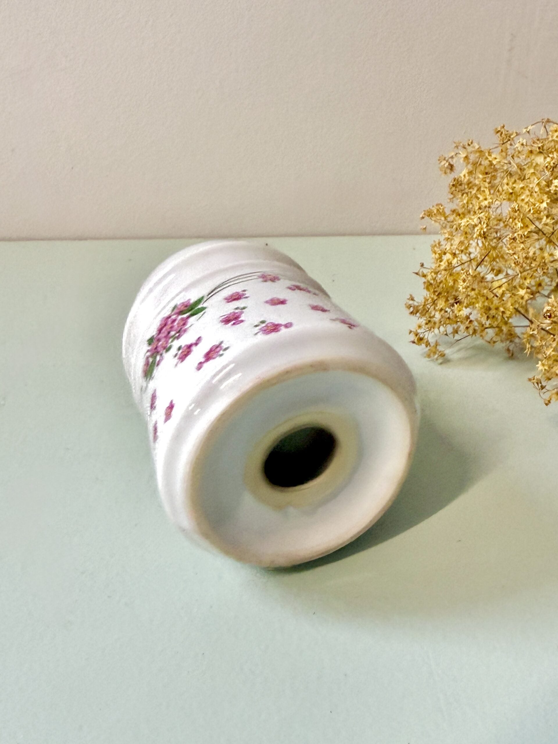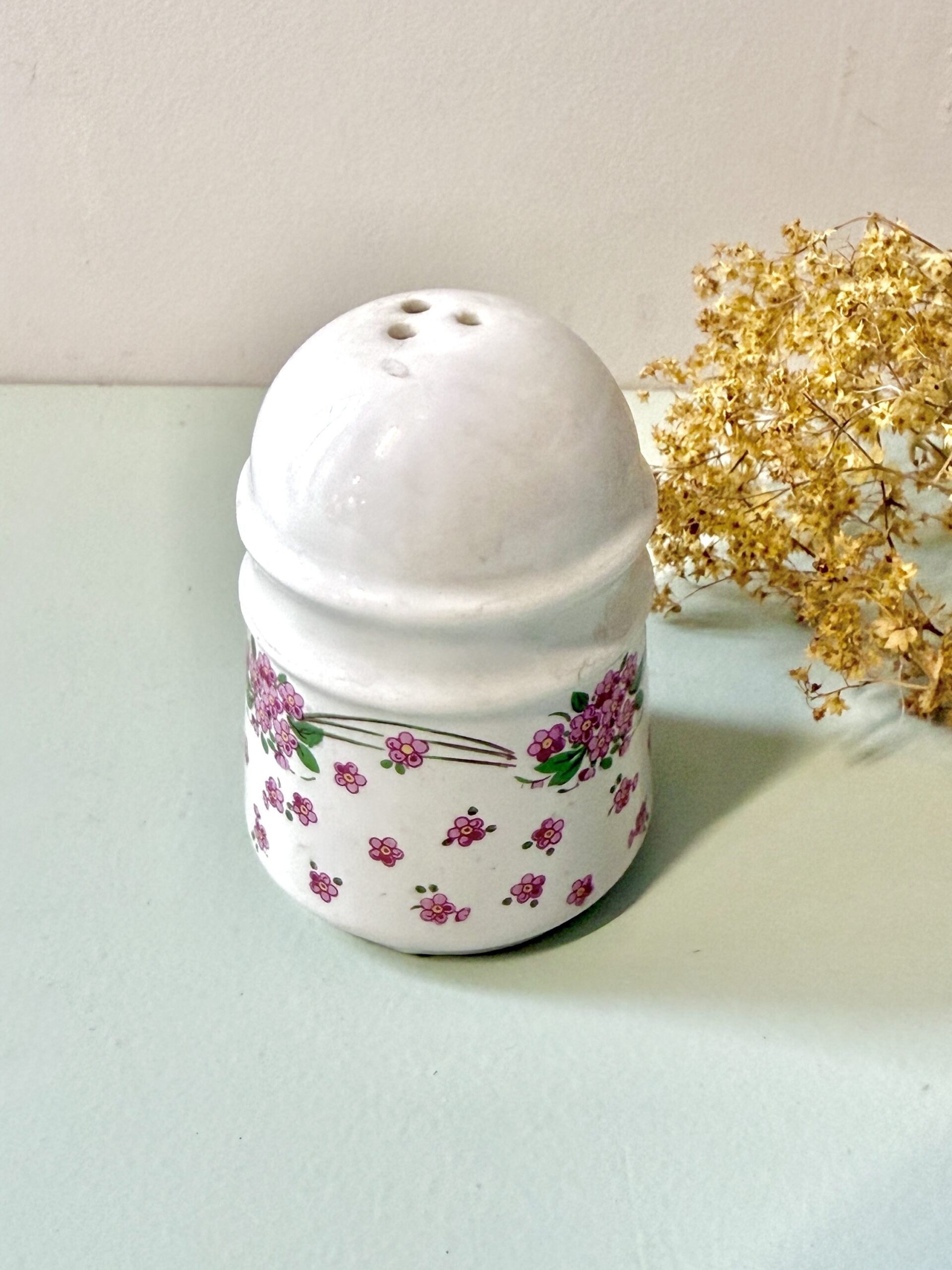 Salière ancienne en porcelaine blanche avec décor fleuri rose et vert. Motif délicat typique de la vaisselle ancienne, parfait pour une table du quotidien à mixer avec d’autres pièces chinées.