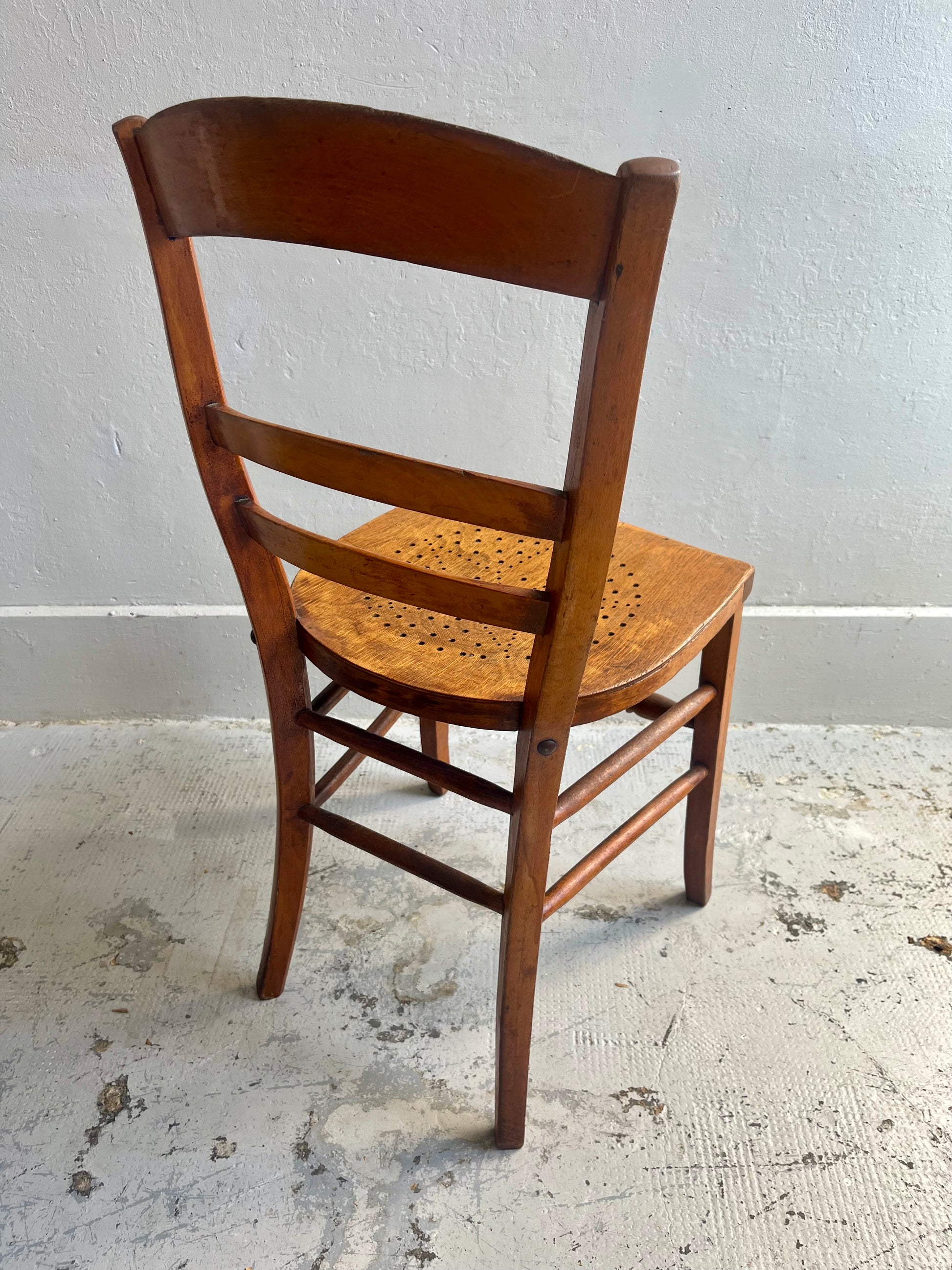 Chaise bistrot ancienne en bois avec assise perforée, un modèle qu’on retrouvait souvent dans les cafés pour sa robustesse et son côté pratique au quotidien.