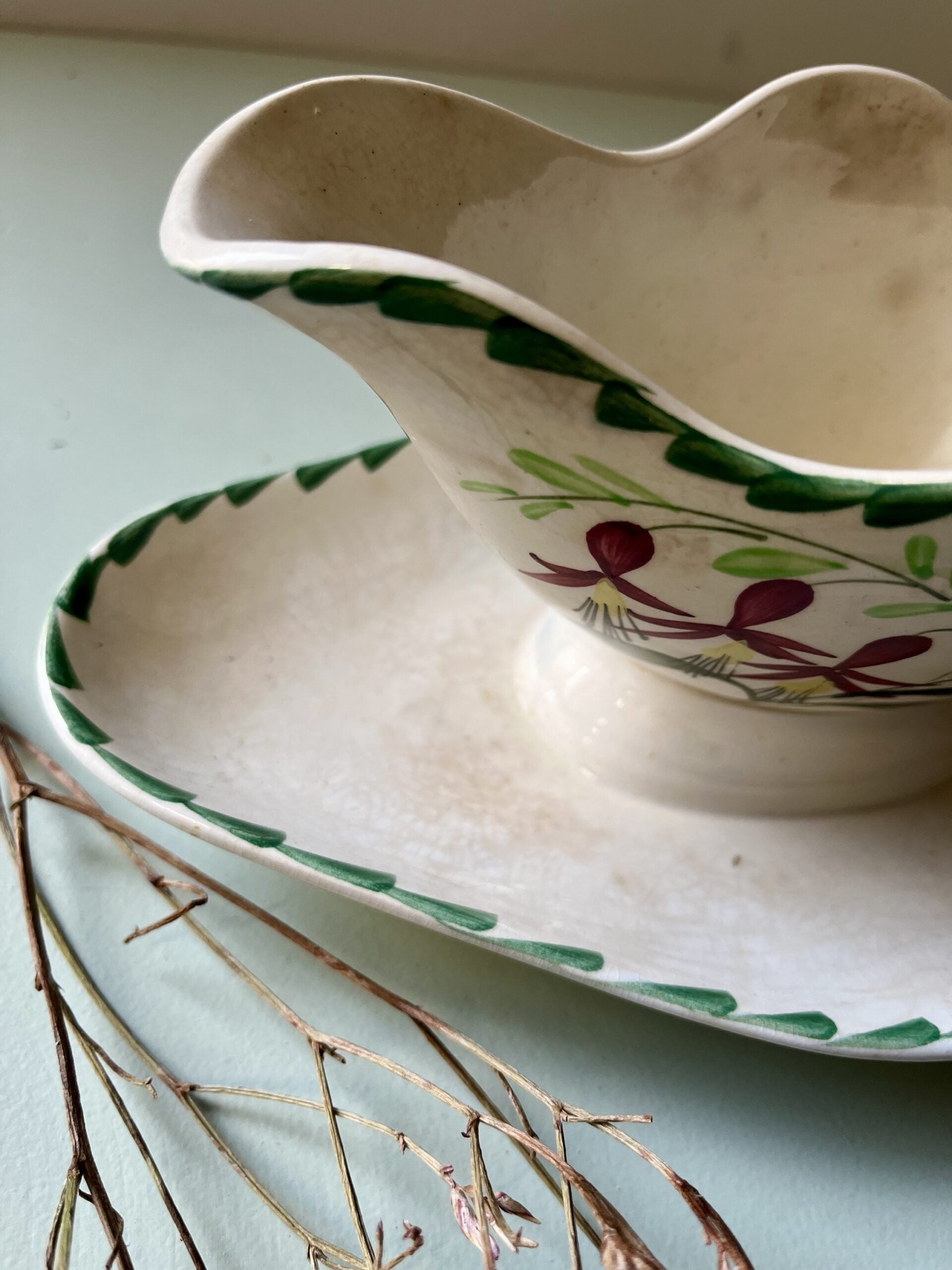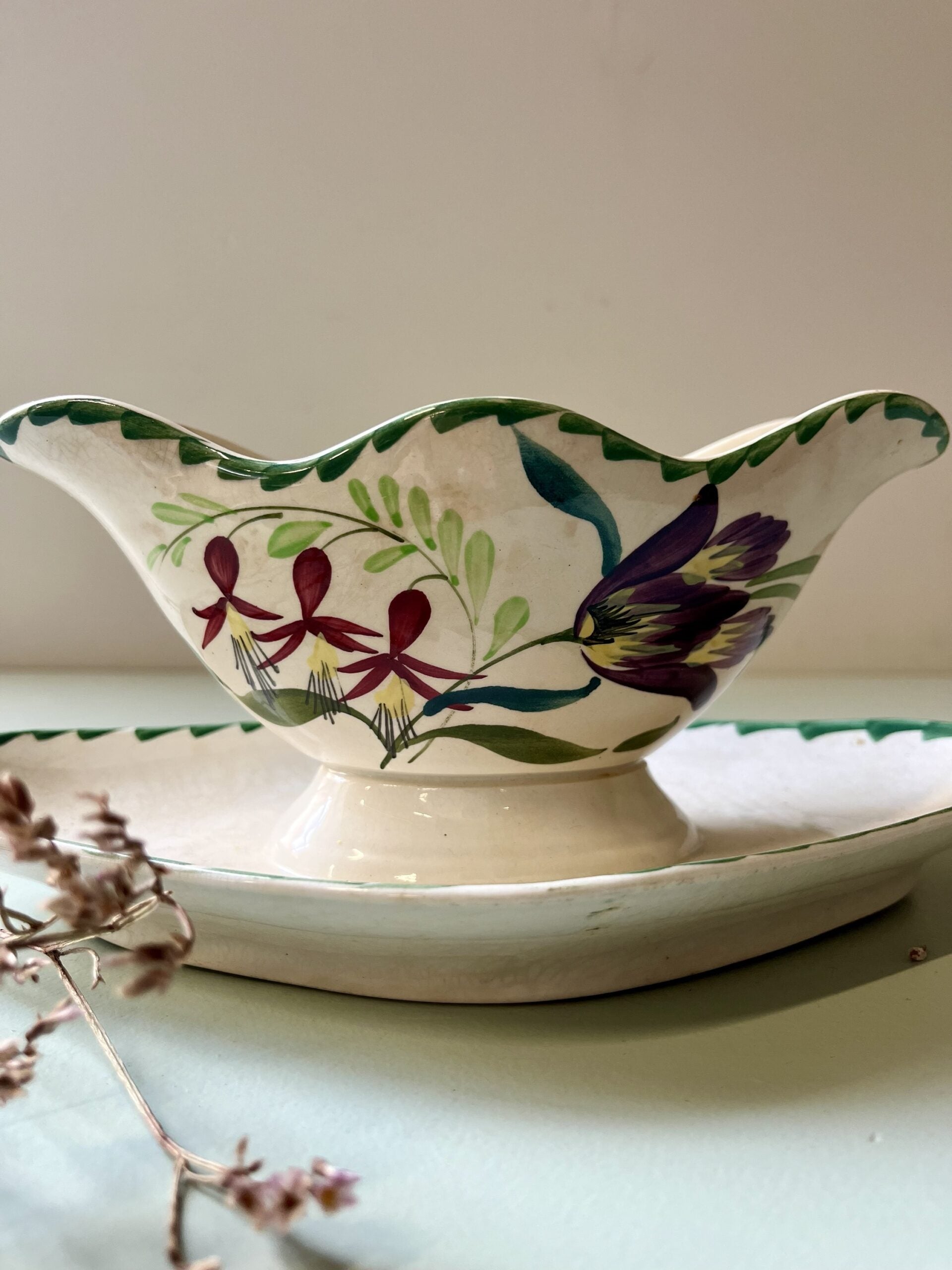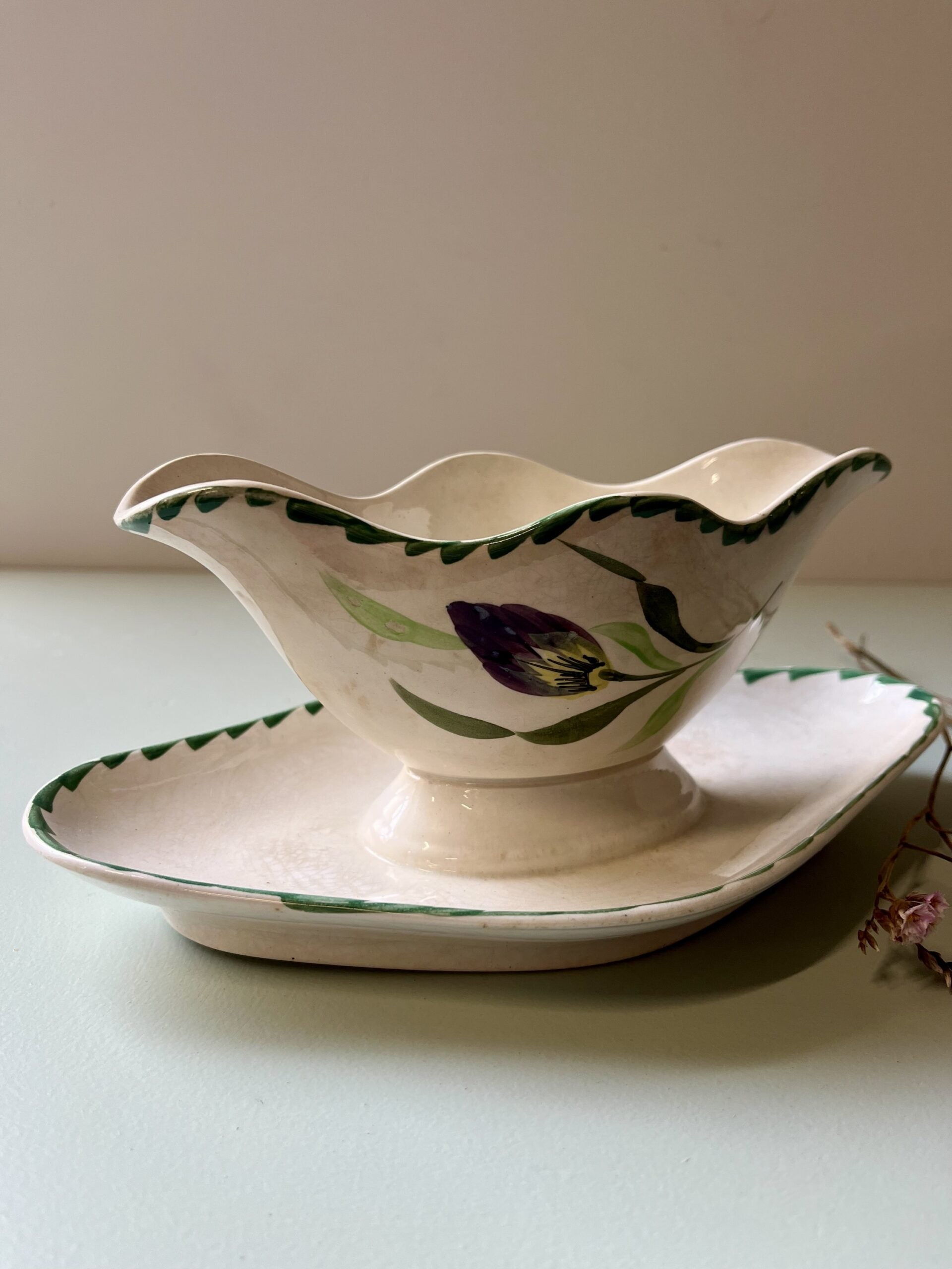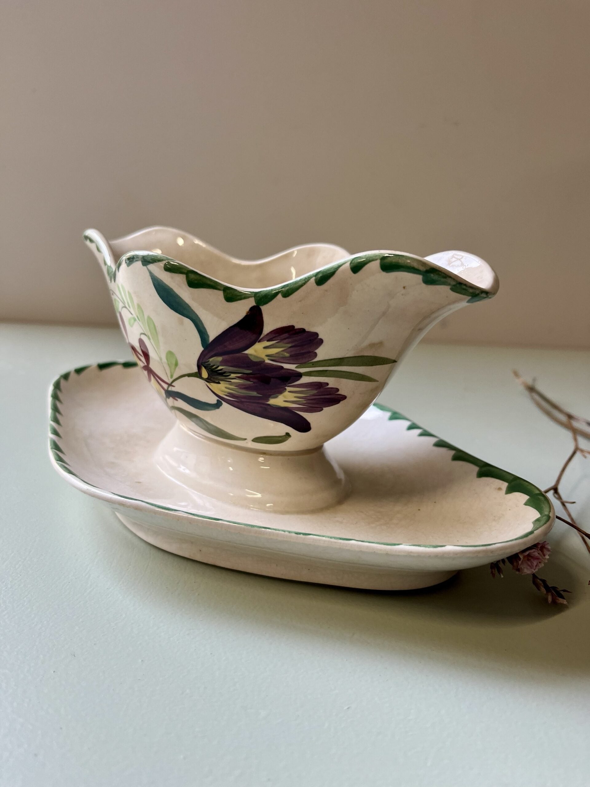 Saucière ancienne en faïence de la manufacture de Saint-Amand-les-Eaux, dans le Nord de la France, accompagnée de son plateau assorti. Le décor floral peint, aux tons verts et bordeaux, est typique des productions de Saint-Amand du début du XXe siècle.La forme chantournée apporte beaucoup de douceur à l’ensemble, avec une faïence crème légèrement craquelée, qui témoigne de son âge et de son vécu. Quelques traces du temps sont visibles, sans nuire à l’ensemble.