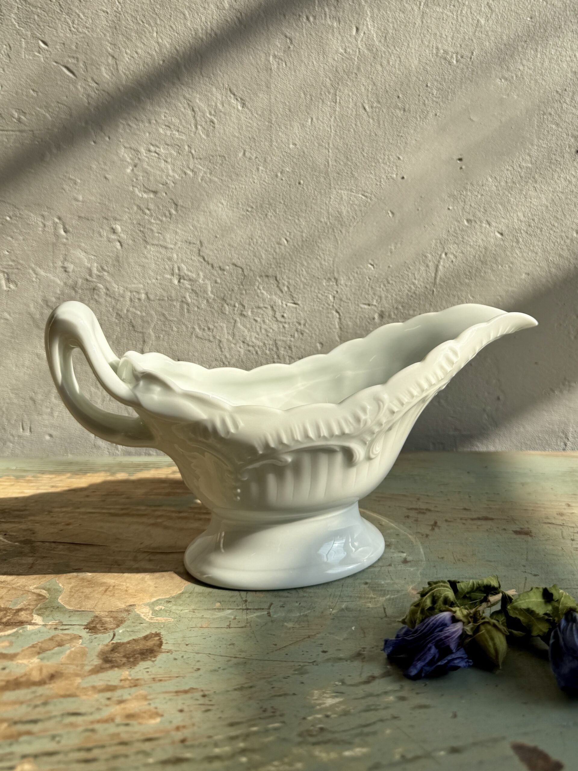 Saucière ancienne en porcelaine de Limoges, de forme arrondie qui se distingue des modèles classiques. Sa ligne sobre et élégante en fait une pièce à la fois fonctionnelle et décorative, pouvant compléter un service de table ancien ou être utilisée en élément de décoration.