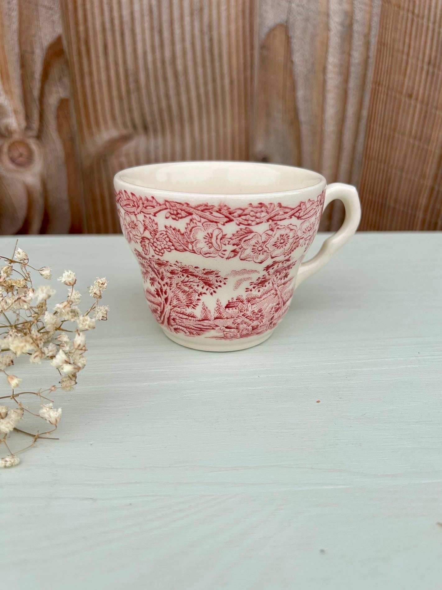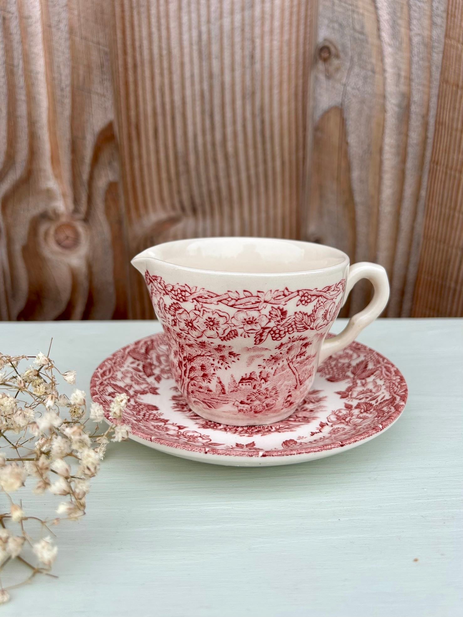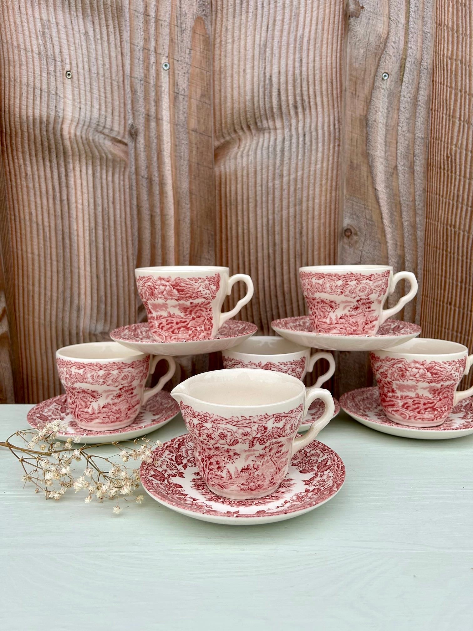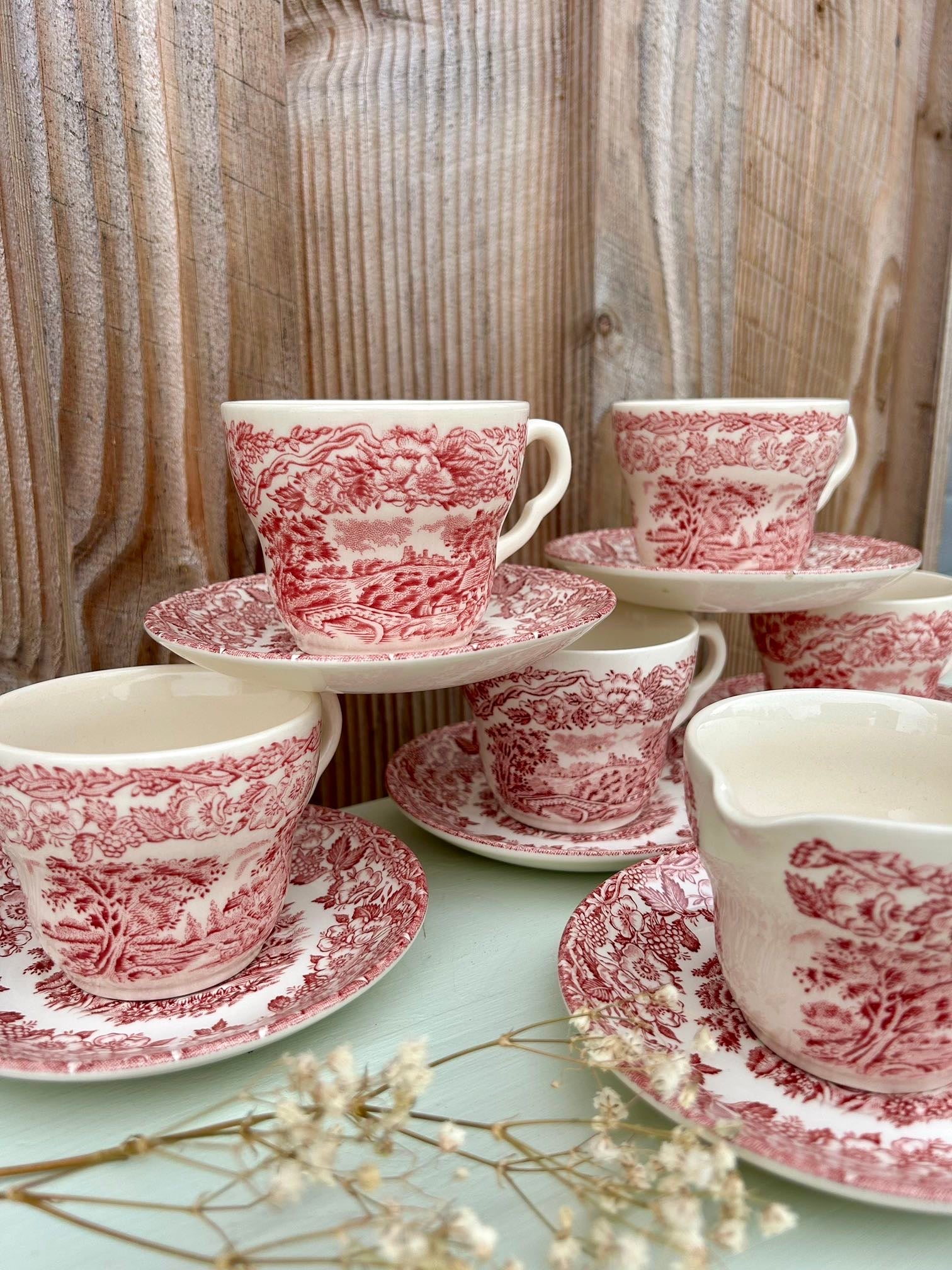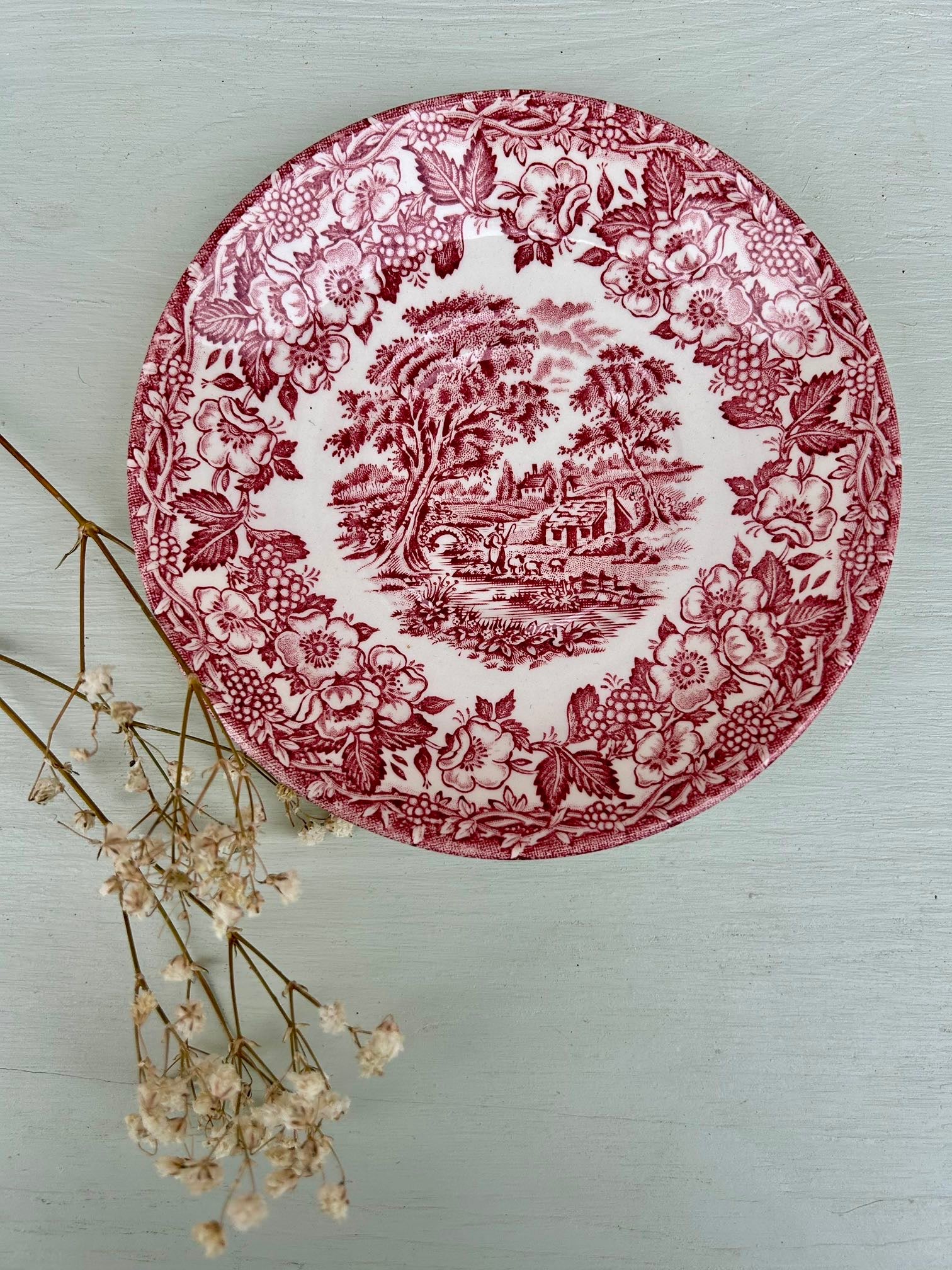 Service ancien dans le style des services anglais, avec décor rouge très détaillé mêlant paysage champêtre et guirlande florale. On retrouve ce côté « scène bucolique » typique de la vaisselle anglaise ancienne, parfaite pour une table pleine de charme.
