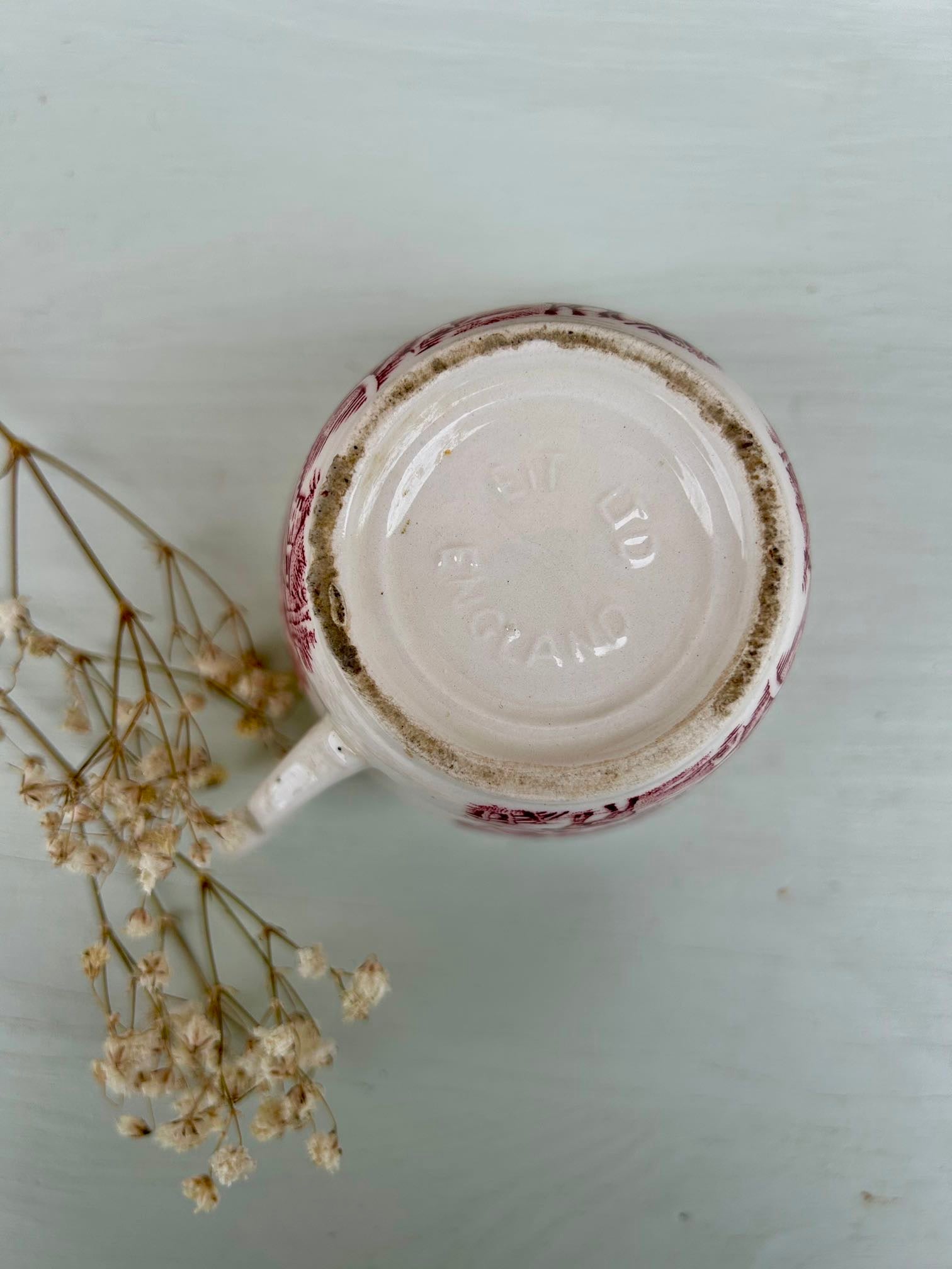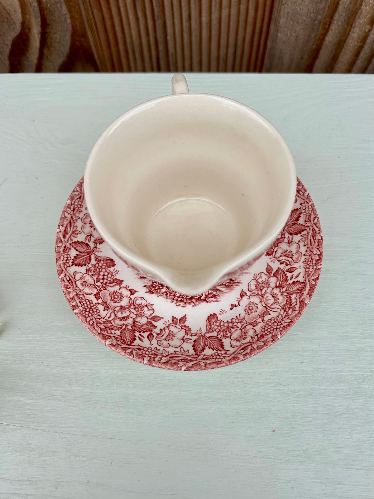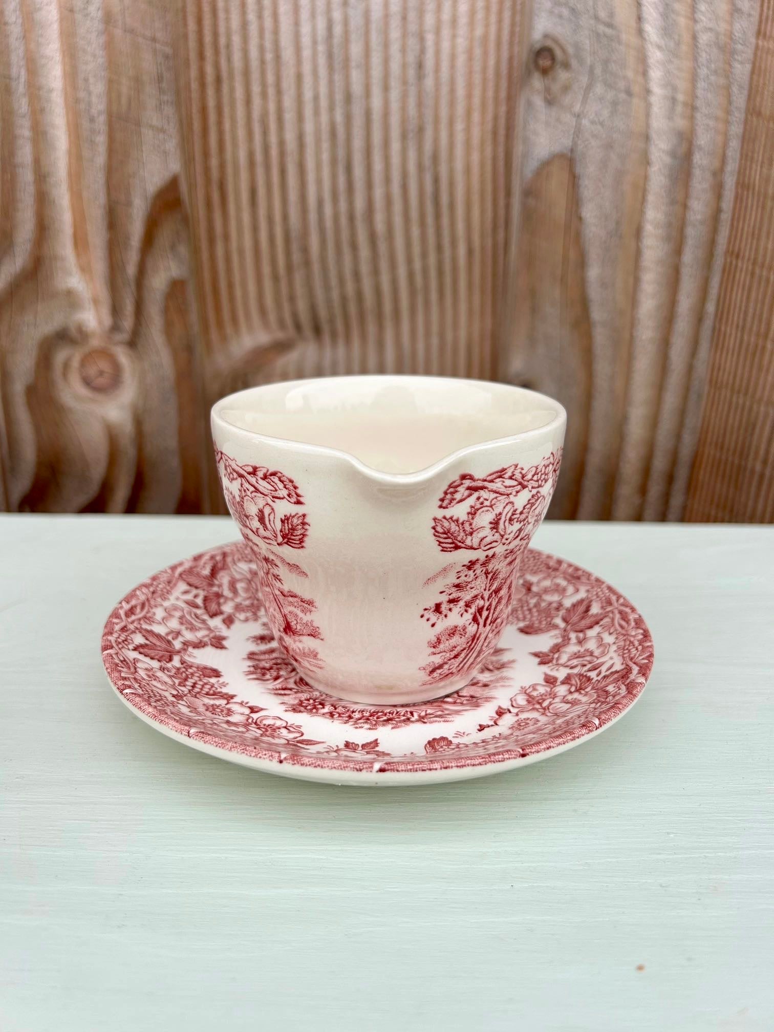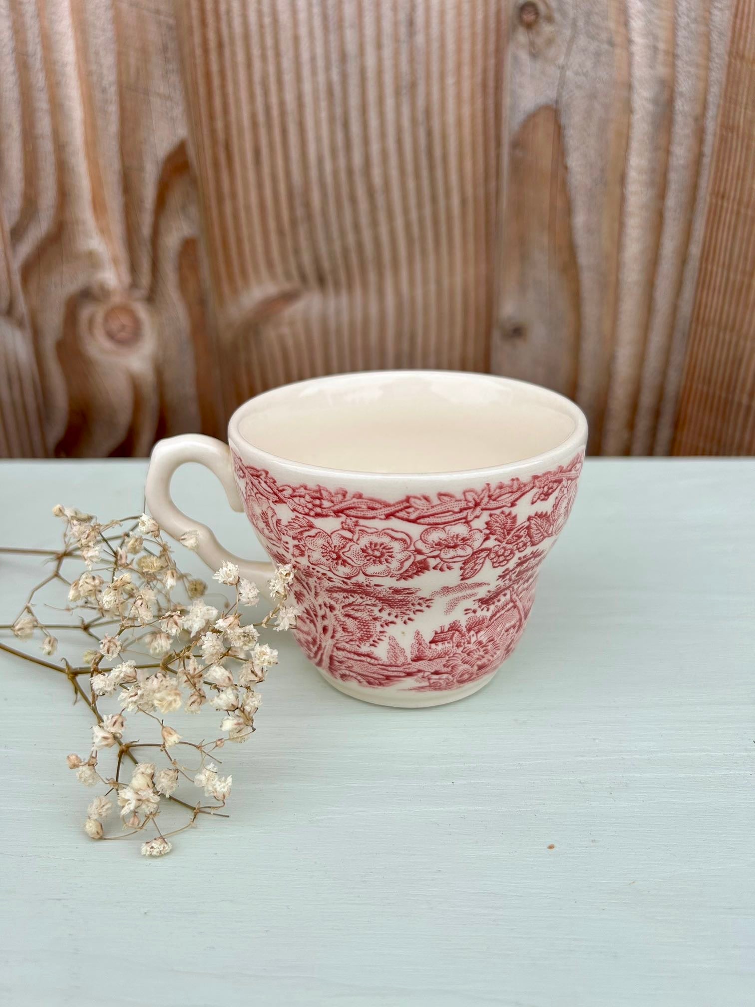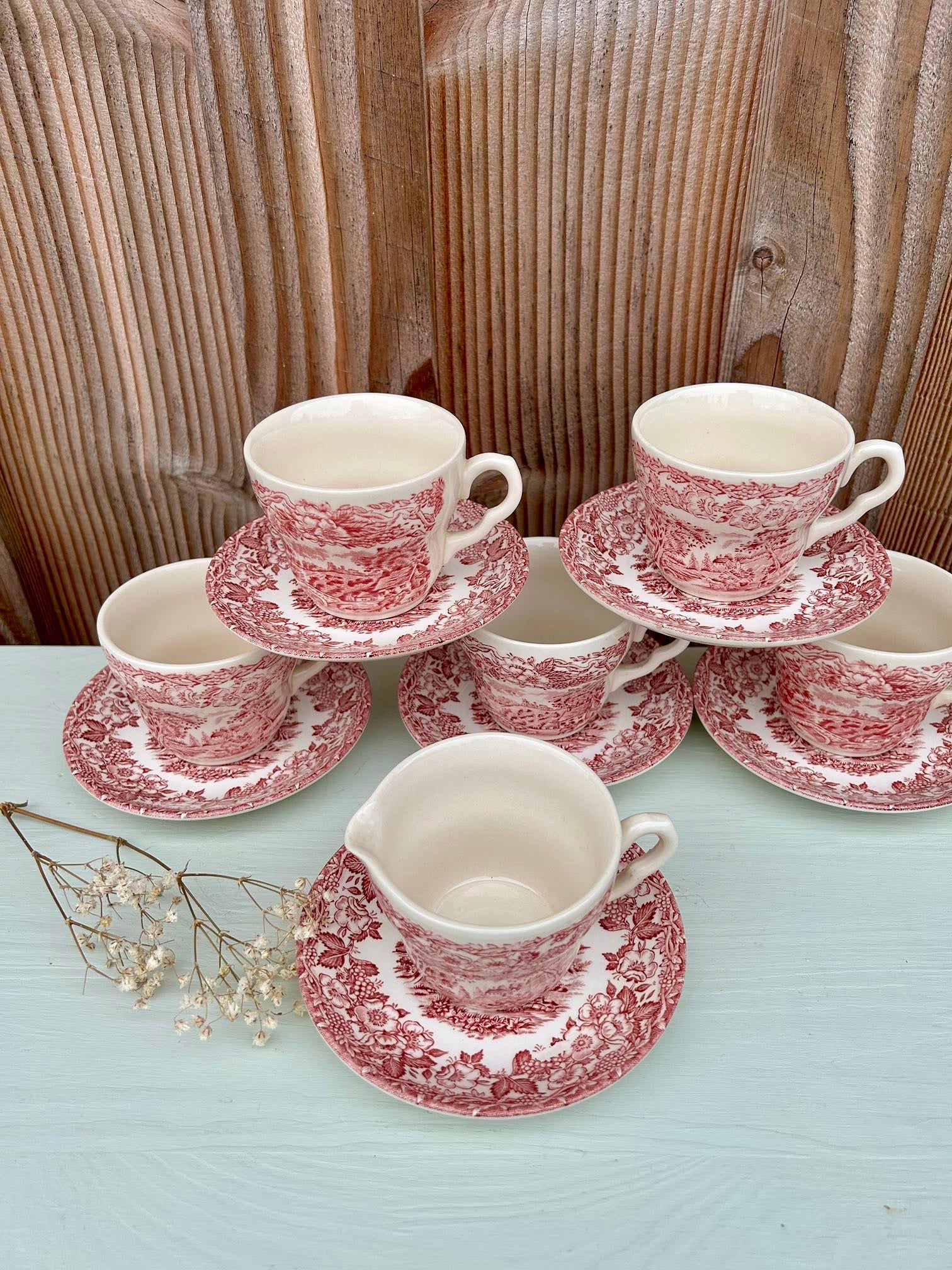 Service ancien dans le style des services anglais, avec décor rouge très détaillé mêlant paysage champêtre et guirlande florale. On retrouve ce côté « scène bucolique » typique de la vaisselle anglaise ancienne, parfaite pour une table pleine de charme.