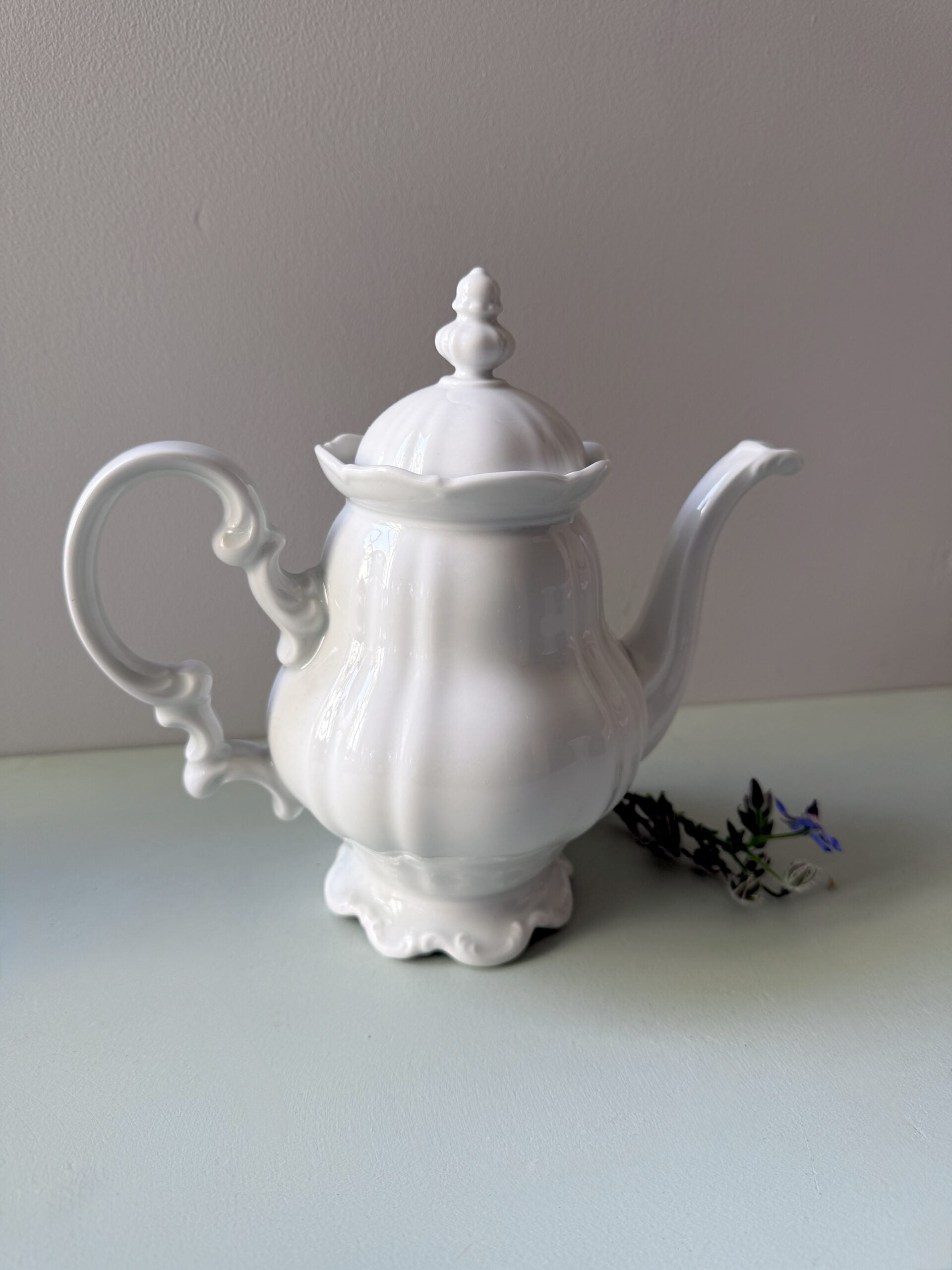 Ce service à thé Hutschenreuther, modèle Sylvia, incarne l’élégance des pièces anciennes qu’on aime transmettre. Sa blancheur lumineuse, ses courbes douces et son allure raffinée rappellent les tables familiales d’autrefois. Il trouve aussi très bien sa place dans un intérieur contemporain, où il crée un joli contraste entre tradition et modernité.Modèle Sylvia