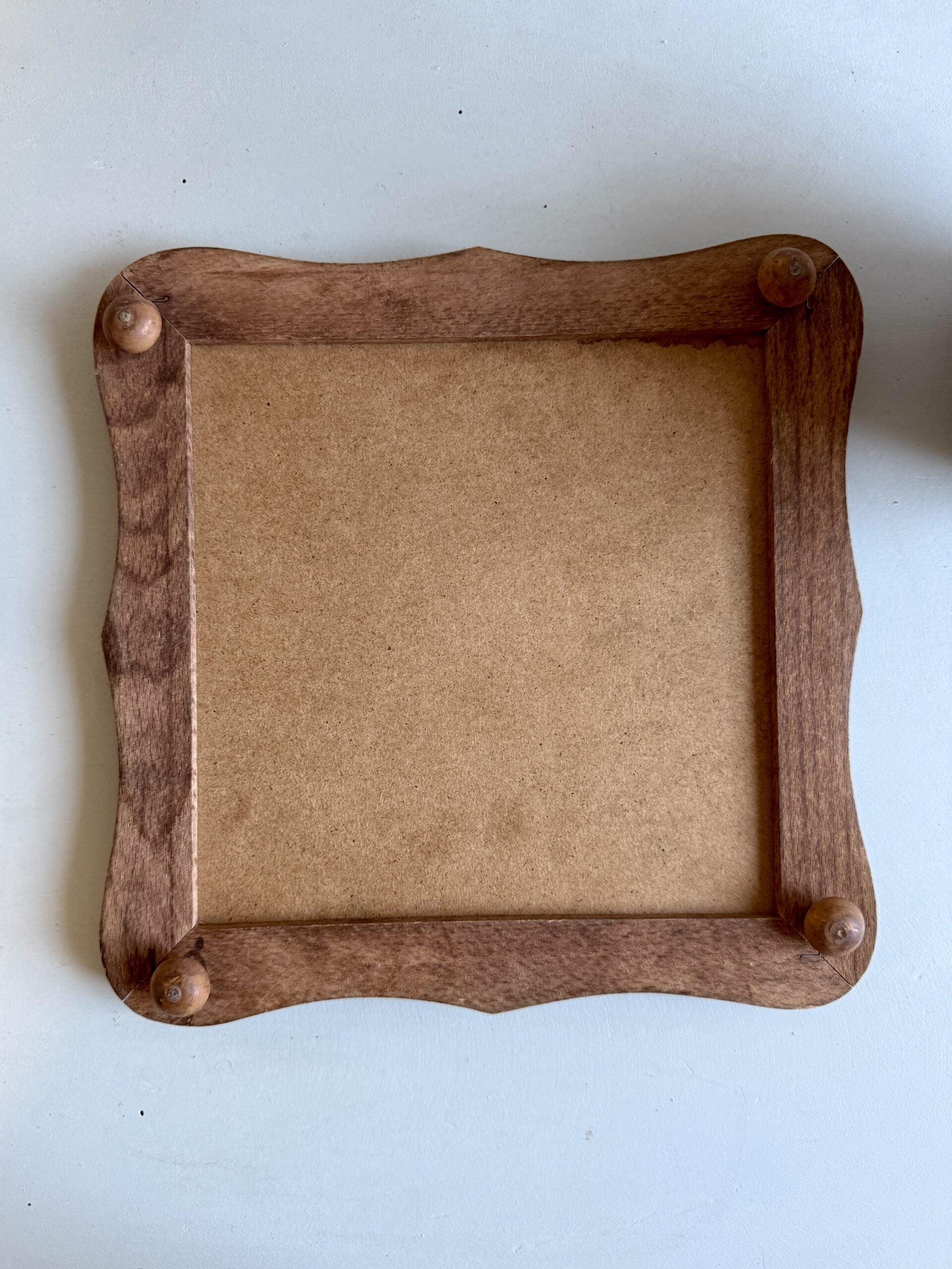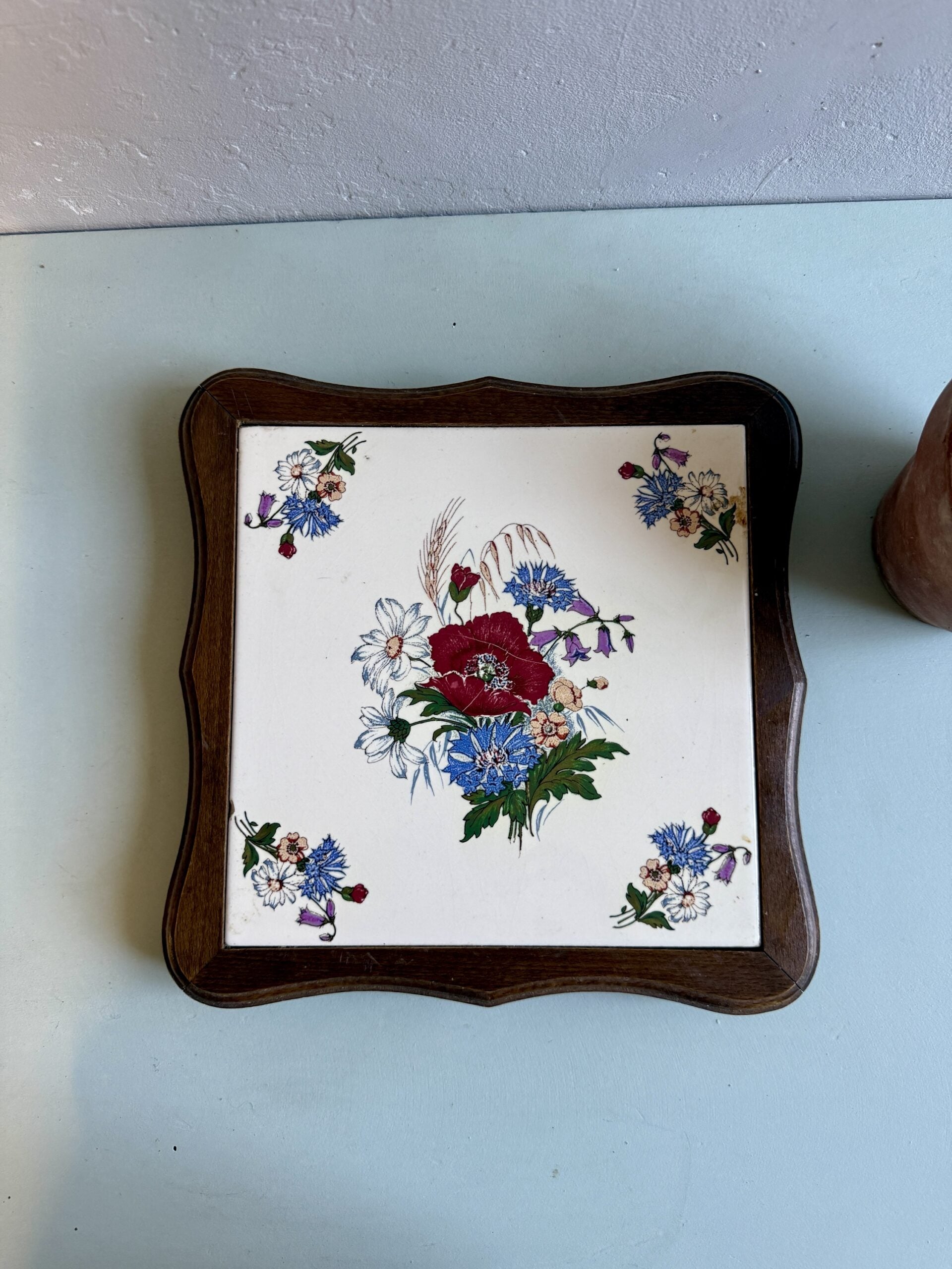 Sous-plat carré en faïence à décor floral, encadré d’une monture en bois. Pièce ancienne à la fois utile et décorative, parfaite pour protéger une table lors du service de plats chauds.