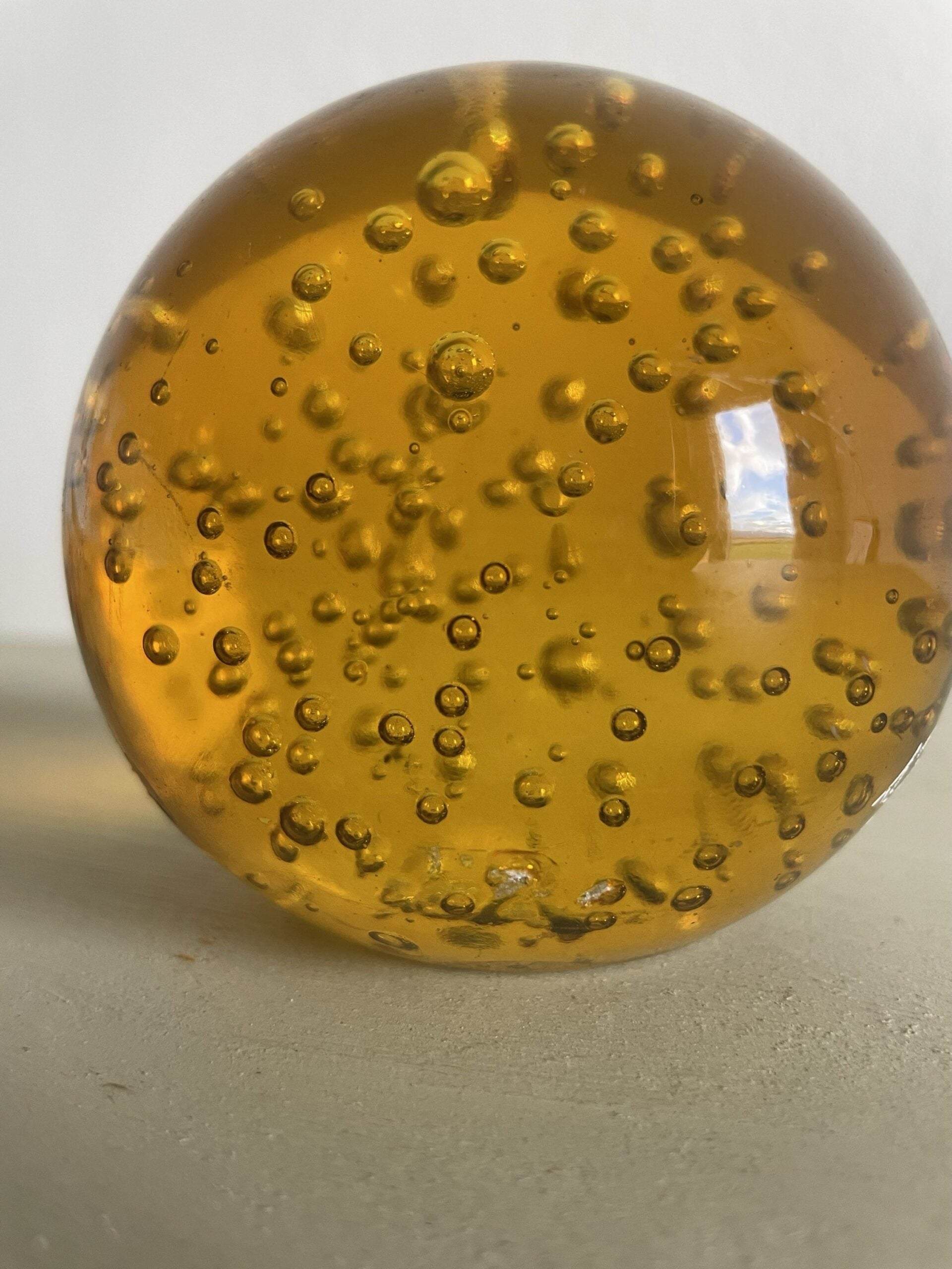 Presse papier en forme de sphère orangée.