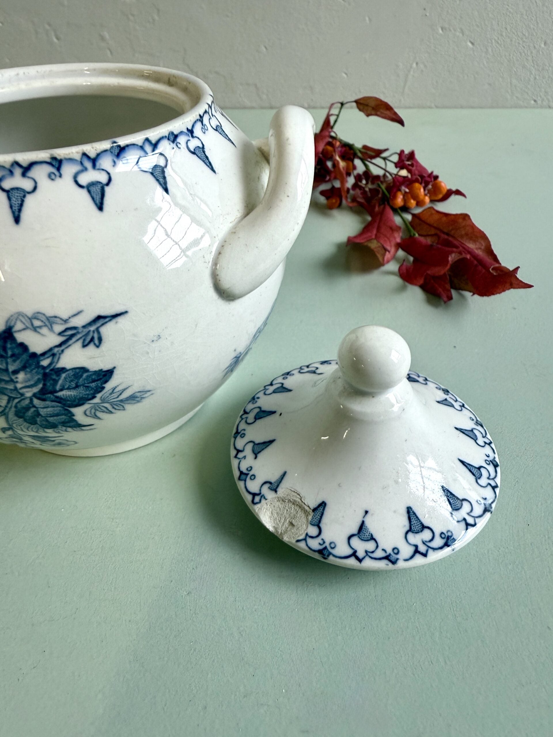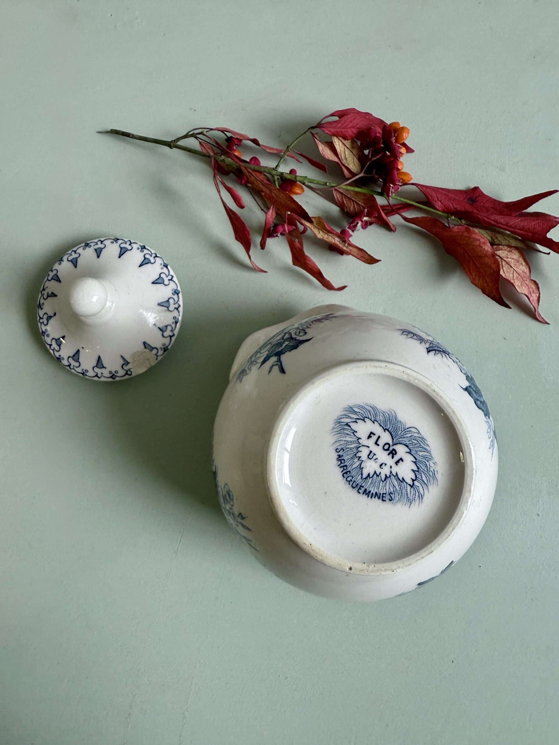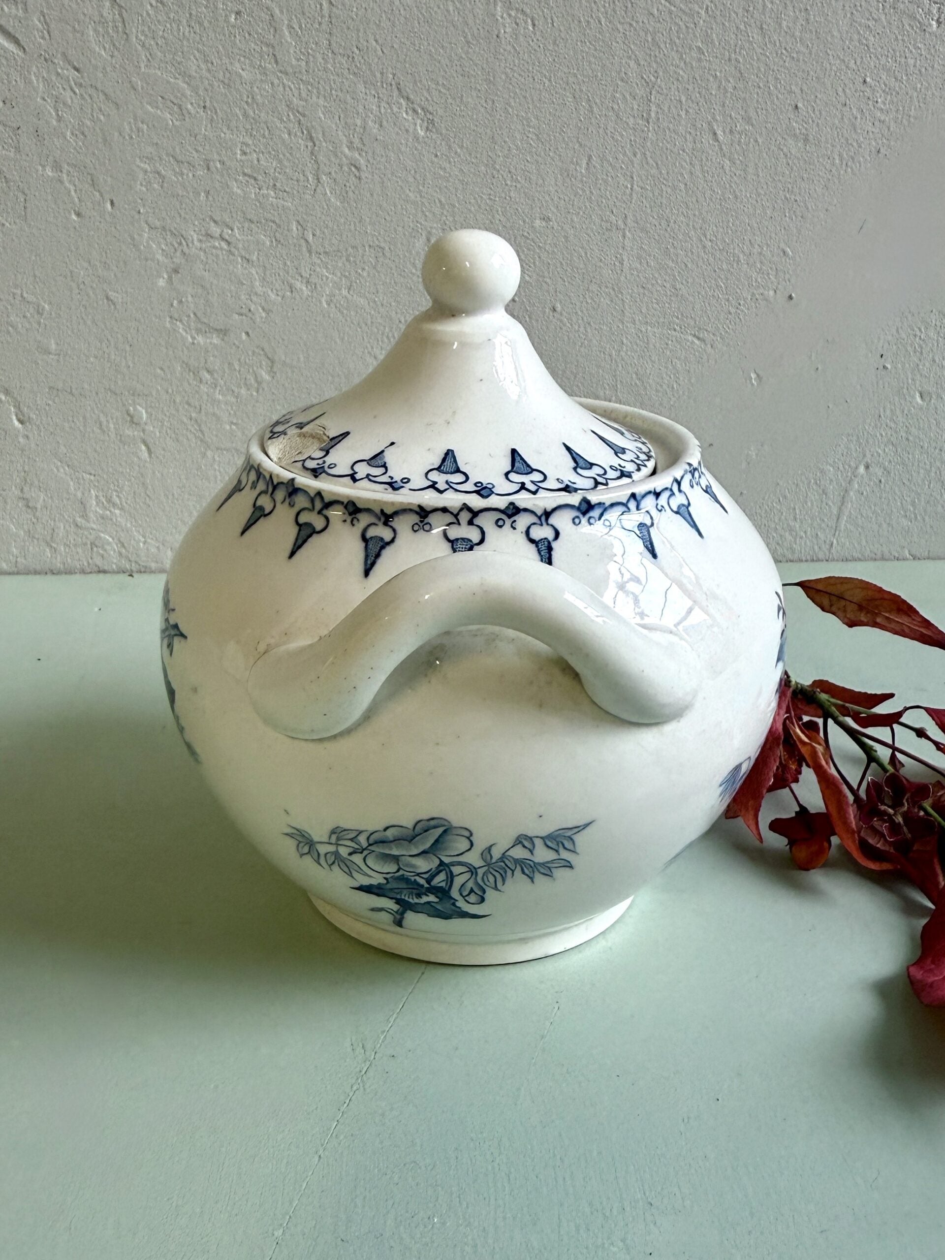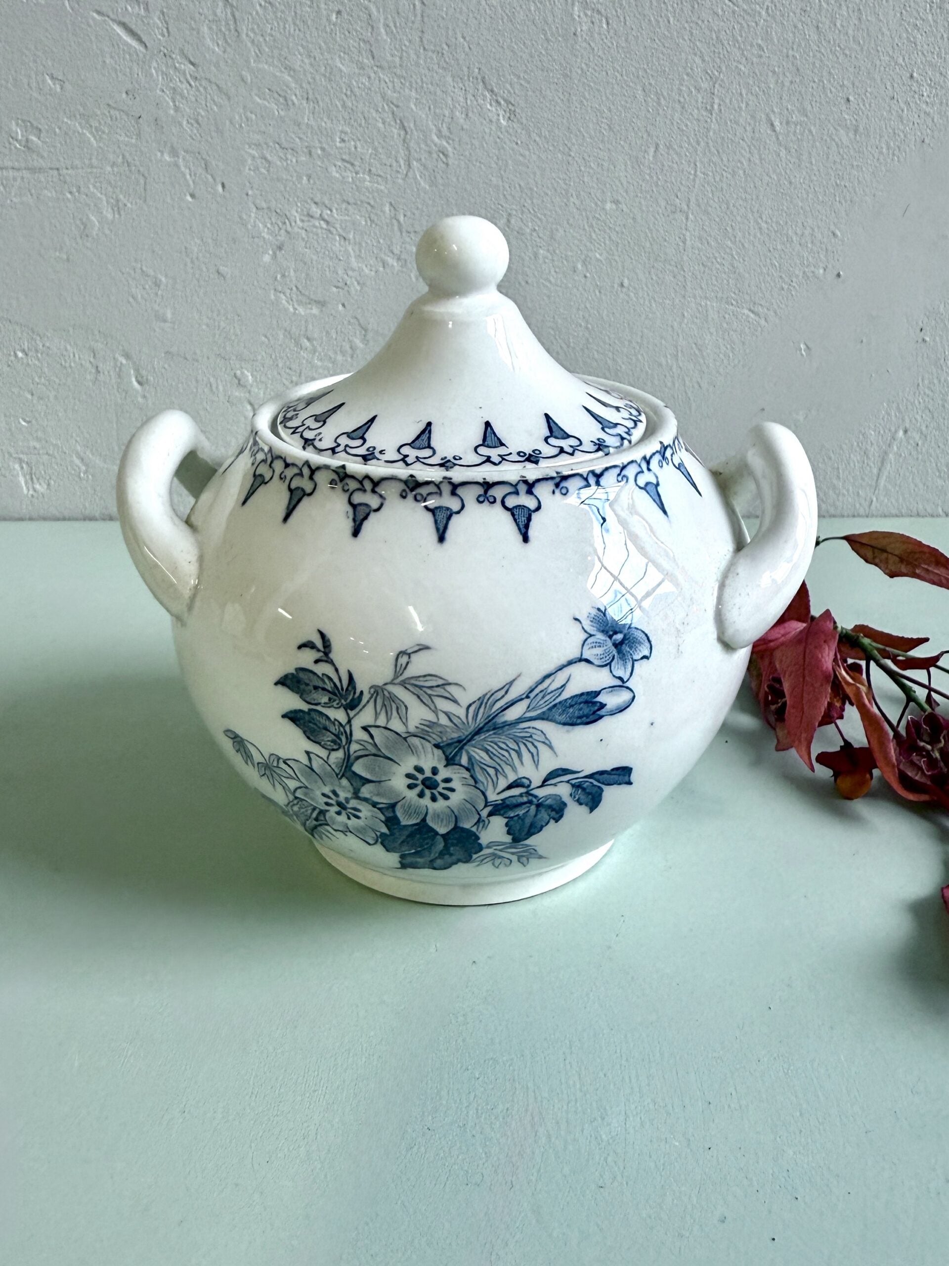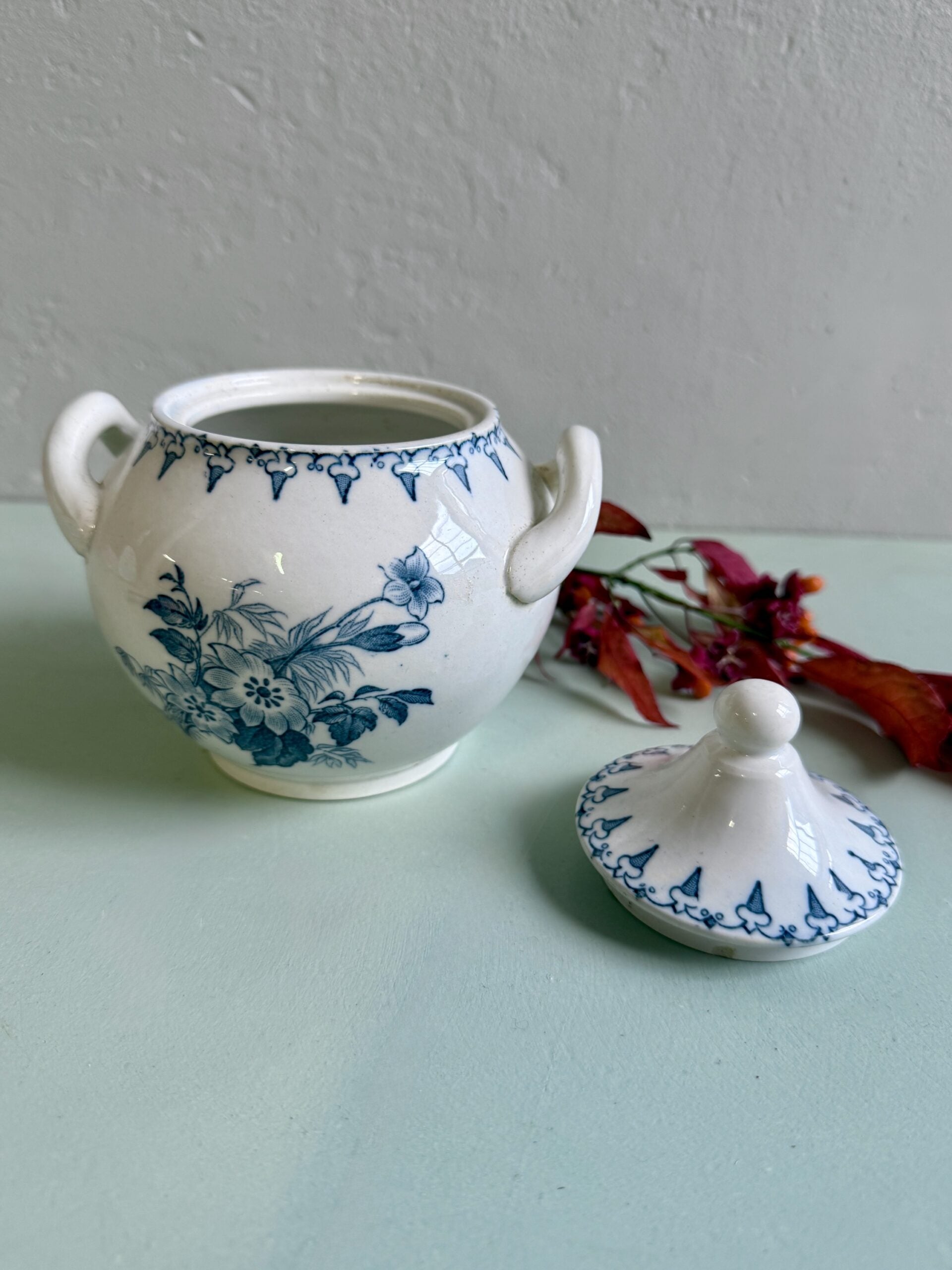 Sucrier ancien Sarreguemines modèle Flore en faïence blanche, décoré d’un motif floral bleu typique de la manufacture. Une pièce pleine de charme pour compléter un service ancien ou enrichir une collection de vaisselle Sarreguemines.Il peut accueillir le sucre, du miel ou de la confiture, mais fonctionne aussi très bien détourné en petit pot décoratif sur une étagère, un buffet ou dans une cuisine. Associé à d’autres éléments du modèle Flore ou à de la vaisselle blanche, il apporte ce petit supplément d’âme qu’on aime dans les objets anciens.Le couvercle présente un morceau manquant sur le bord (visible sur les photos), sans empêcher son utilisation.