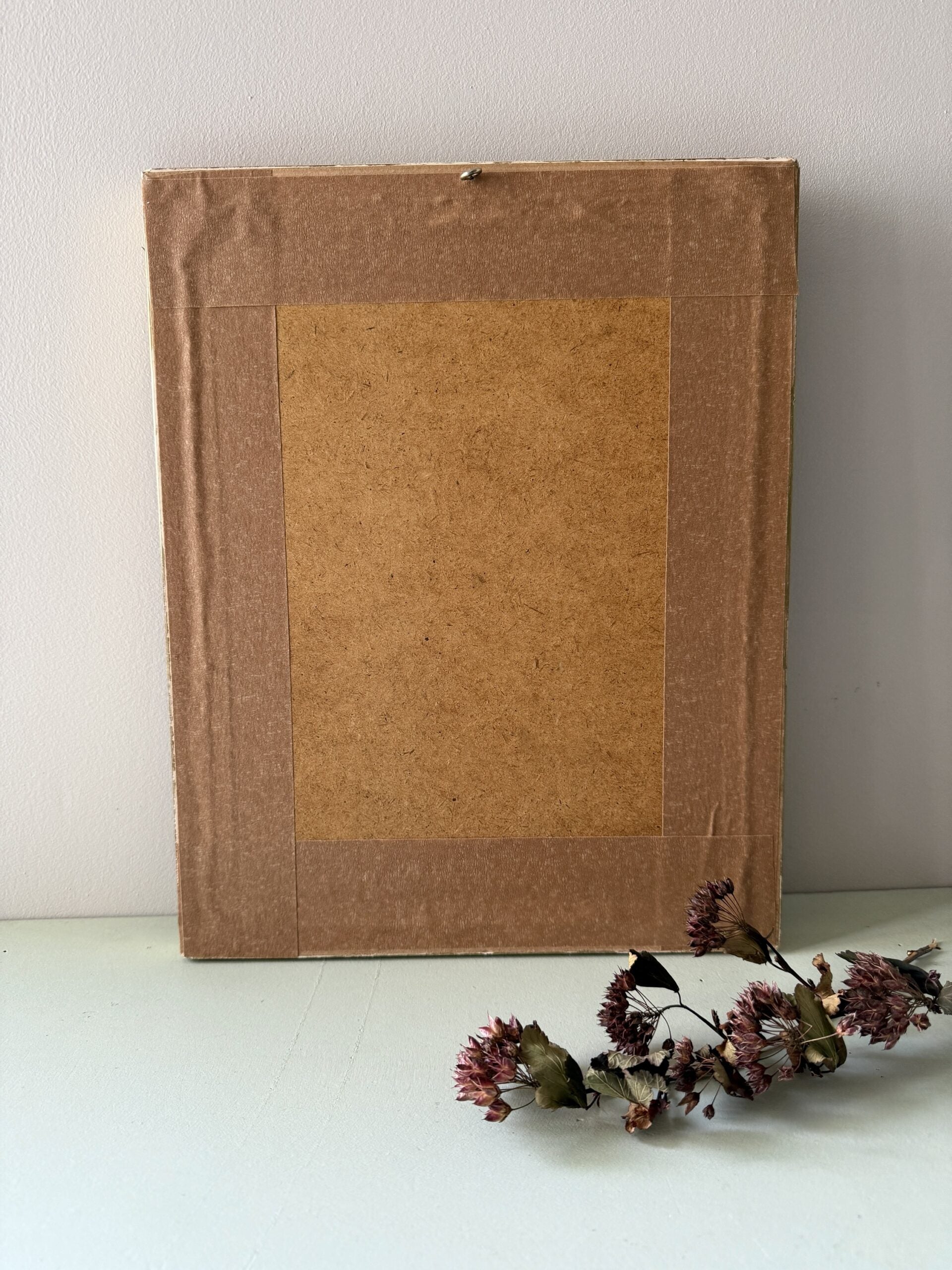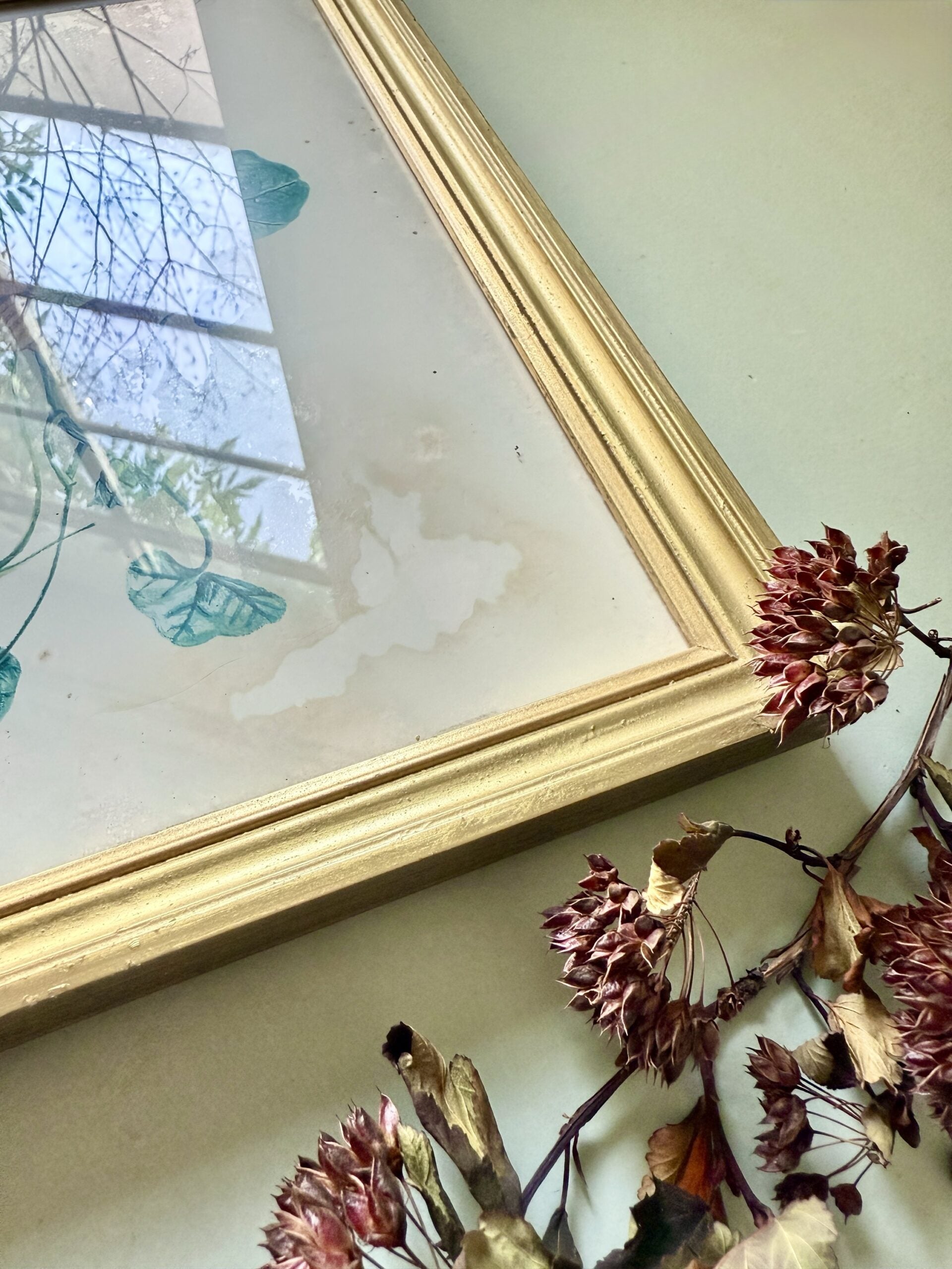L’illustration est présentée dans un cadre en bois doré, dont la dorure est un peu abîmée dans les coins – ce qui fait aussi tout son charme. On note quelques taches anciennes sur le papier, témoins du temps qui passe et qui renforcent son côté authentique.Détails