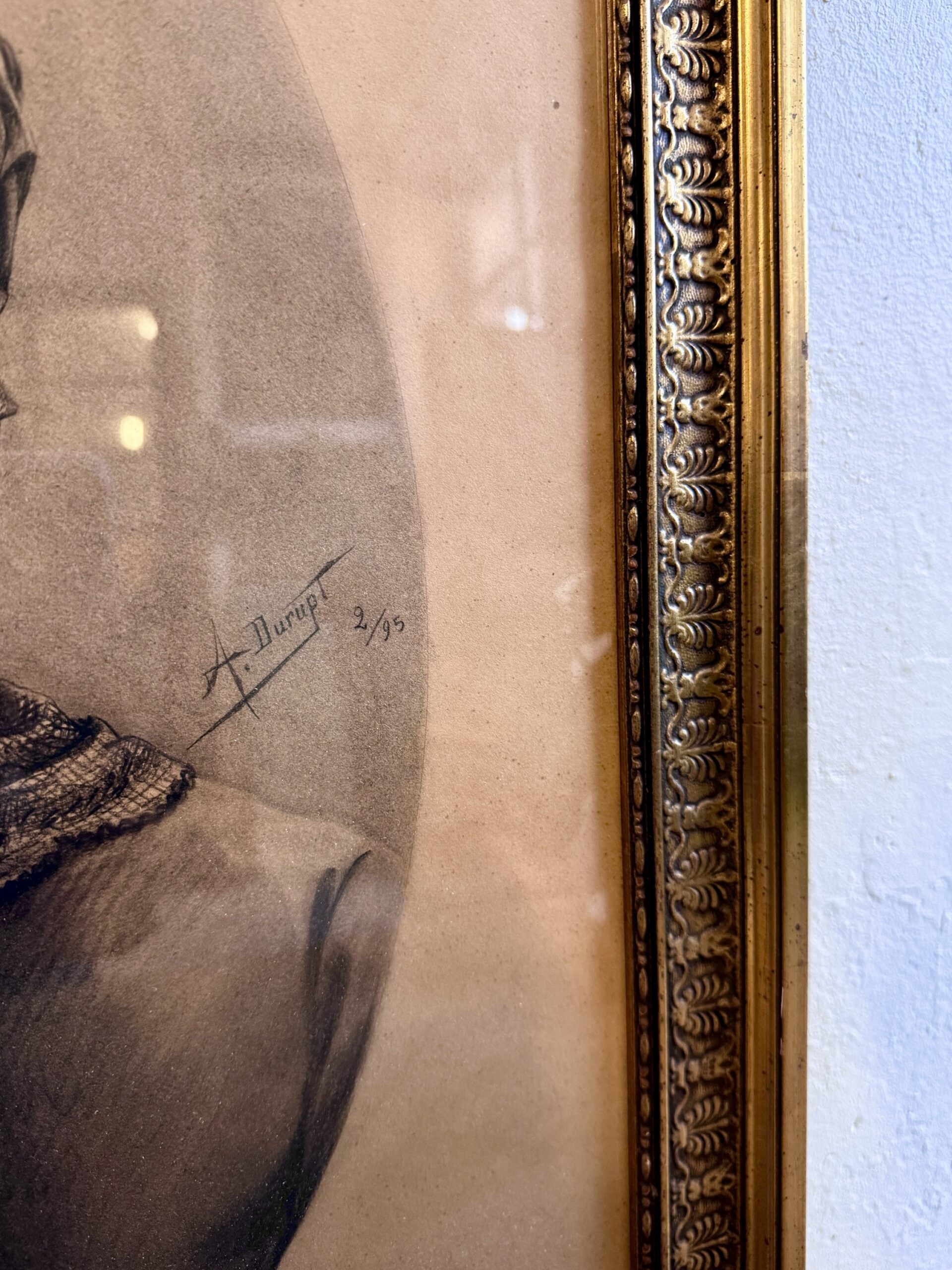 Tableau représentant le portrait en noir et blanc d’une vieille dame, signé A. Durupt et numéroté 2/95. Il s’agit d’une lithographie encadrée, présentée dans un cadre en bois doré.