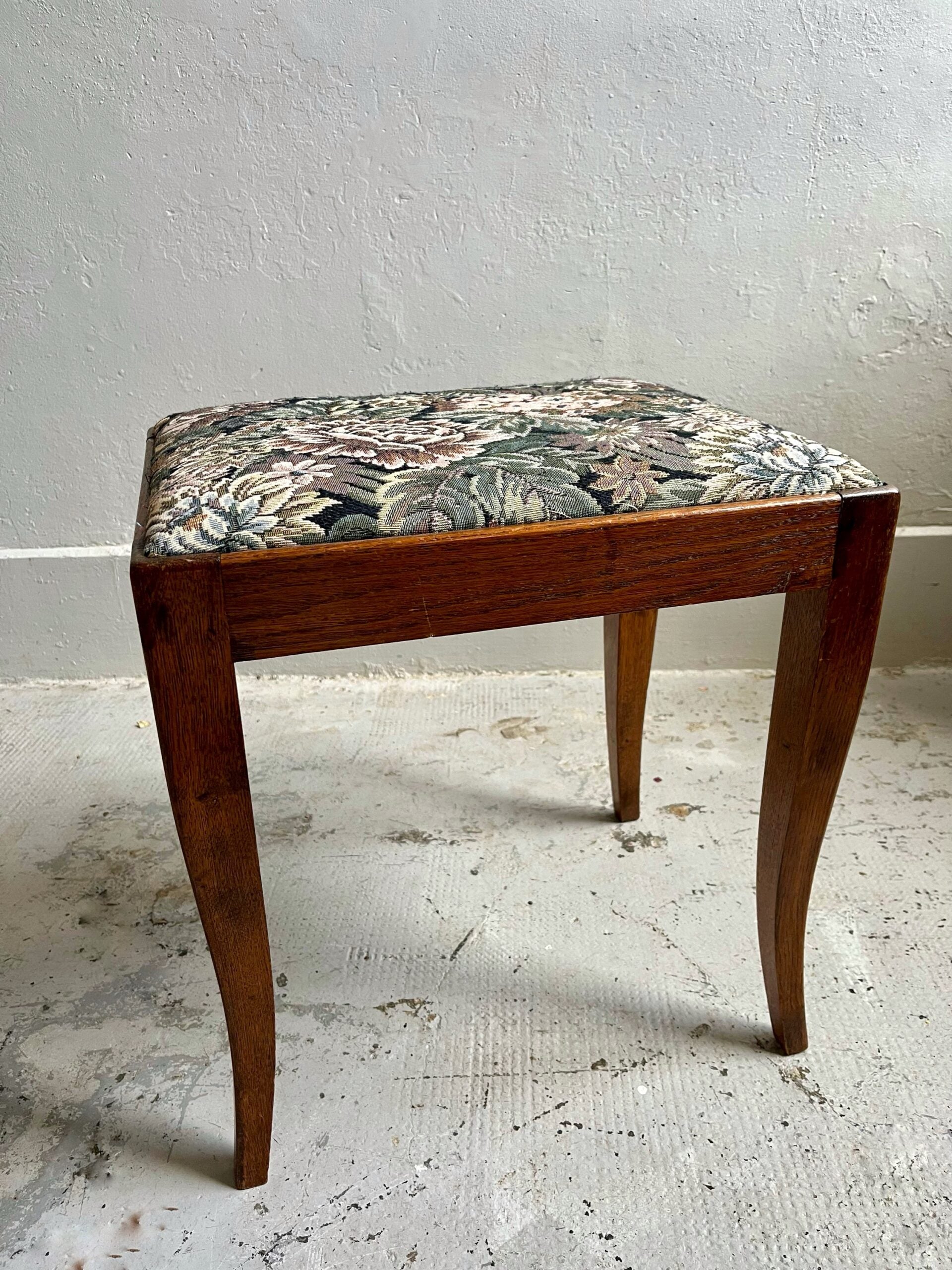 Tabouret ancien en bois massif avec assise tapissée à motif floral. Une pièce compacte et pratique, idéale en assise d’appoint, en bout de lit ou dans une entrée.
