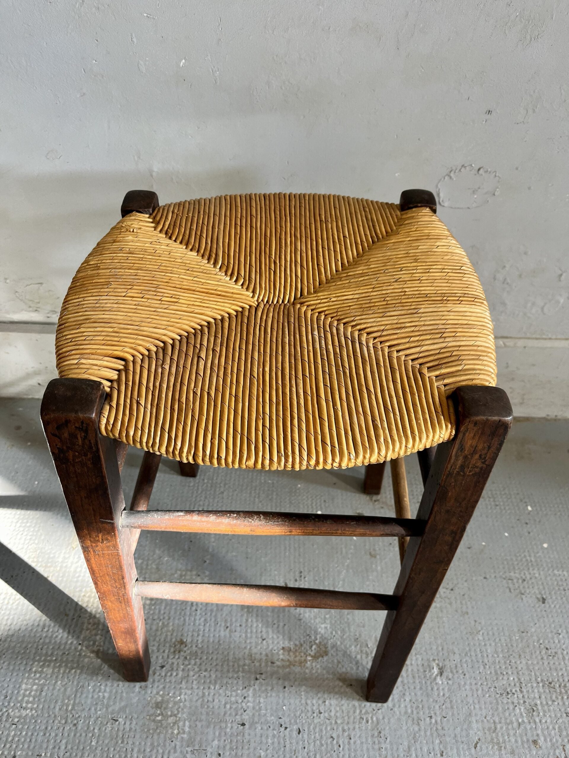 Tabouret ancien en bois massif avec assise en paille tressée. Une ligne simple et fonctionnelle, typique du mobilier rustique traditionnel.