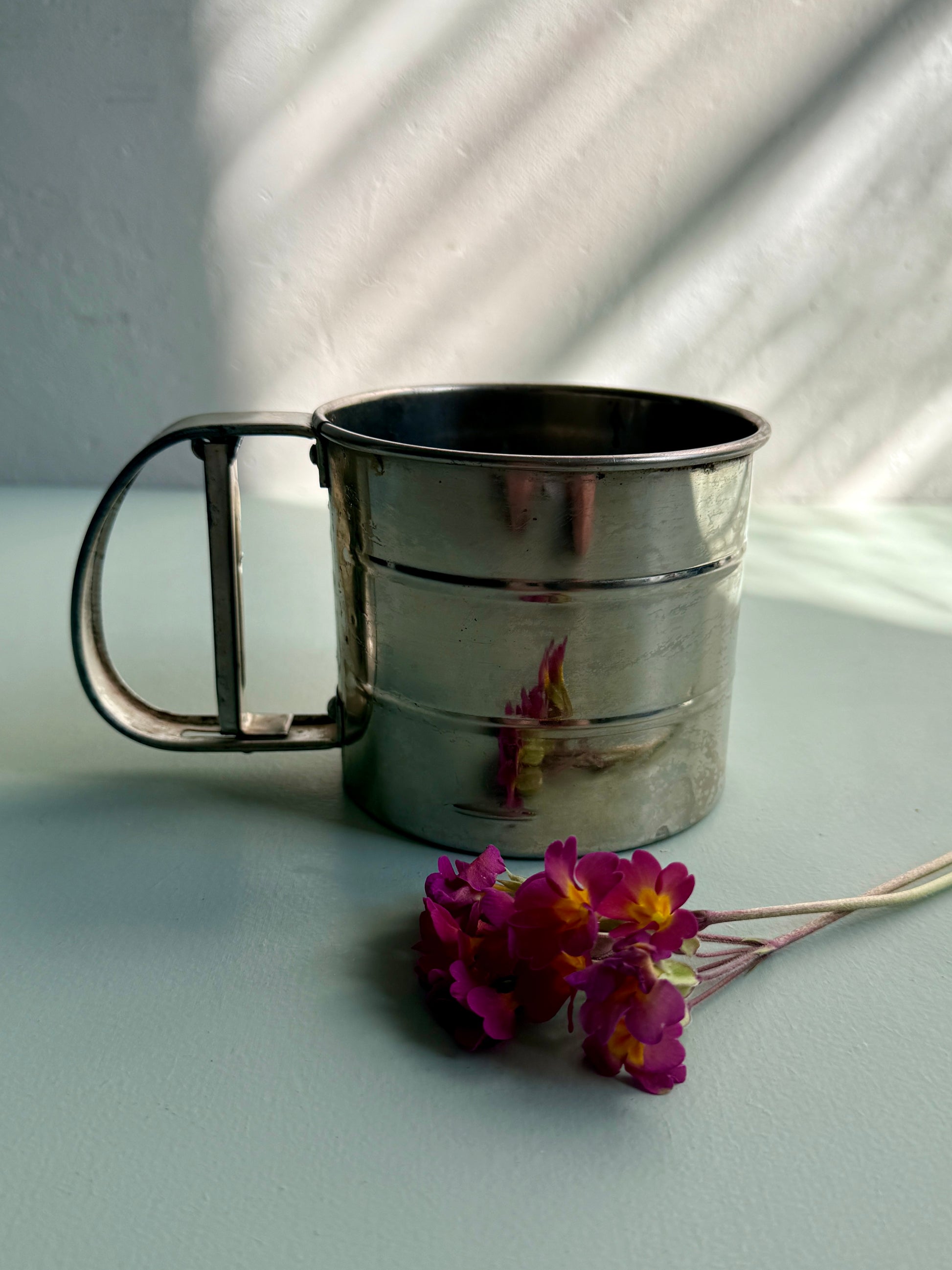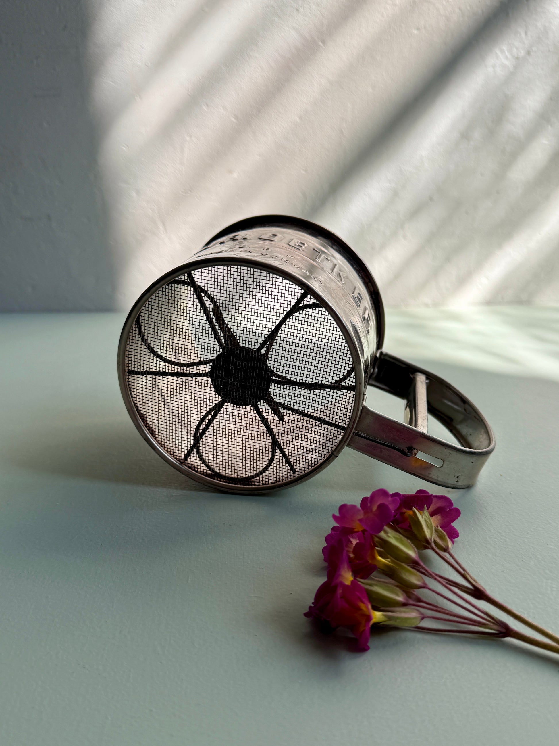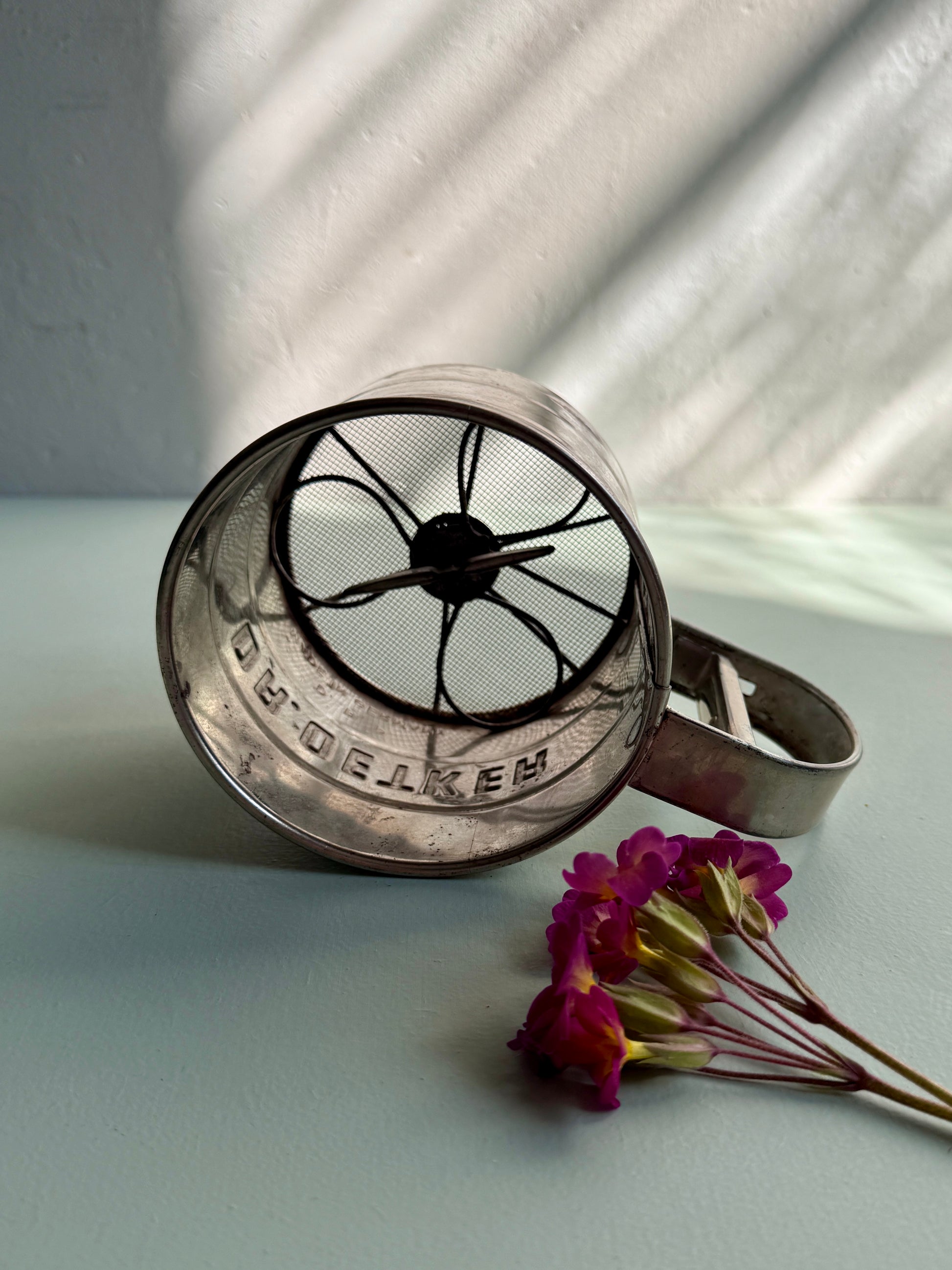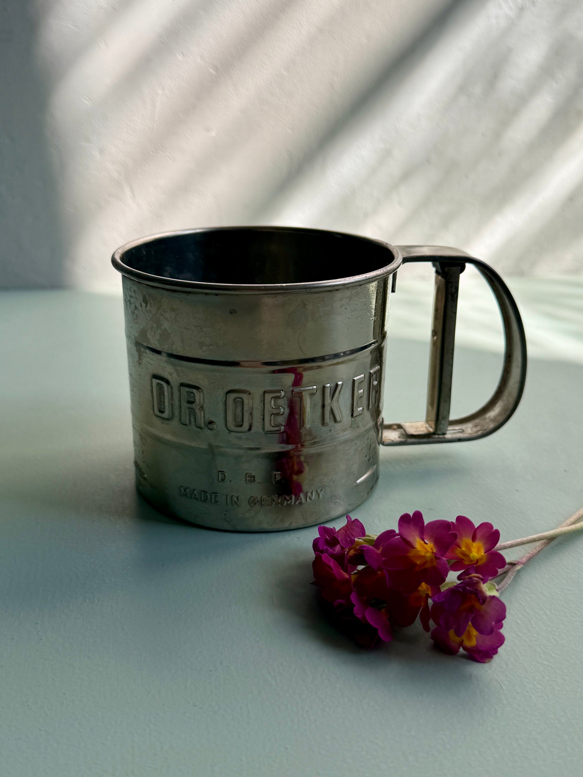 Tamis à farine ancien Dr Oetker en métal, un classique des cuisines d’époque utilisé pour aérer la farine et réussir pâtisseries et gâteaux maison. La marque allemande, connue depuis la fin du XIXe siècle, est une référence dans les ustensiles et ingrédients de cuisine.