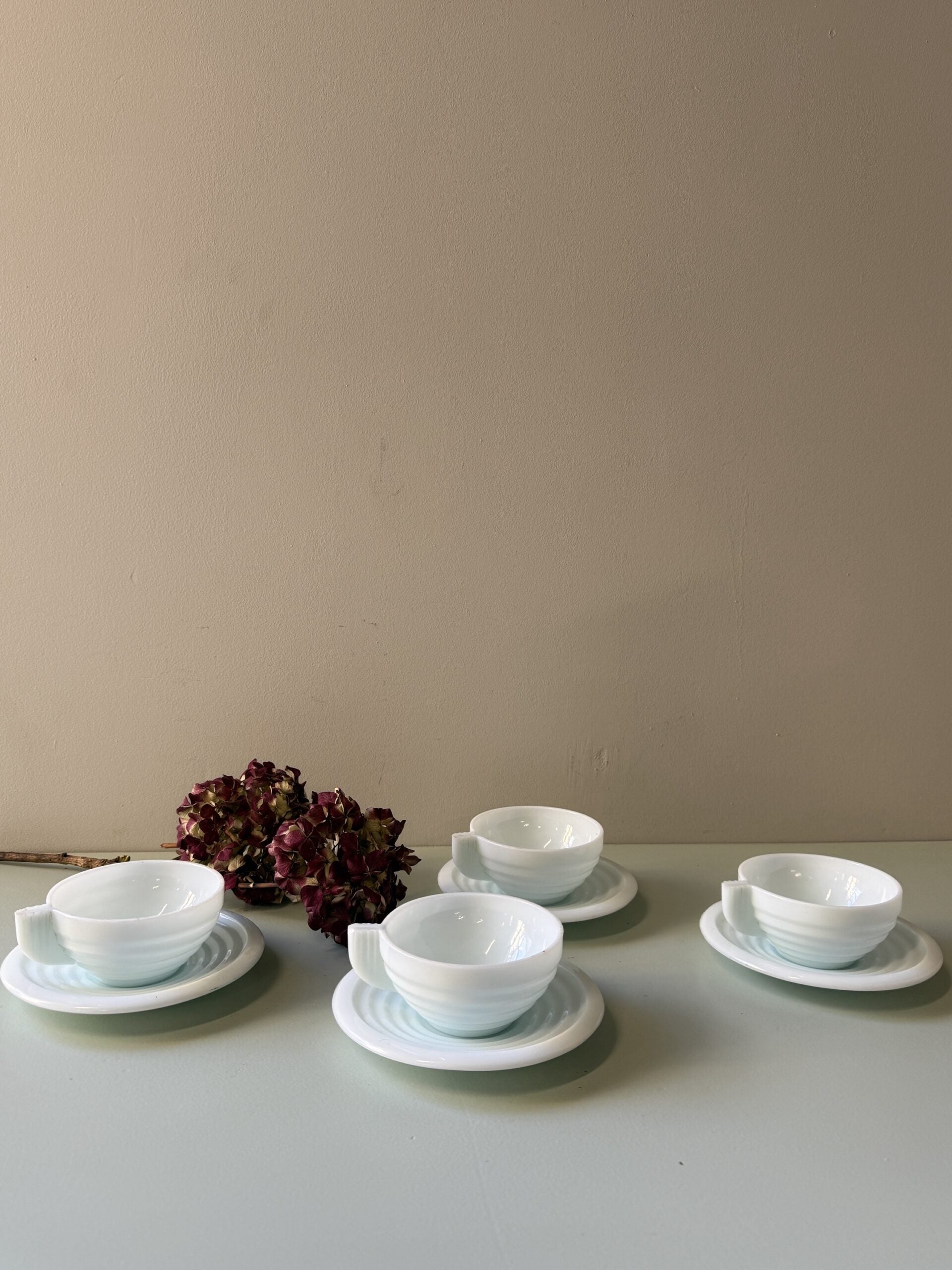 Cet ensemble se compose de quatre tasses et de quatre coupelles en opaline, un verre opaque utilisé dans la vaisselle française du XXe siècle. Les tasses présentent des stries horizontales en relief, tandis que les coupelles sont décorées de cercles concentriques, créant un ensemble cohérent et graphique.