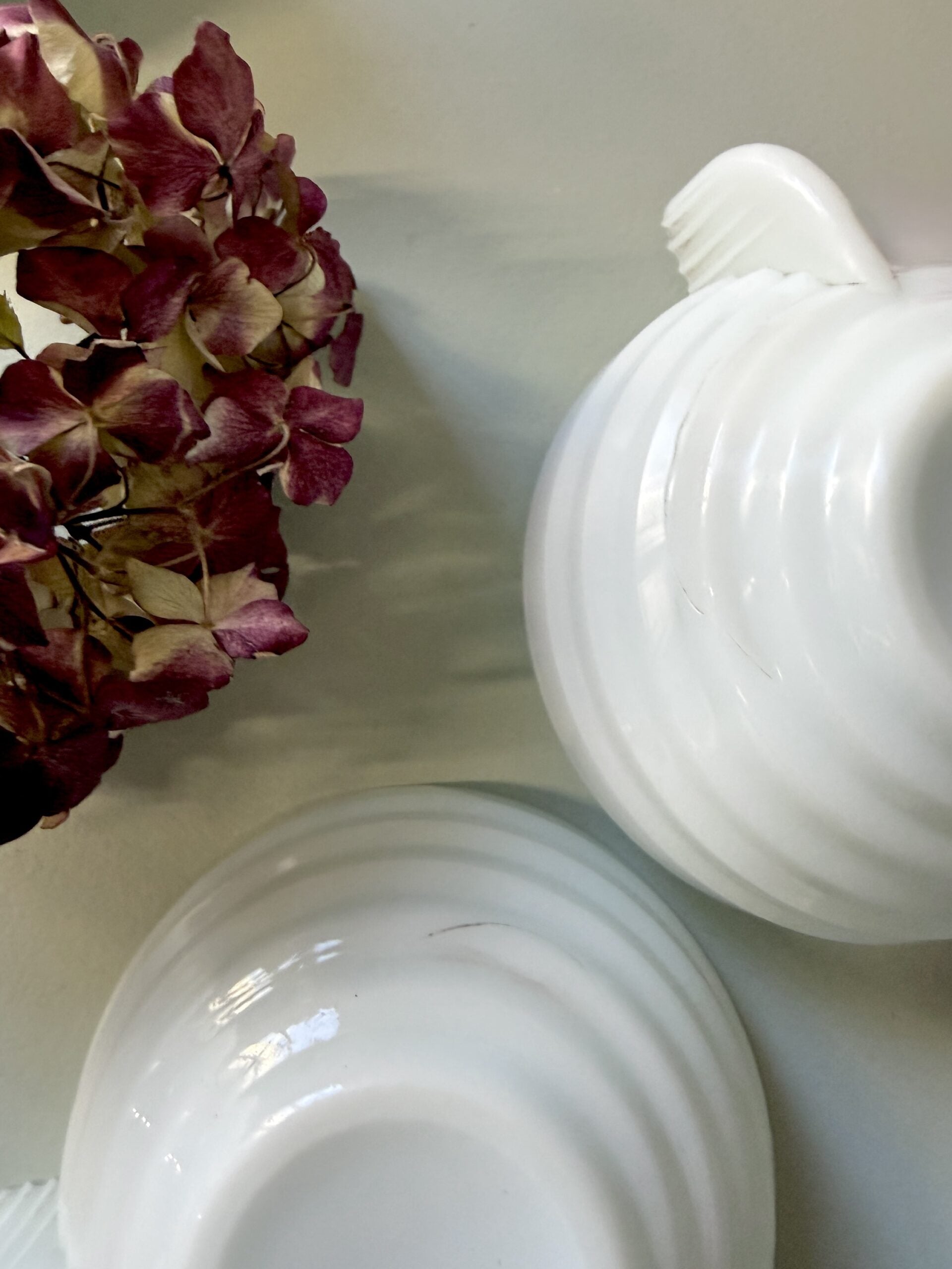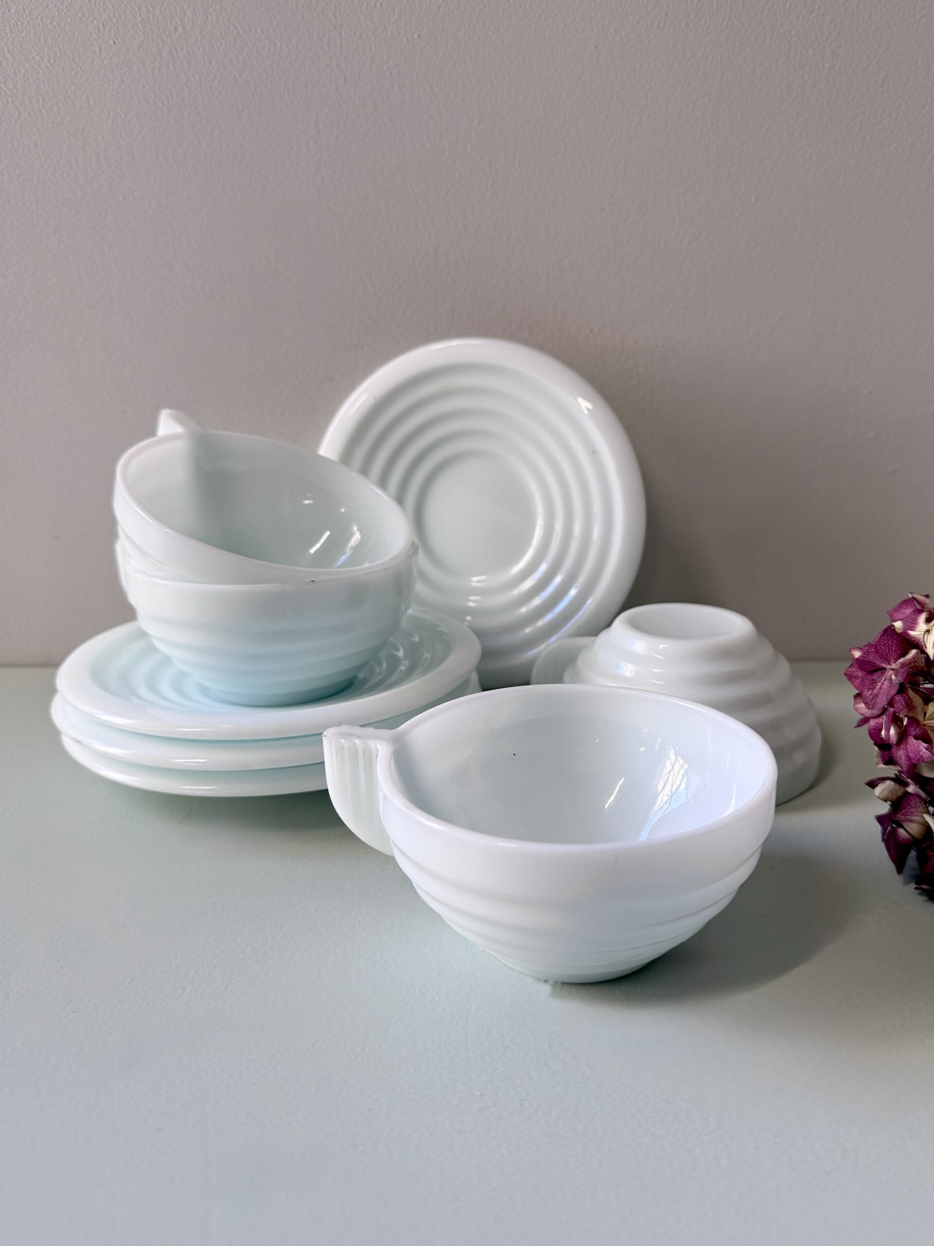 Les anses plates et striées s’intègrent naturellement aux lignes des tasses et assurent une bonne prise en main. L’opaline offre une teinte blanche avec de légères variations bleutées selon la lumière, donnant de la profondeur à l’ensemble sans motif superflu.