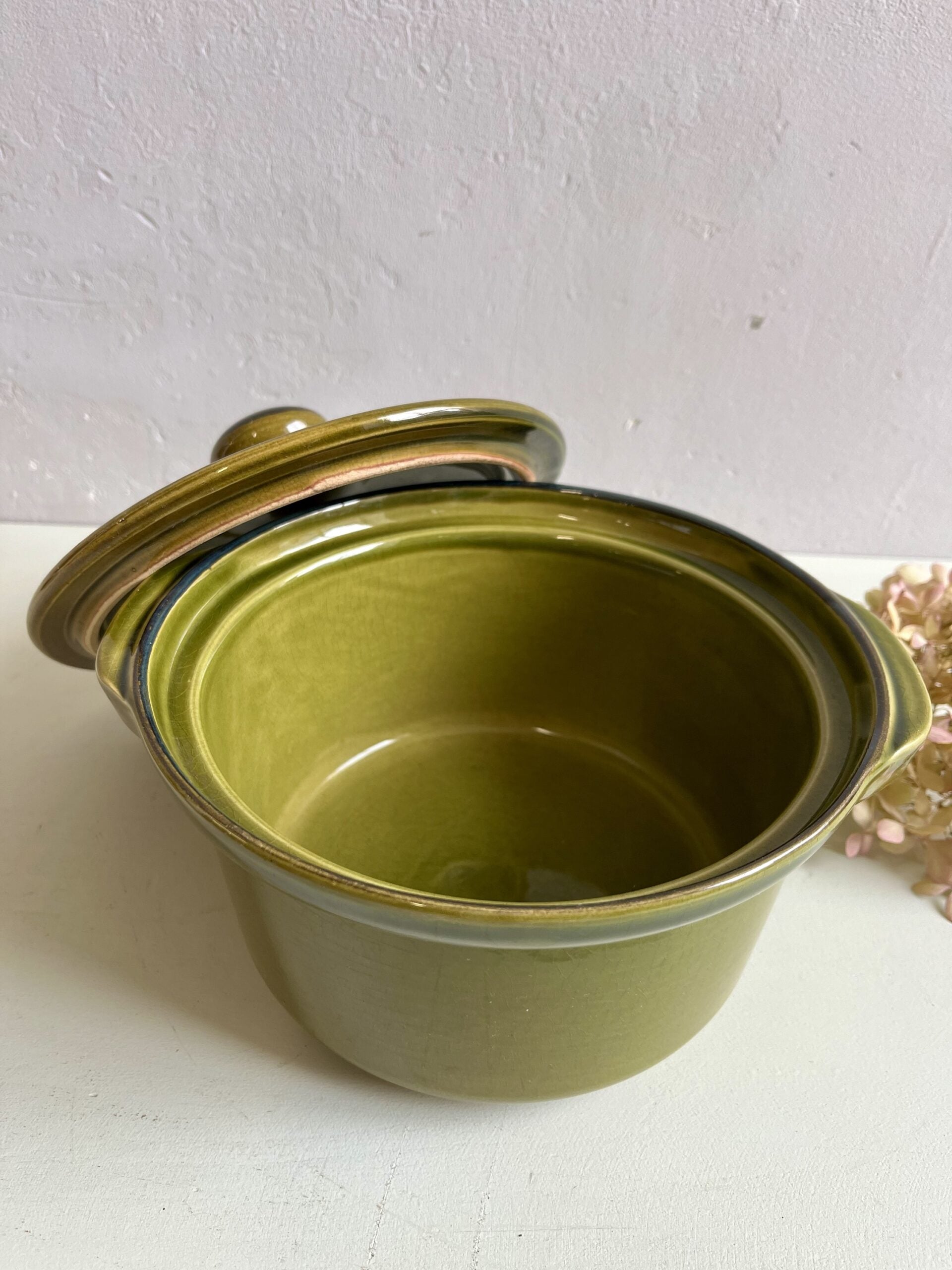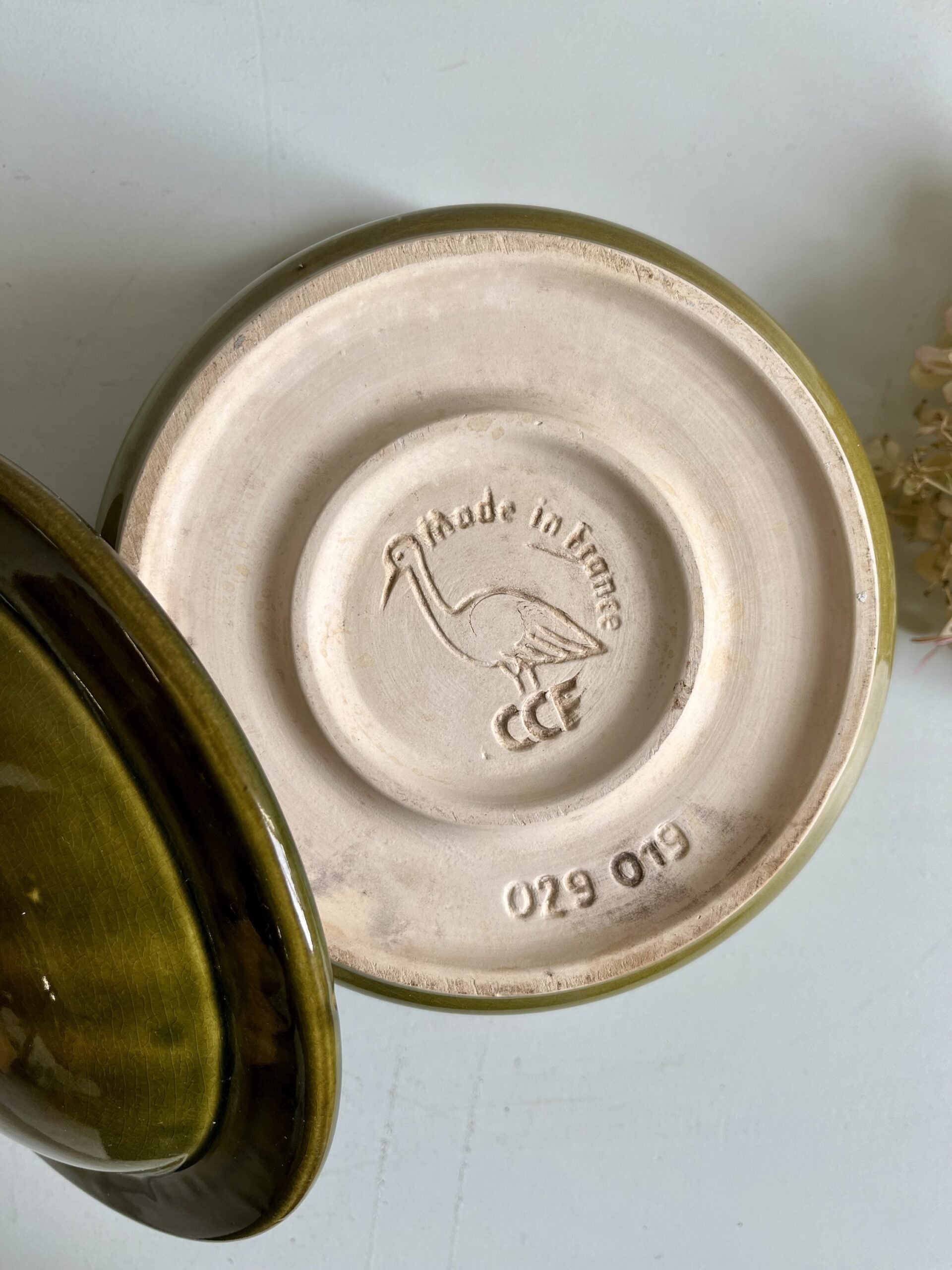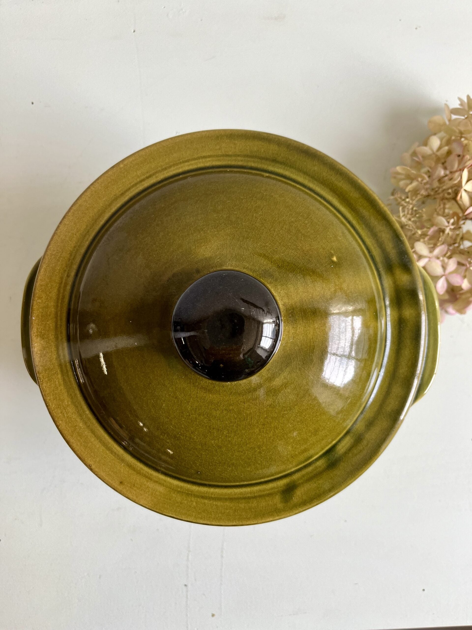 Terrine en grès vernissé vintage de couleur vert olive, fabriquée en France. Pièce ancienne idéale pour présenter un plat, une salade ou un dessert sur une table conviviale.