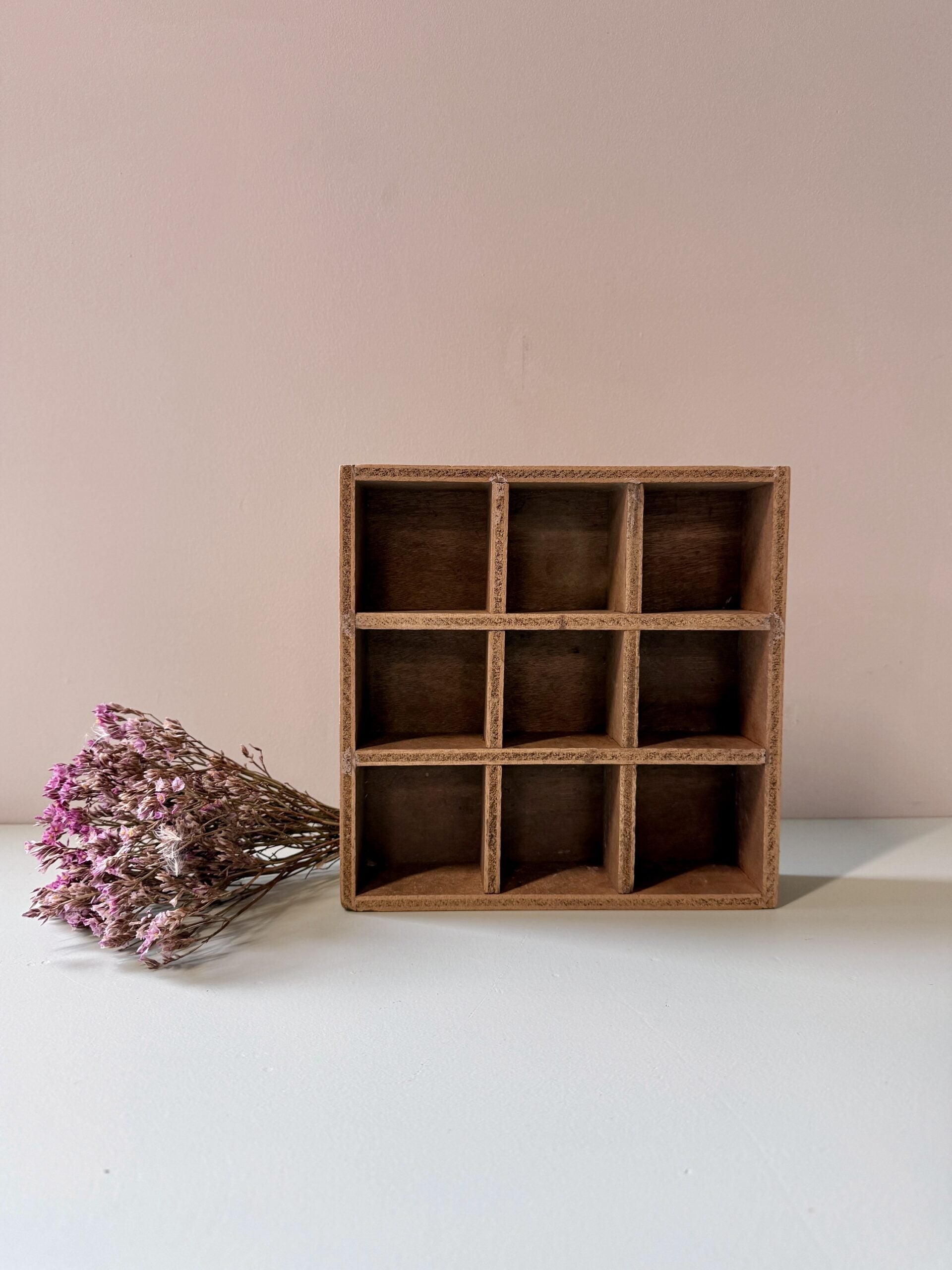 Petit casier ancien en bois, composé de neuf compartiments carrés, à l’allure sobre et pratique. Un objet pensé à l’origine pour organiser, qui trouve aujourd’hui facilement sa place dans une déco du quotidien.Son format compact permet de l’utiliser aussi bien posé sur une étagère que sur un bureau ou une coiffeuse. Idéal pour ranger des bijoux, petites trouvailles, accessoires ou objets précieux qu’on aime garder à portée de main, sans les entasser.
