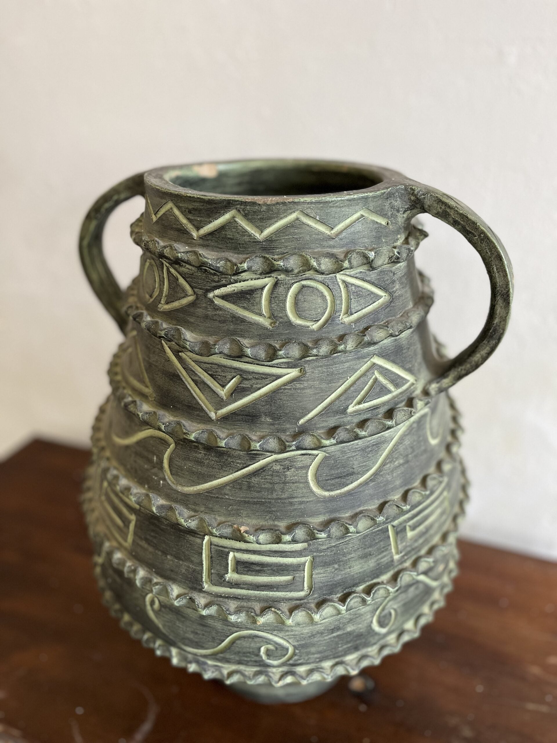 Joli et grand vase style ethnique en terre cuite avec motifs et deux anses.