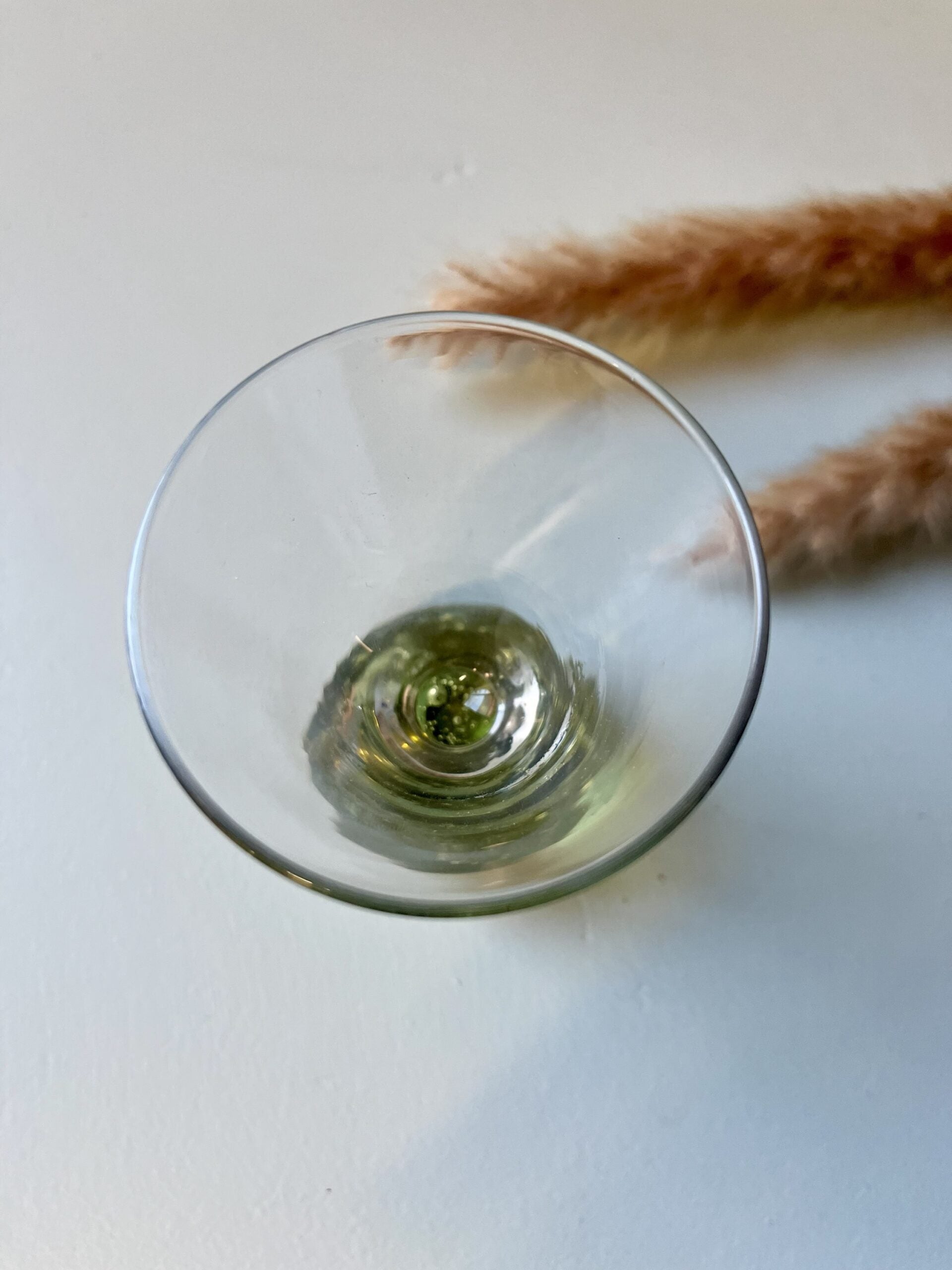 Verres à liqueur au style typiquement vintage, caractéristiques des arts de la table des années 70. Leur forme conique associée à un pied boule en verre coloré, parsemé de bulles emprisonnées dans la matière, évoque immédiatement les créations anciennes de cette période, où la couleur et le verre soufflé avaient toute leur place sur les tables.Chaque verre présente une teinte différente, dans des tons profonds et chaleureux, rappelant les intérieurs et les vaisseliers d’autrefois. Ces verres anciens étaient souvent utilisés en fin de repas, pour servir une liqueur ou un digestif, dans une ambiance conviviale et sans chichi.
